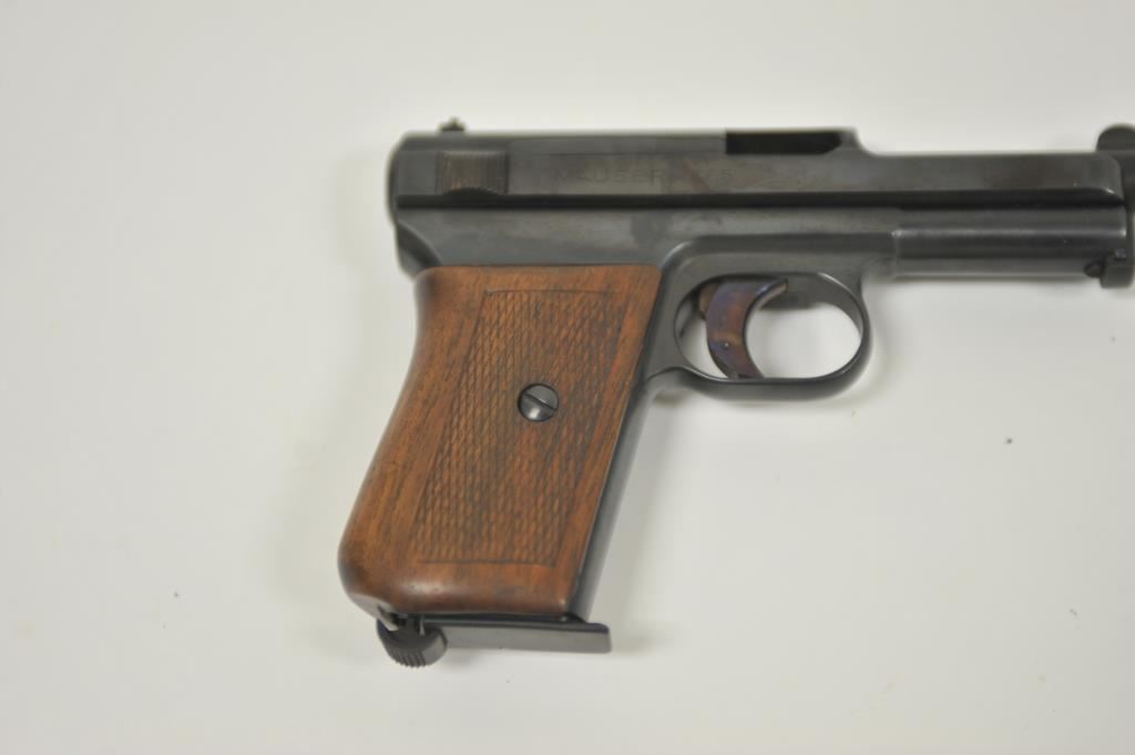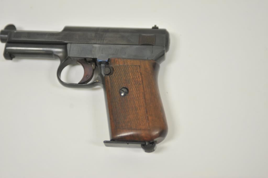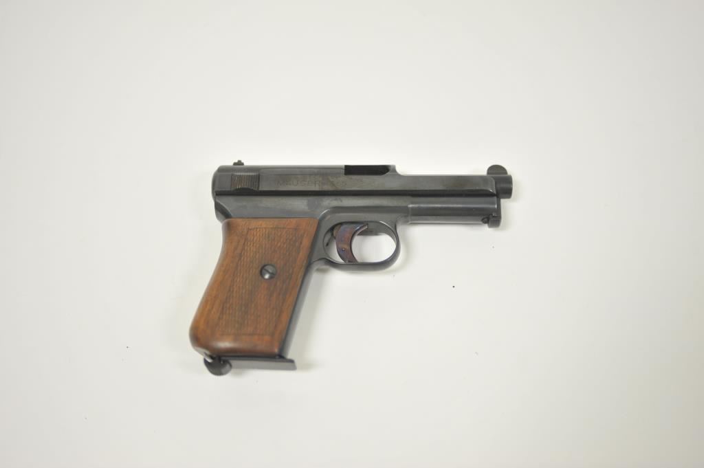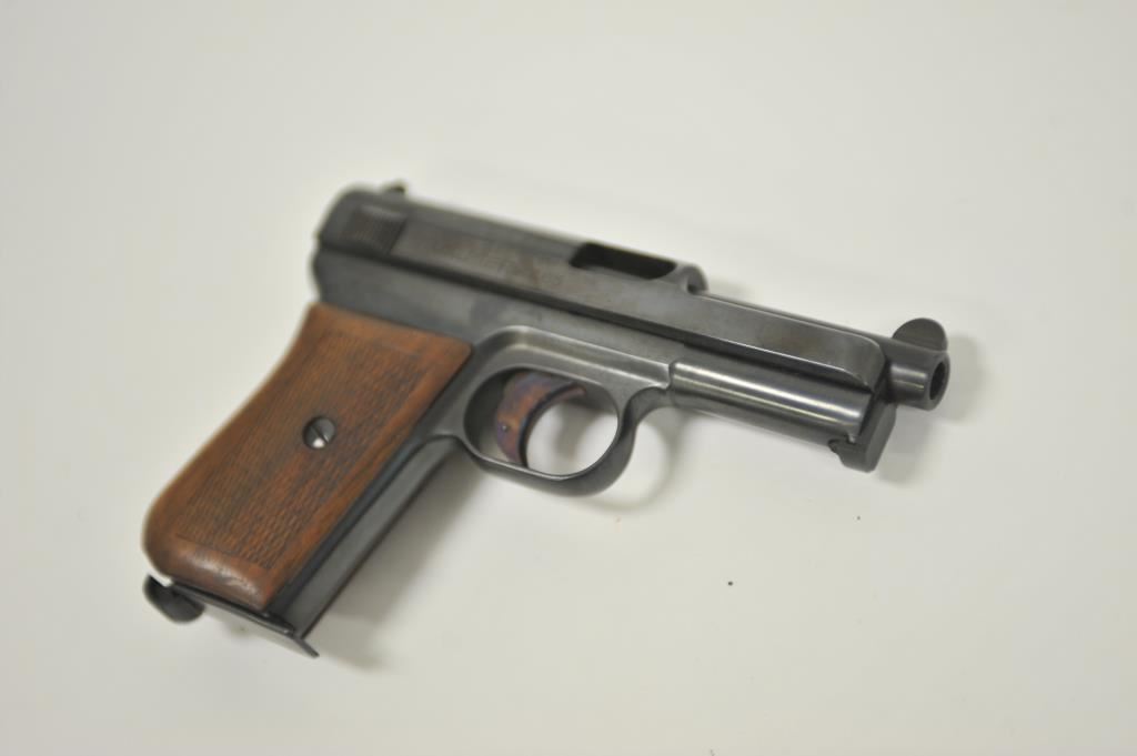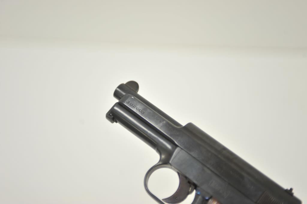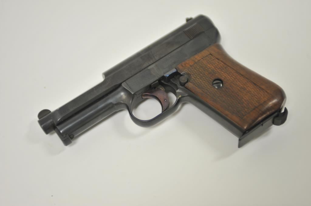 Mauser Model 1934 semi-automatic pistol, 7.65mm caliber, 3.25” barrel, blued finish, checkered wood grips, S/N 382603 (with matching S/N on magazine); overall good condition with good bore, crisp action, majority of finish remaining, sharp markings and good grips. (C&R/PPT). Est.: $200-$400.
