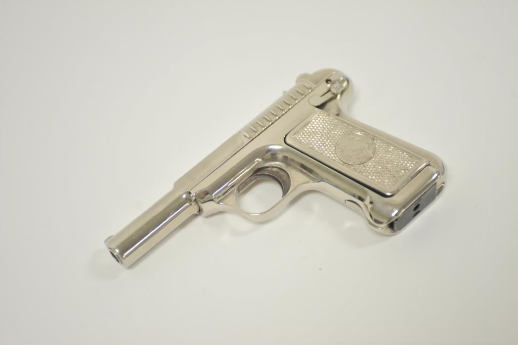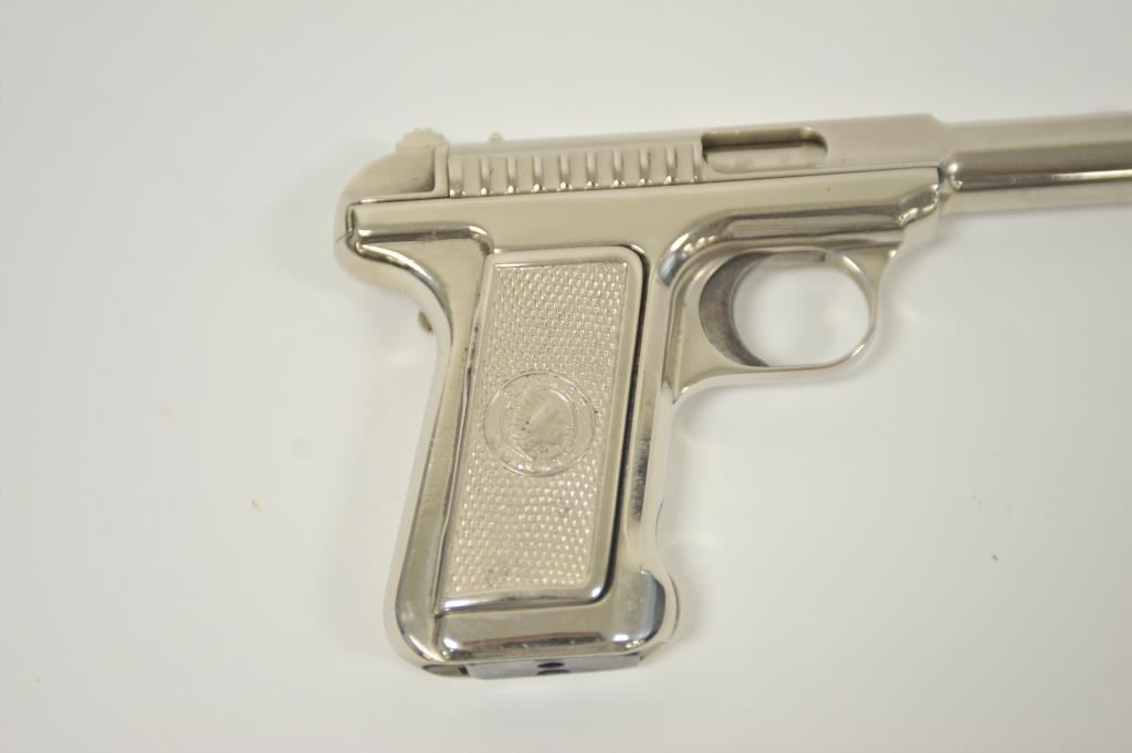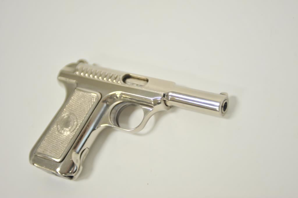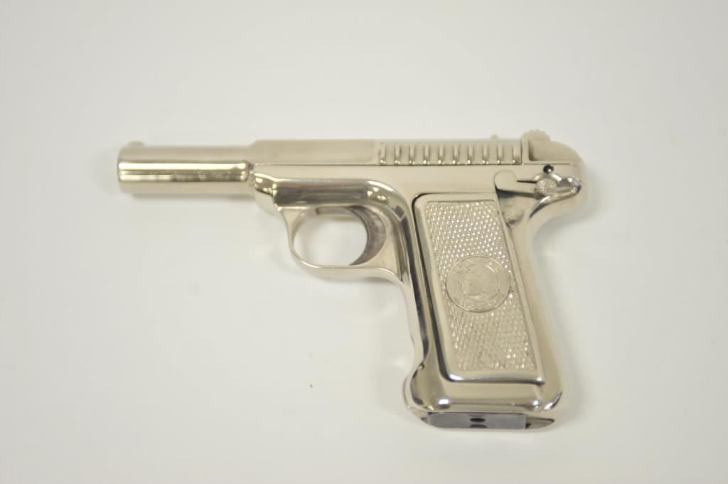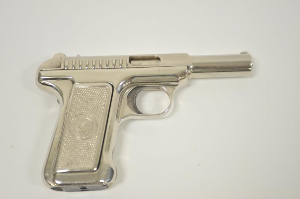 Savage pocket semi-automatic pistol, .32 caliber, 3.75” barrel, old re-nickel finish, checkered metal Indian head grips, no visible S/N; overall fair + condition as refinished; fair bore, good action, fair markings and grips. (C&R/PPT). Est.: $150-$300.