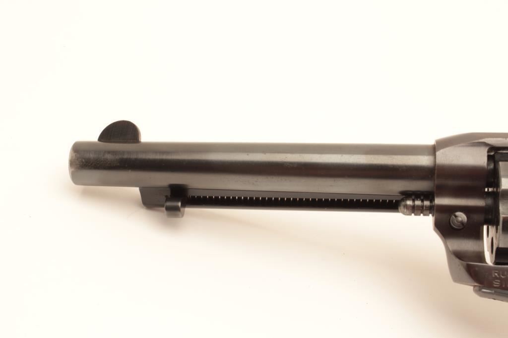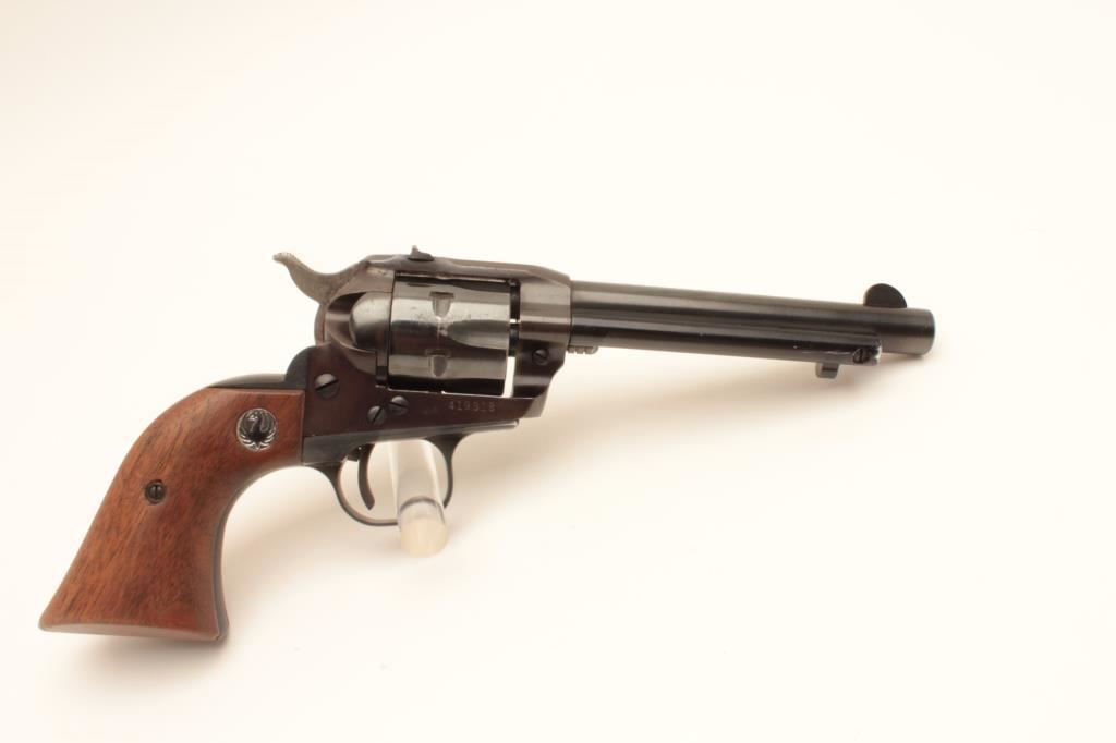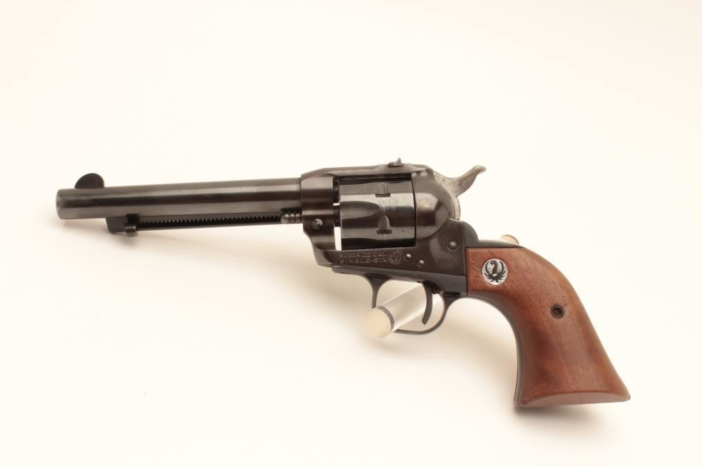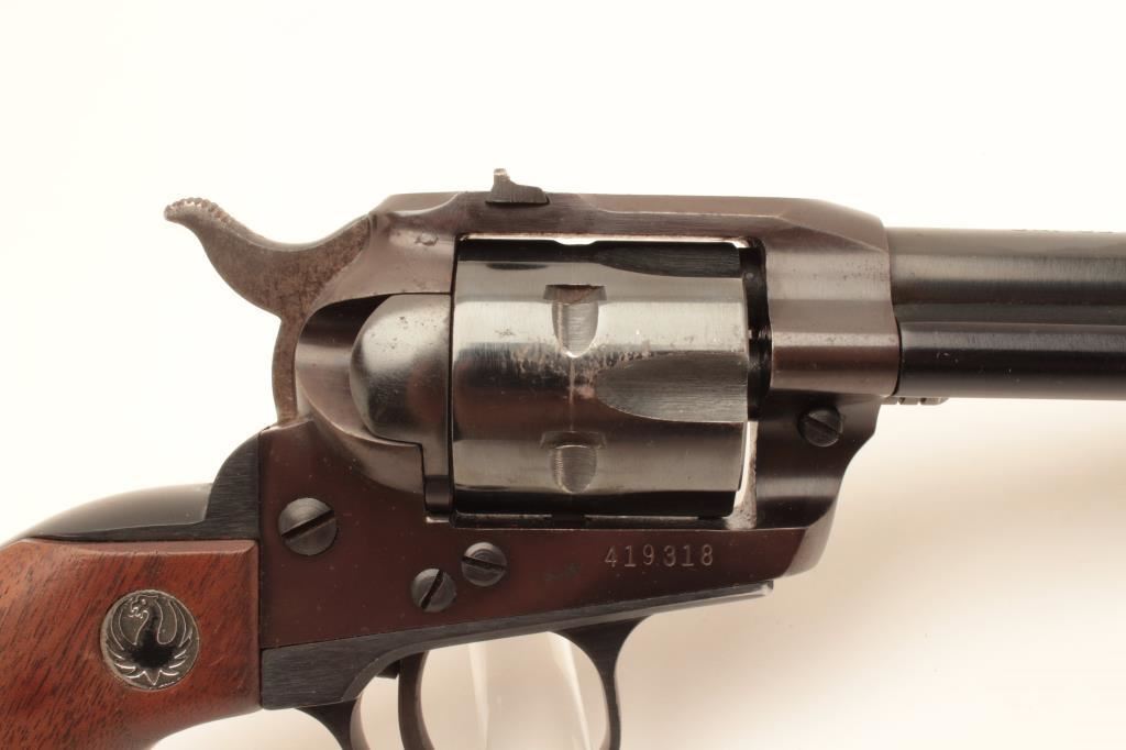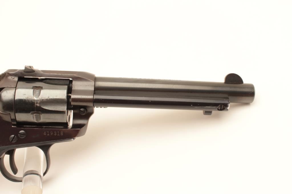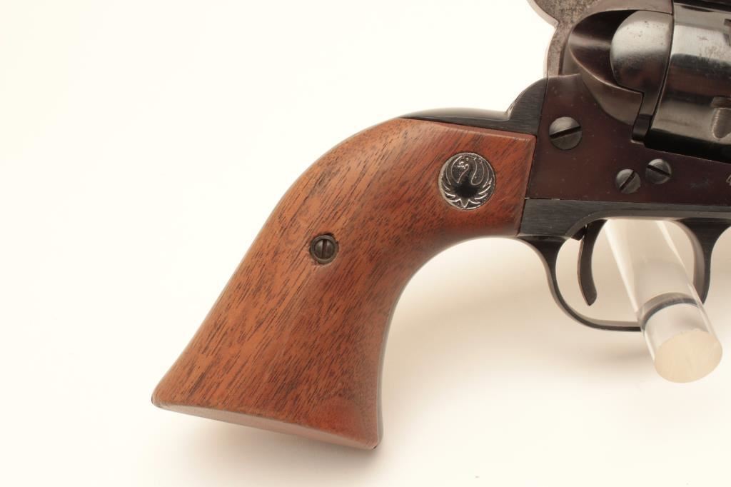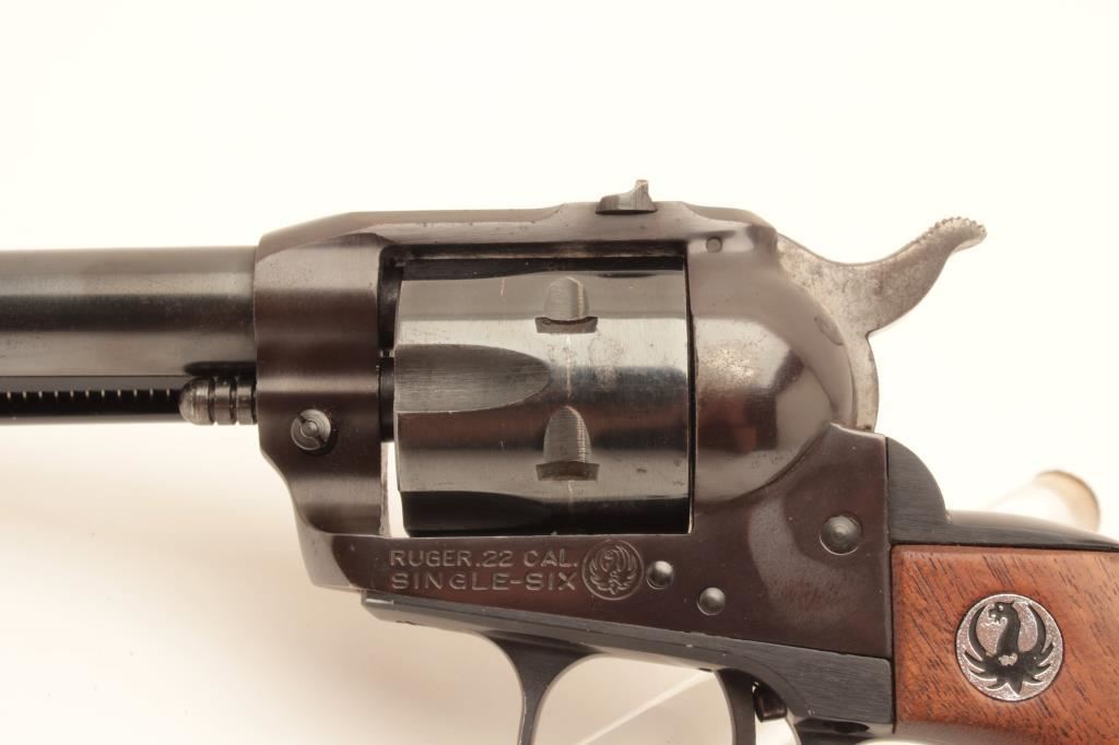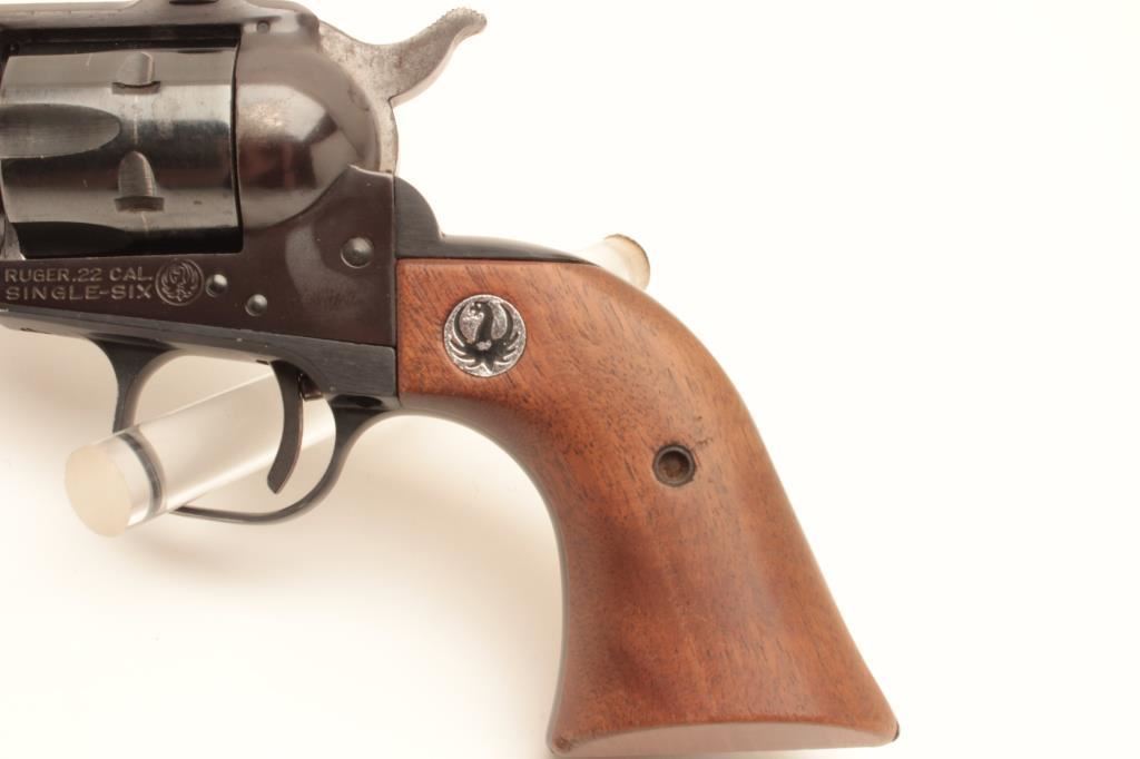 Ruger Single Six Model revolver, .22 caliber, 5.5” barrel, blued finish, smooth wood medallion grips, S/N 419318, with extra cylinder and extra pair of checkered wood grips; overall very good condition with a crisp action, sharp markings, majority of original finish remaining, very good grips and good bore; accompanied by a cardboard Ruger box. (Modern/PPT). Est.: $150-$300.