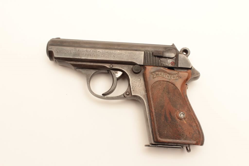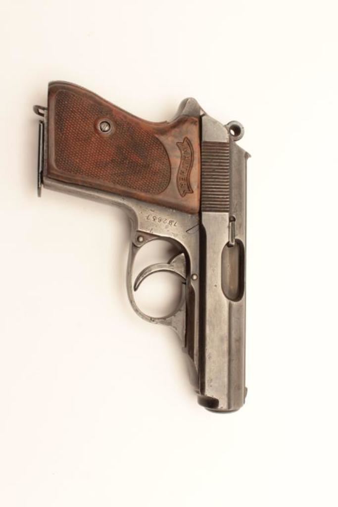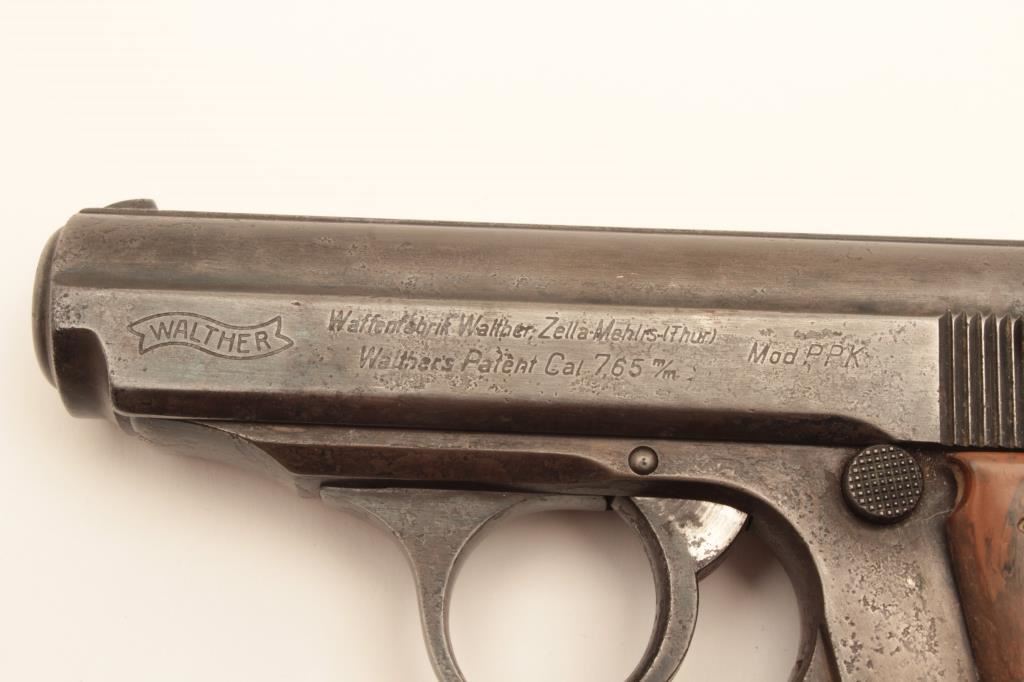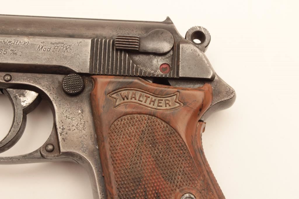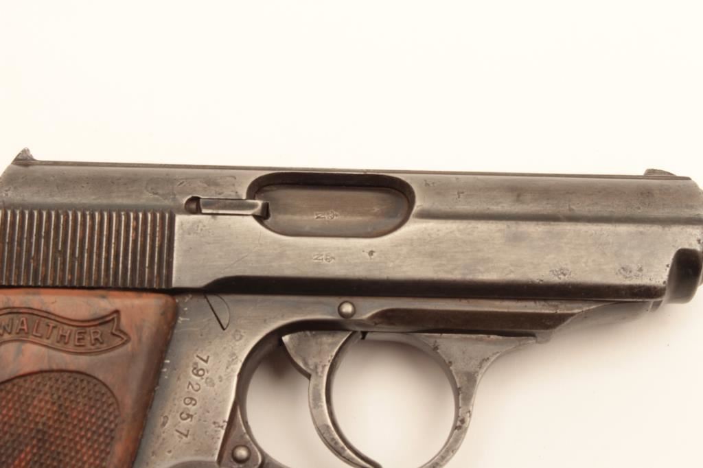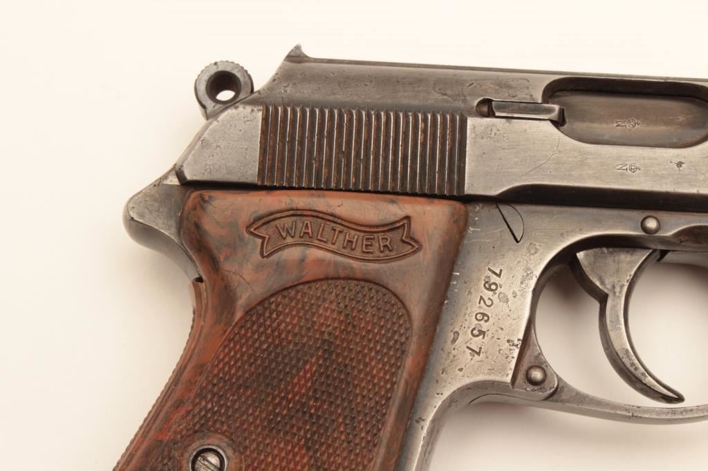Pre-war Walther Model PPK semi-automatic pistol, 7.65mm caliber, 3.25ā barrel, blued finish, checkered brown plastic grips, S/N 792657, crown āNā marked, somewhat rough condition to metal surfaces with scattered areas of light pitting and some cleaning; good bore and working action; grips are good overall with an old sliver loss at the top of the left grip. (C&R/PPT). Est.: $250-$500.