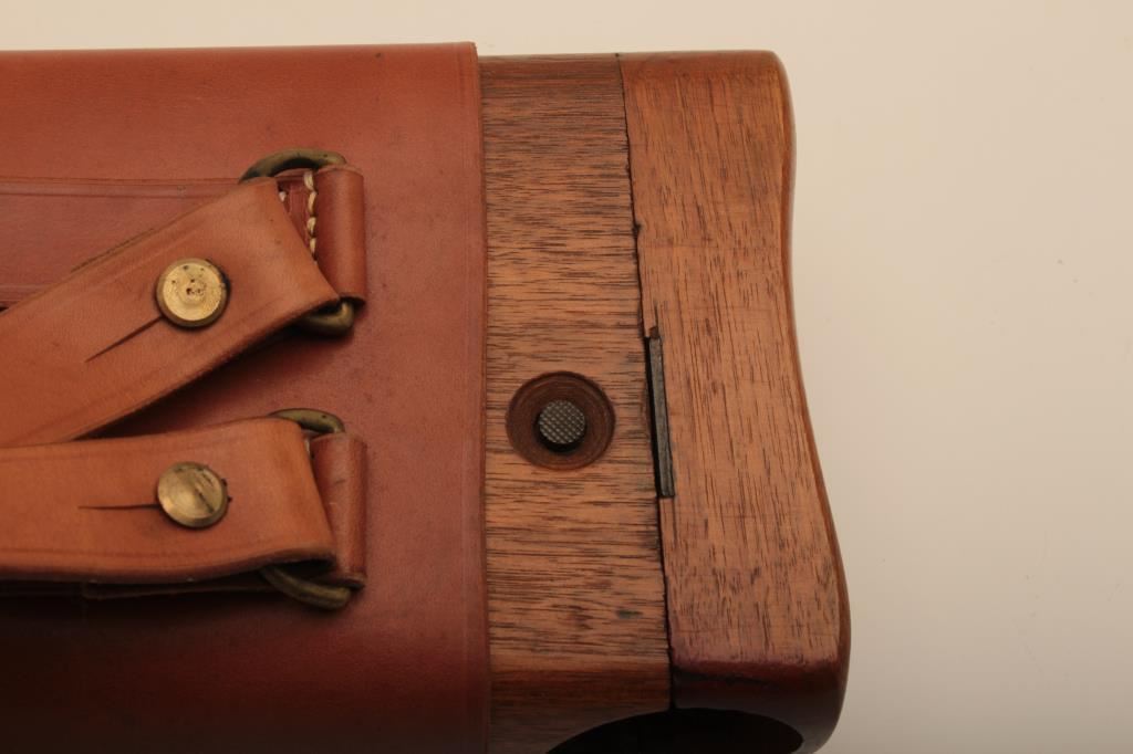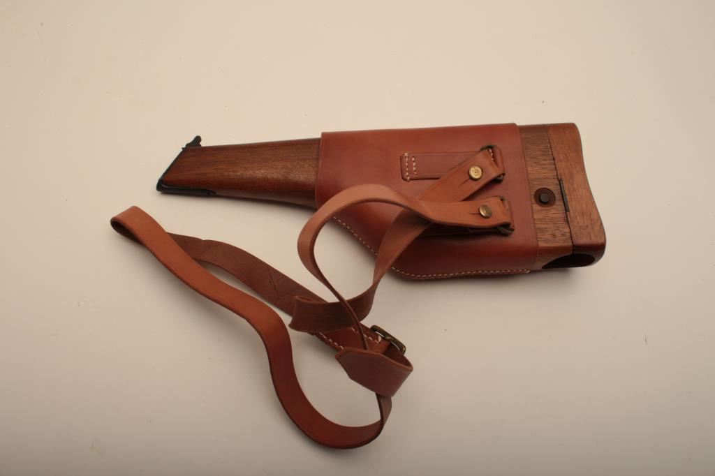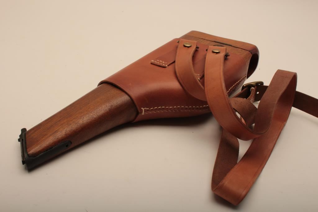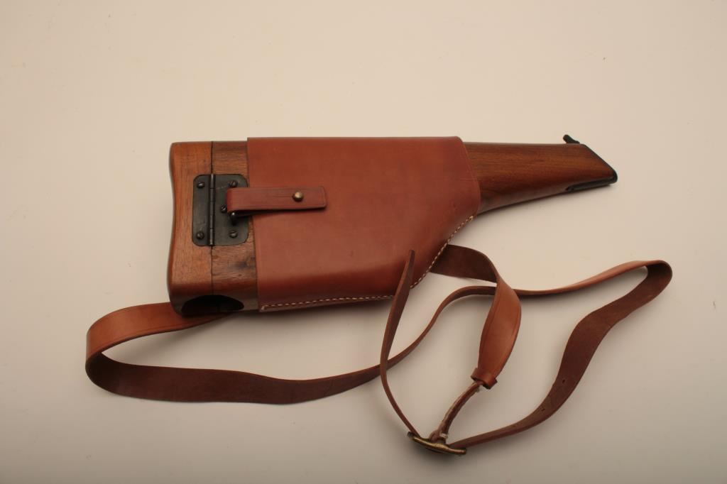Extra large wooden shoulder stock/holster with leather carrier and strap for a Chinese Shan Sei Broomhandle Mauser .45 caliber semi-automatic pistol; overall very good to fine condition. (Note: see lot 877 for companion gun fitting this stock/holster). Est.: $300-$600.