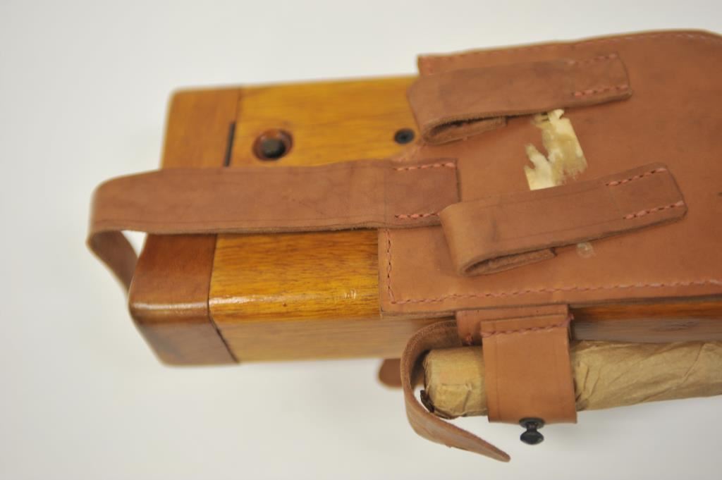 Reproduction extra large China broomhandle wood shoulder stock/holster with leather carrier and cleaning rod; good condition overall. Est.: $150-$300.