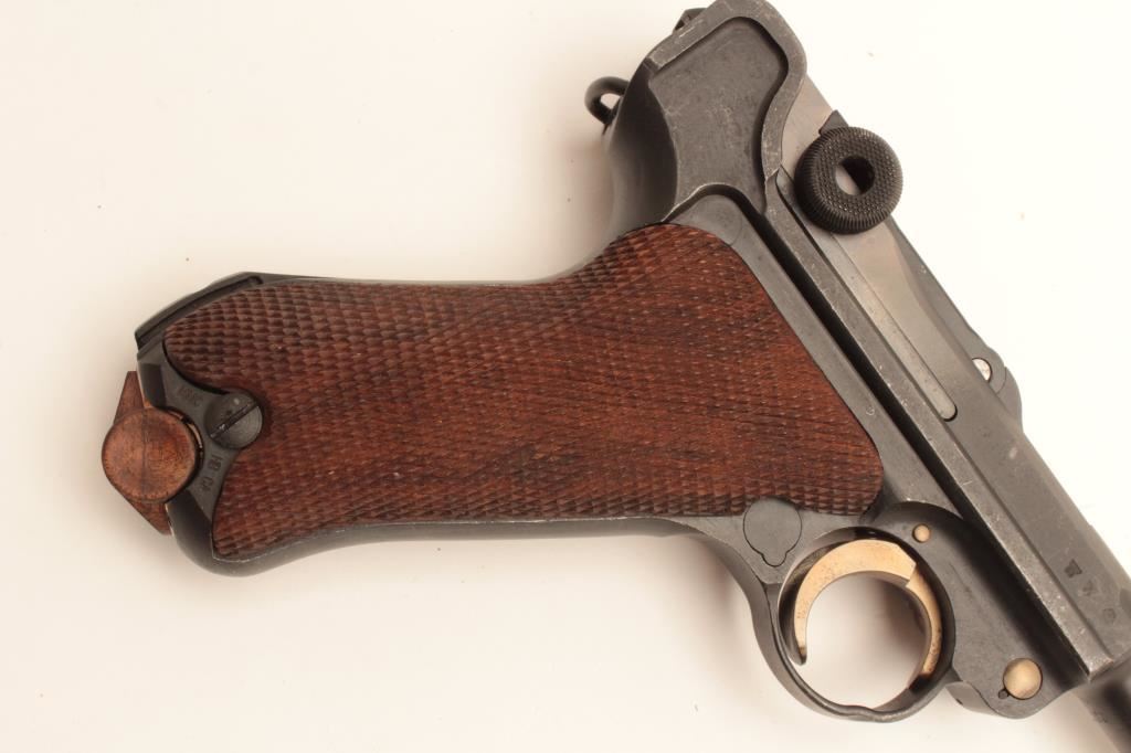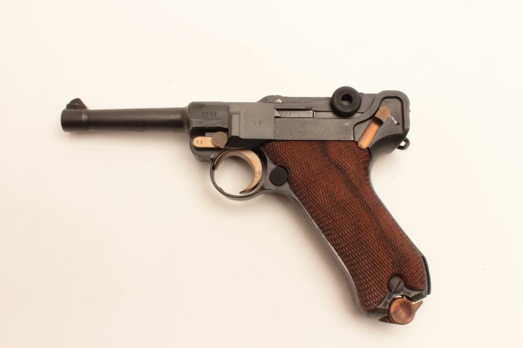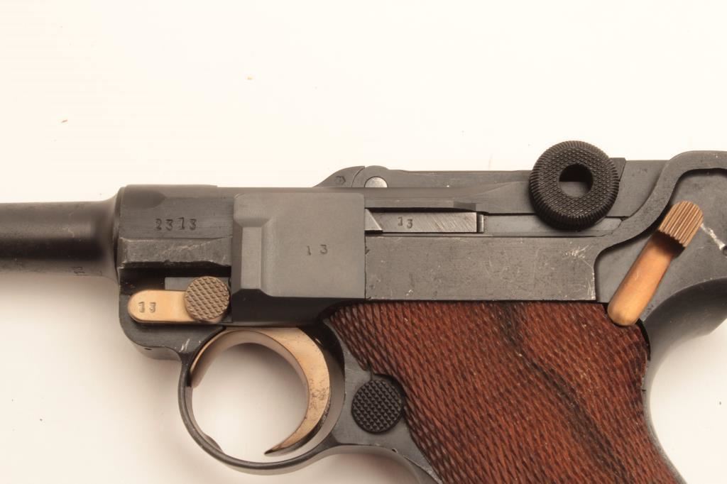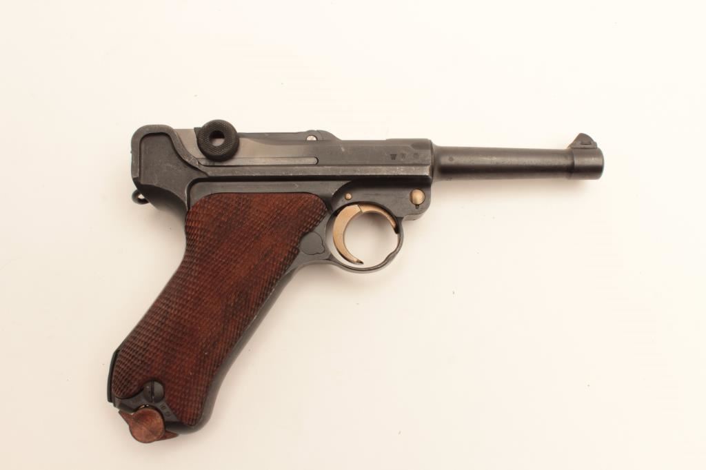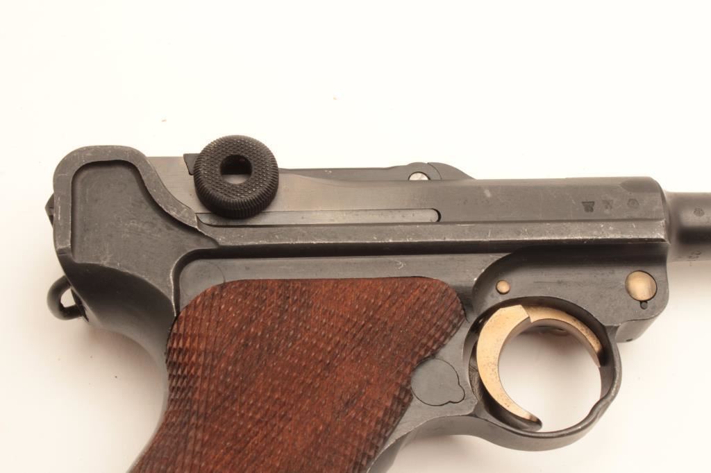 Georg Luger presentation grade P-08 semi-automatic pistol, Mauser manufacture 1938 re-worked and cased in wood presentation case with plaque on lid; 9mm caliber, 4” barrel, black re-finish, checkered wood grips, S/N 2313; good bore, crisp action, good markings and very good grips. (C&R/PPT). Est.: $800-$1,600.