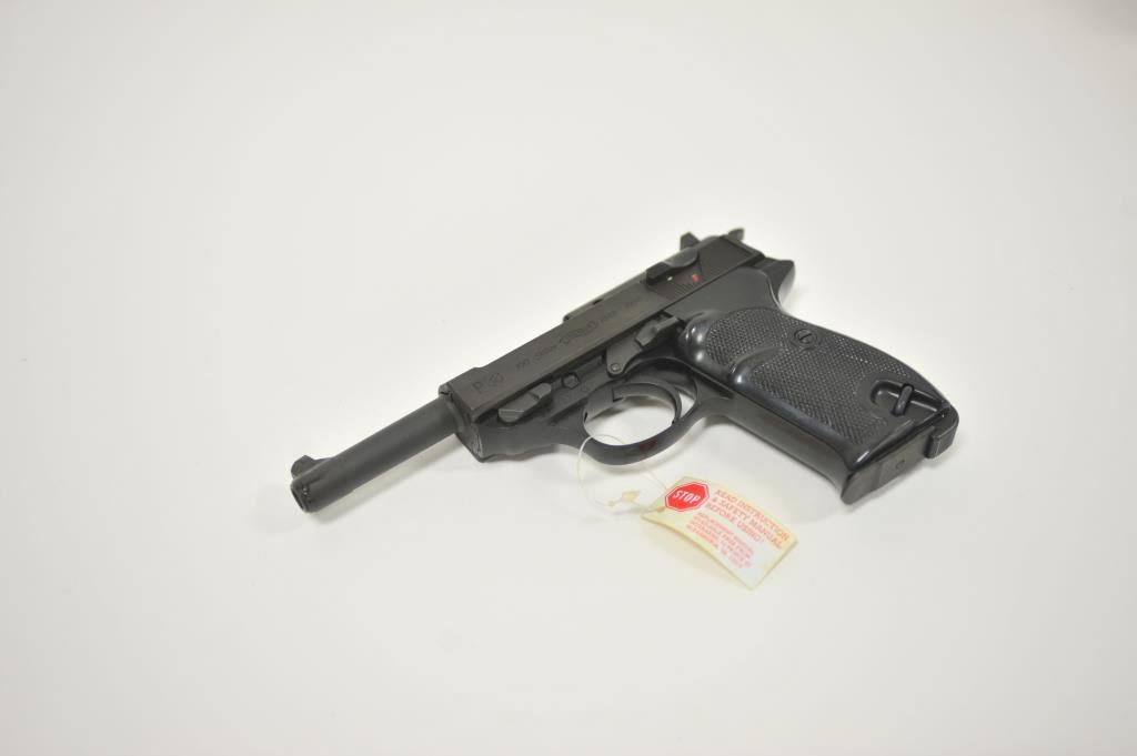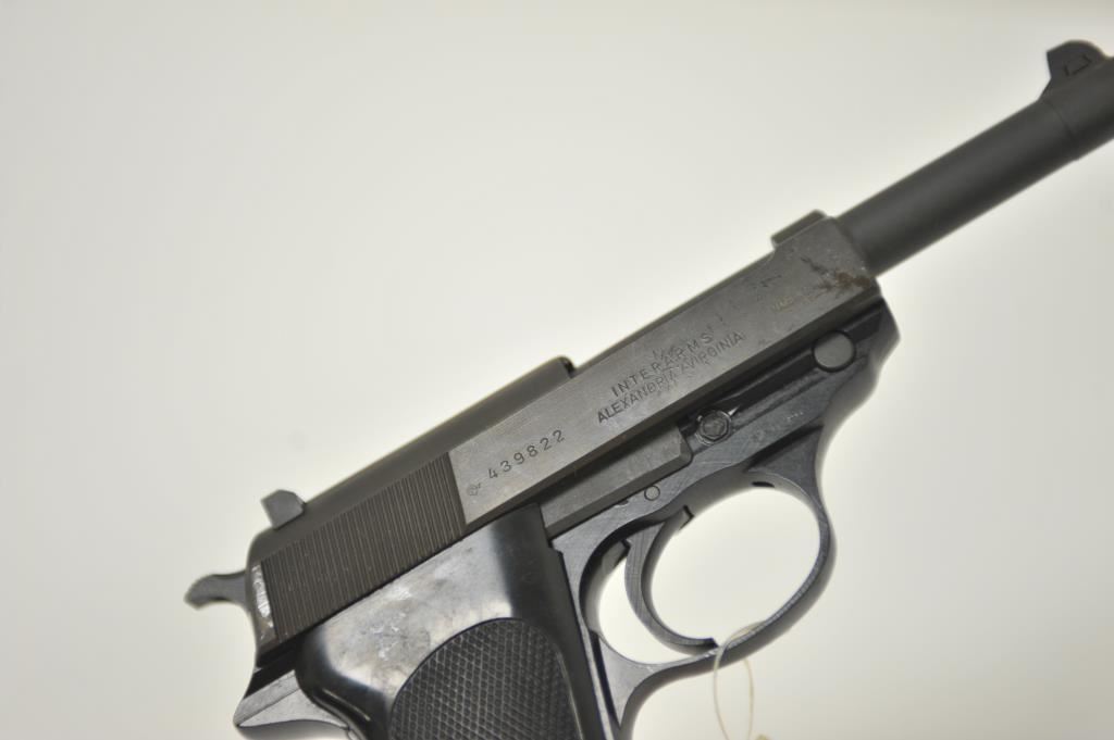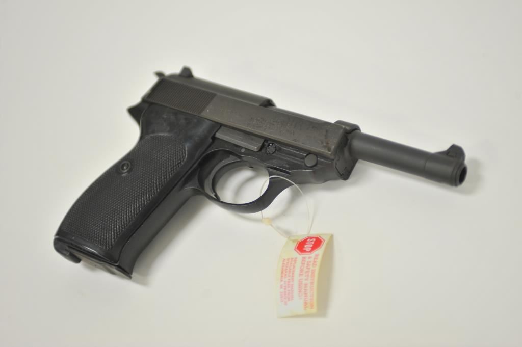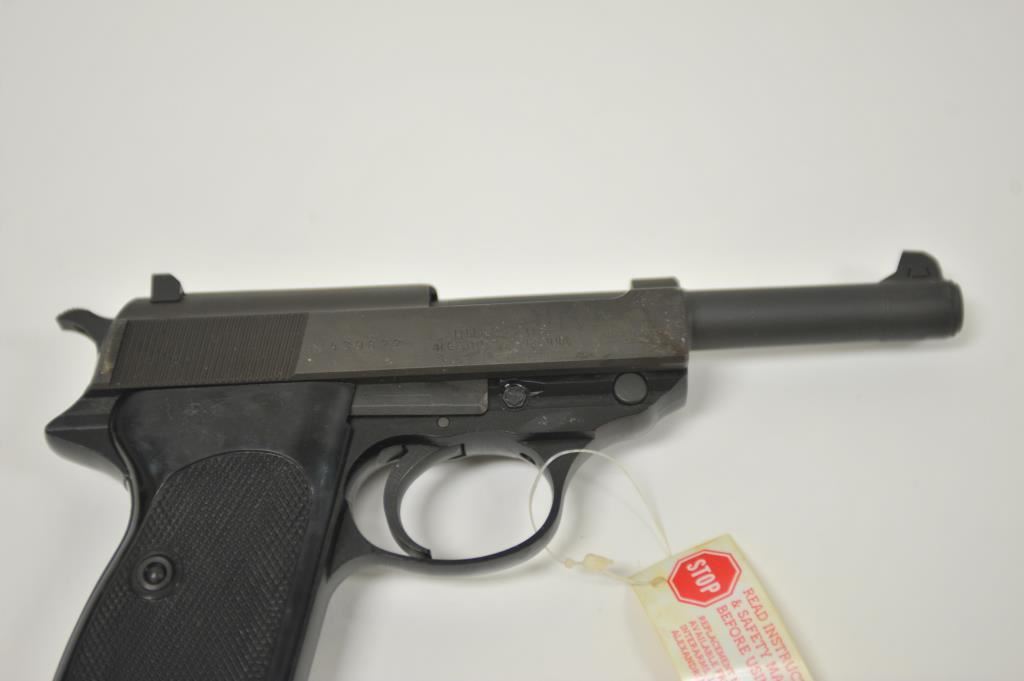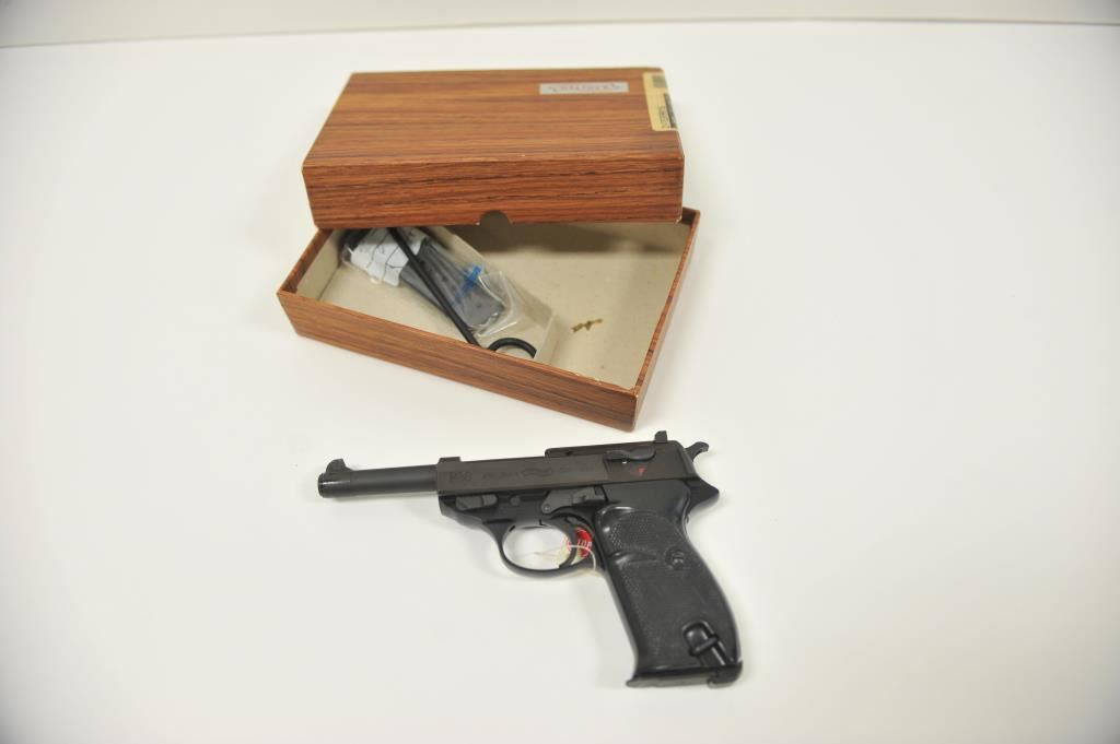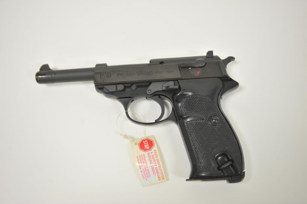 German-made Walther P-38 100 year commemorative (1886-1986) semi-automatic pistol (also marked Interarms, Alexandria, Virginia), 9mm caliber, 5” barrel, mat black finish, checkered black plastic grips, S/N 439822; like new in wood grained cardboard two piece box (end label numbered to this gun) with one extra magazine, cleaning rod, instructions and misc. paperwork. (Modern/PPT). Est.: $500-$1,000.