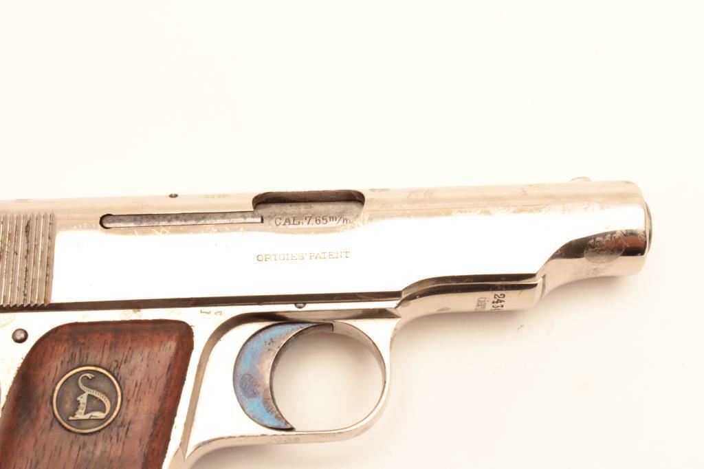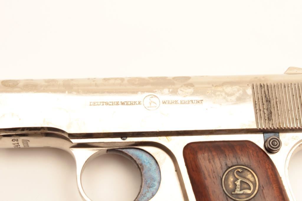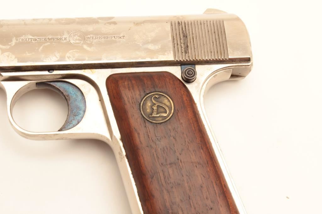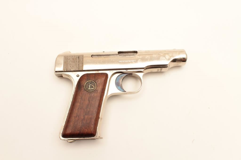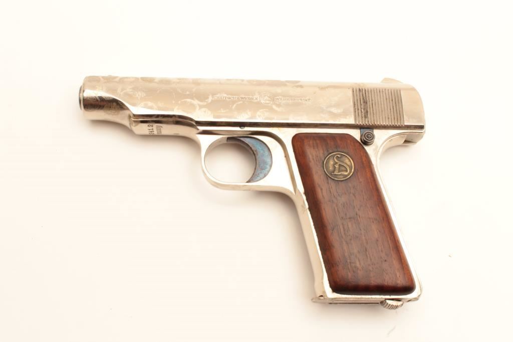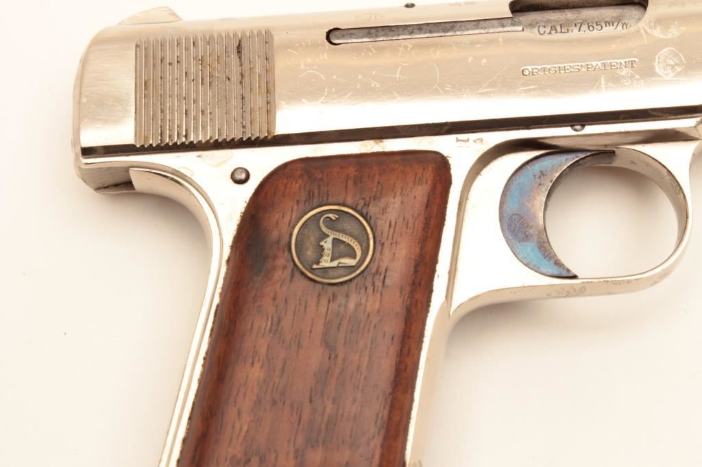 Rare factory nickel finish DWM Ortgies semi-automatic pistol, 7.65mm caliber, 3.25” barrel, wood medallion grips, S/N 243412; overall good condition with majority of finish remaining; surface spotting to finish from what appears to be the gun having at one time been stored with contact to small bubble wrap; bright blue to small parts, crisp action, good markings, good grips and fair to good bore; with two piece cardboard box. (C&R/PPT). Est.: $350-$700.