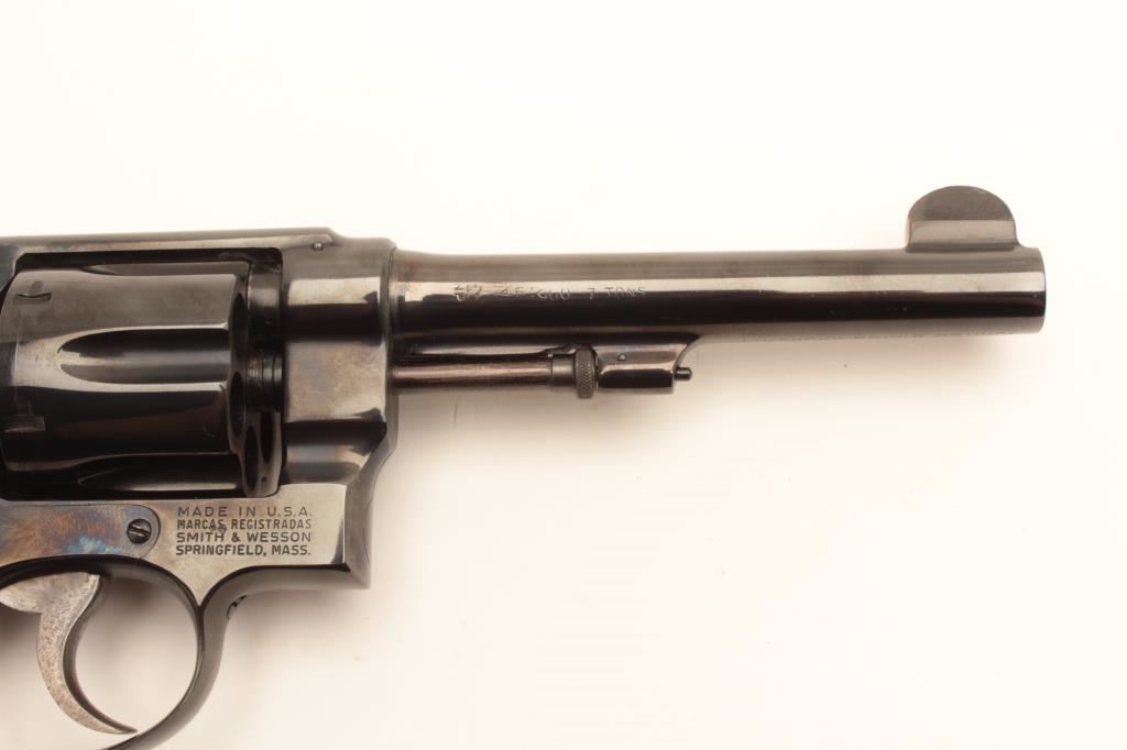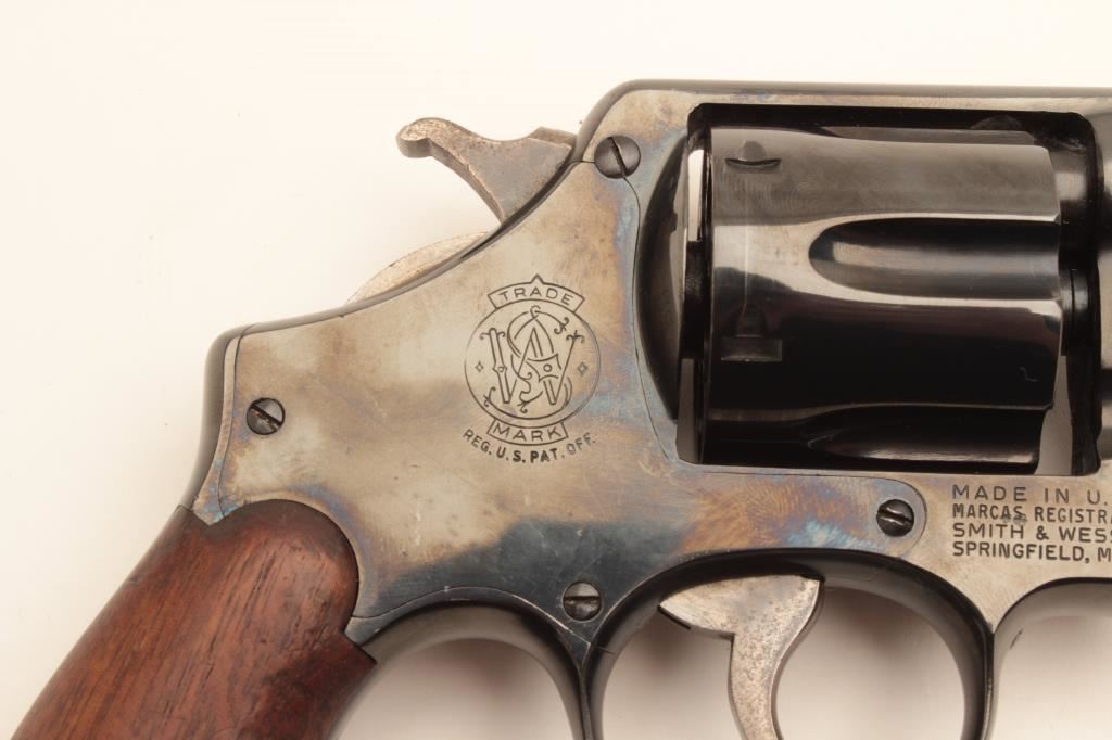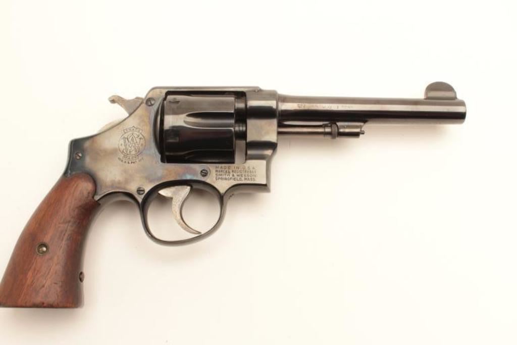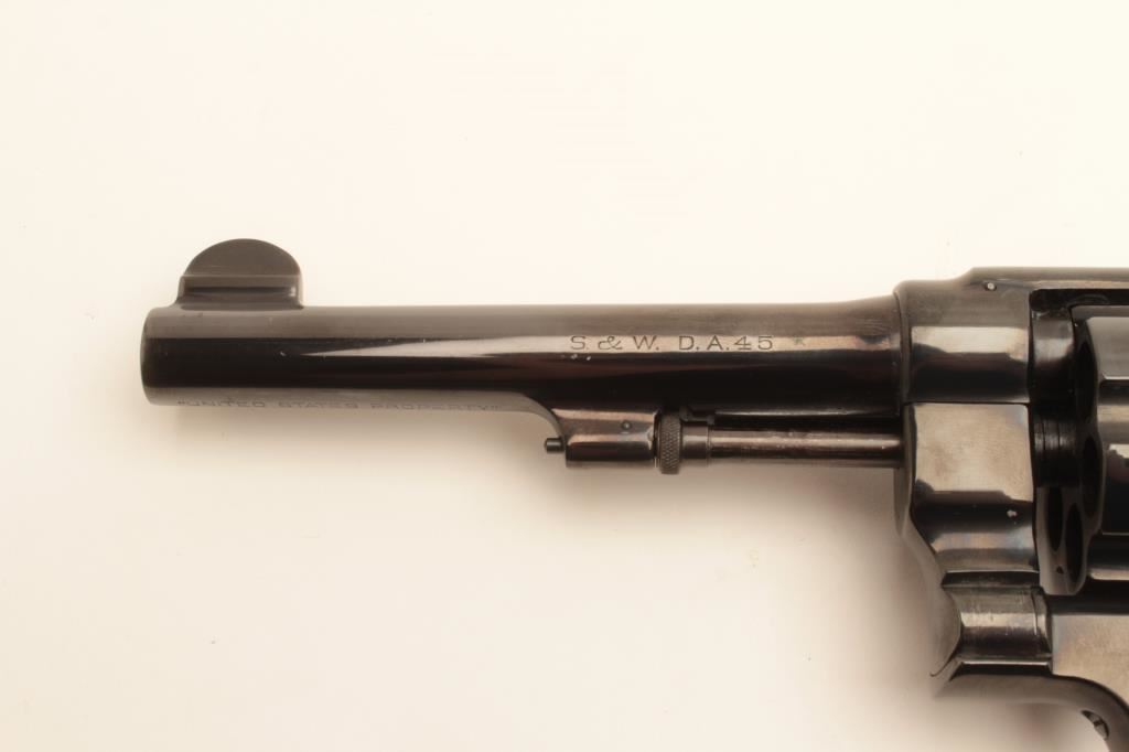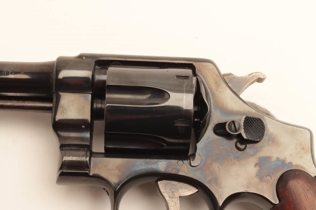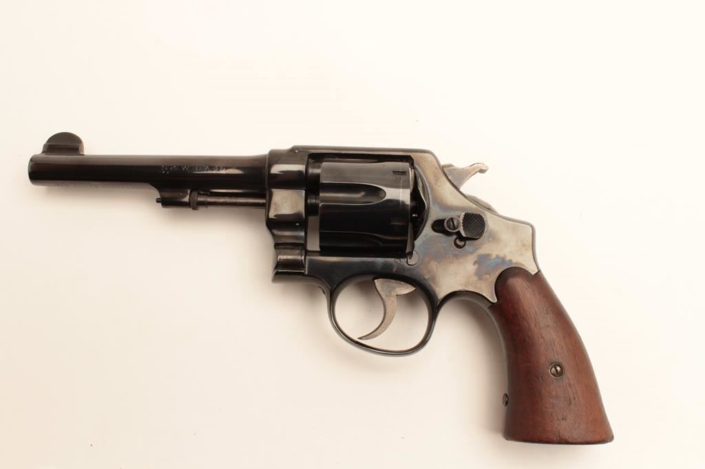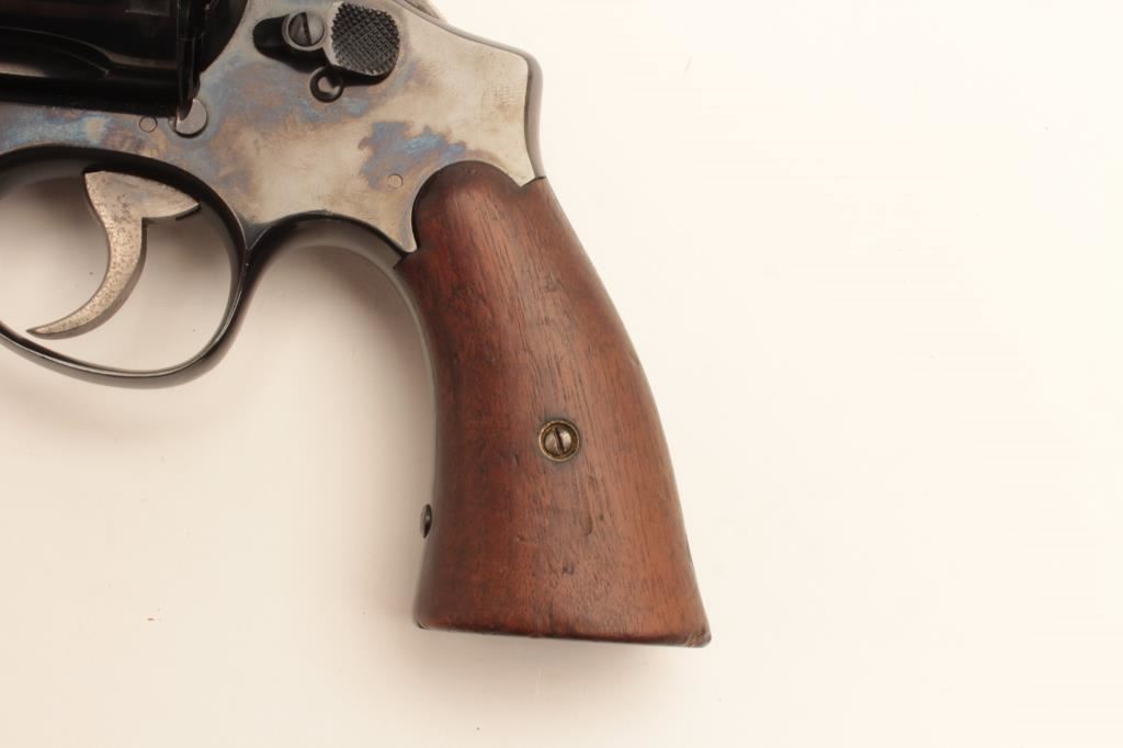Smith & Wesson U.S. Army Model 1917 DA revolver, .45 caliber, 5.5” barrel, old re-blued finish, smooth wood grips, S/N 109315; overall good condition as refinished; good bore, crisp action, good markings and good grips; lanyard ring missing. (C&R/PPT). Est.: $250-$500.