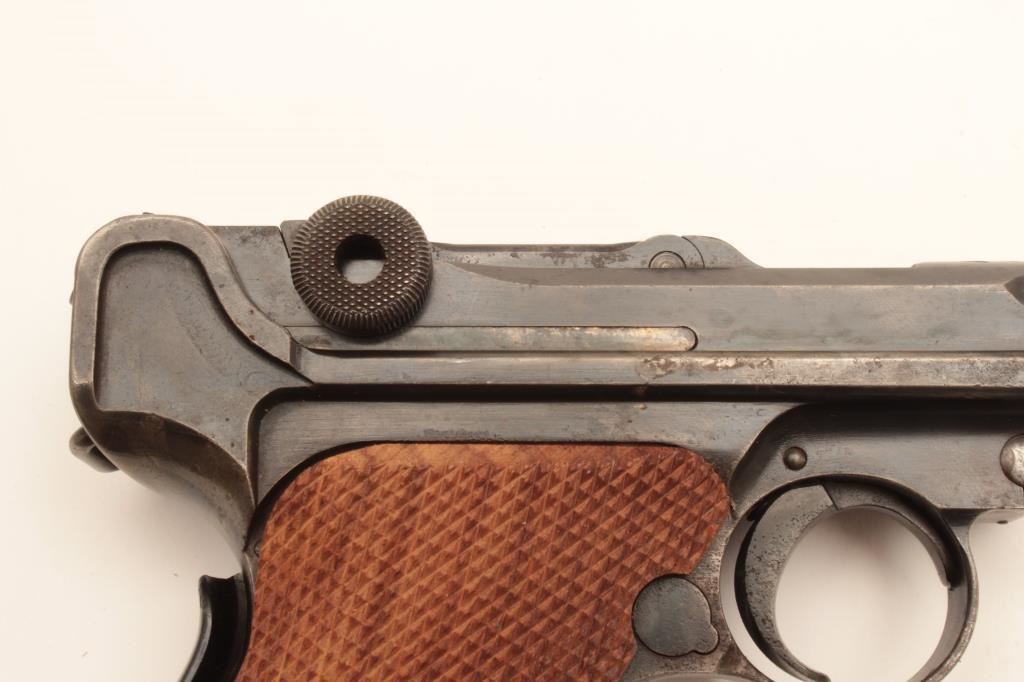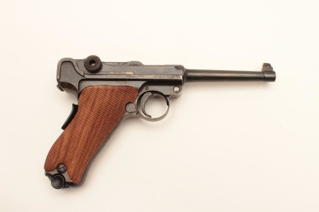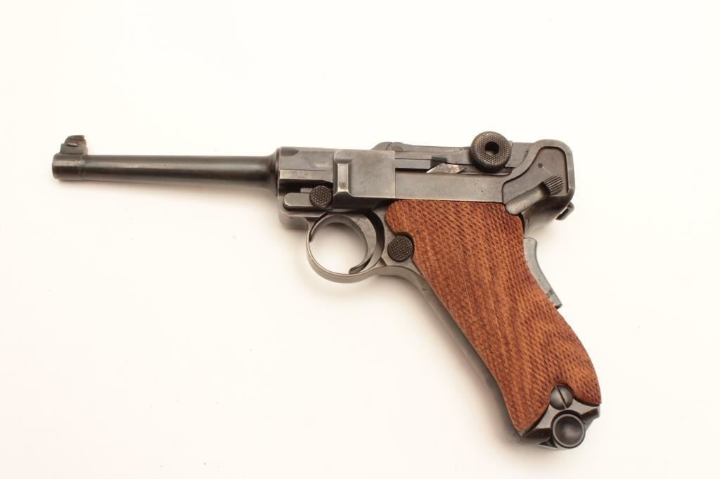 DWM American Eagle Luger semi-automatic pistol, .30 caliber, 4.75” barrel, blued finish, replaced checkered wood grips, S/N 30934; cold blue added to finish, good bore, fair action, good markings and good replacement grips; accompanied by a brown leather flap holster marked “A. Labhart/Sattler/Steckborn”. (C&R/PPT). Est.: $600-$1,200.