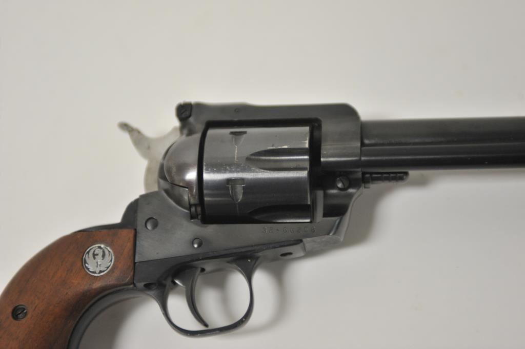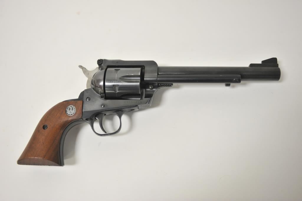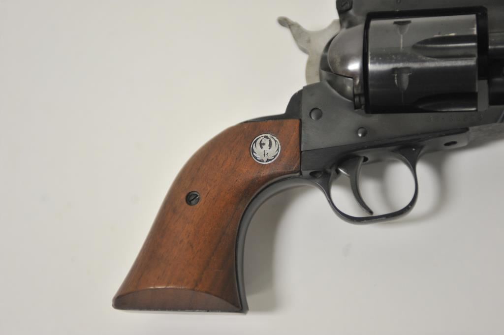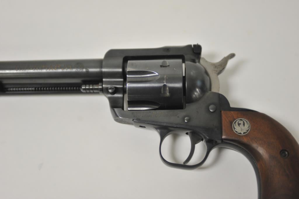 Ruger New Model Blackhawk single action revolver, .357 Magnum caliber, 6.5” barrel, blued finish, smooth wood medallion grips, S/N 32-66258; overall very good + condition with some holster wear to muzzle, very good to near fine bore, crisp action, sharp markings and very good + grips. (Modern/PPT). Est.: $250-$500.