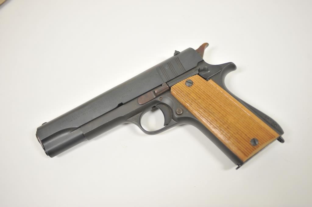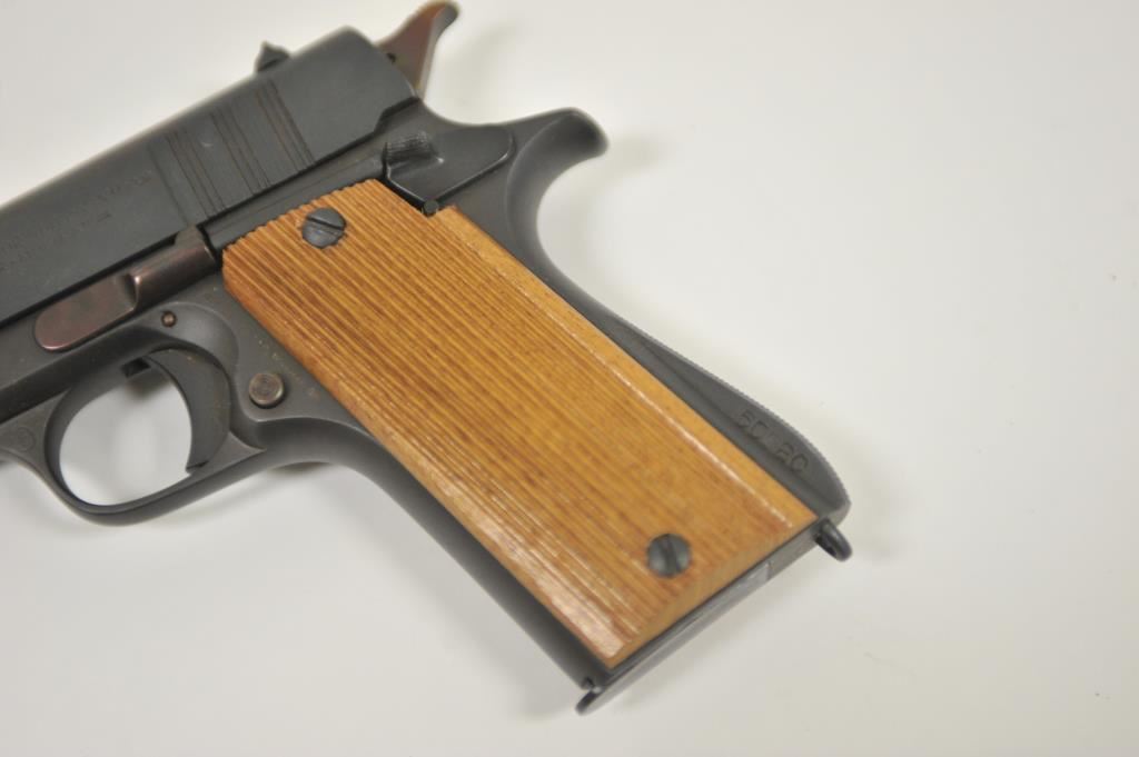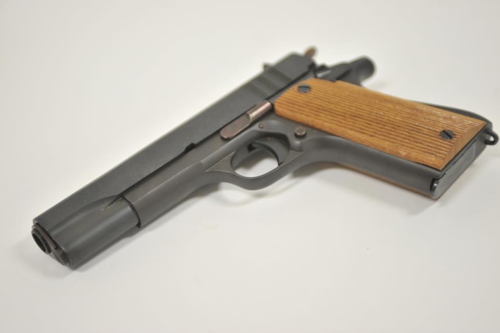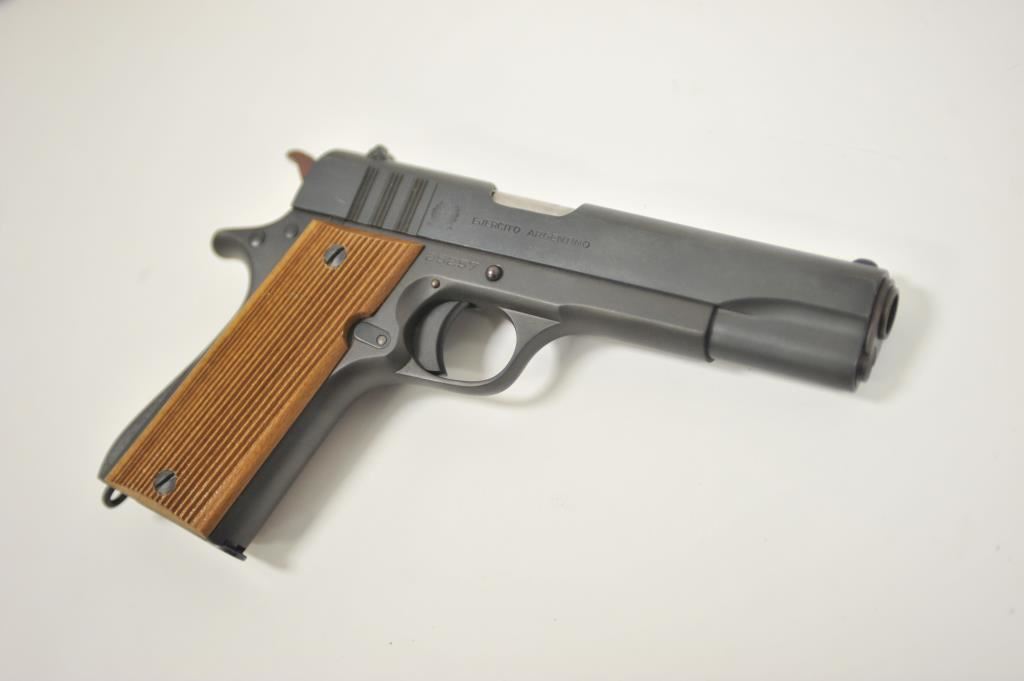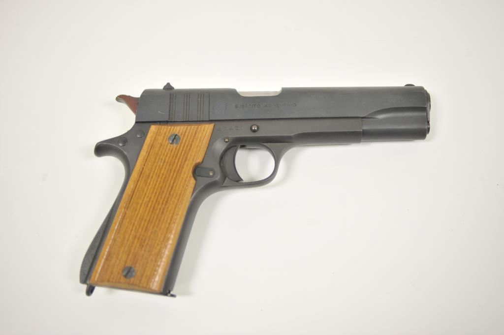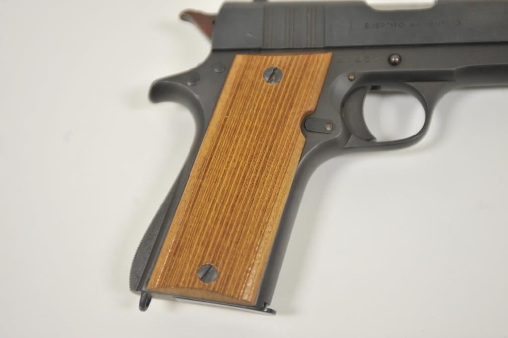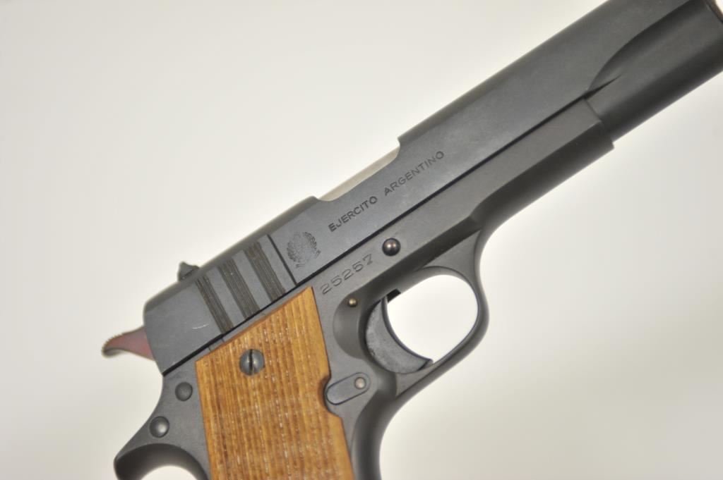 Ejecito Argentino Ballester Molina Model 1911-A1 semi-automatic pistol, 11.25mm caliber, 5” barrel, mat black finish, wood grips, S/N 25257; overall very good to near fine condition as rebuilt; near fine bore, crisp action, very good markings and near fine grips; with instructions sheet and cardboard box. (Modern/PPT). Est.: $350-$700.