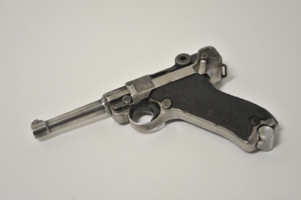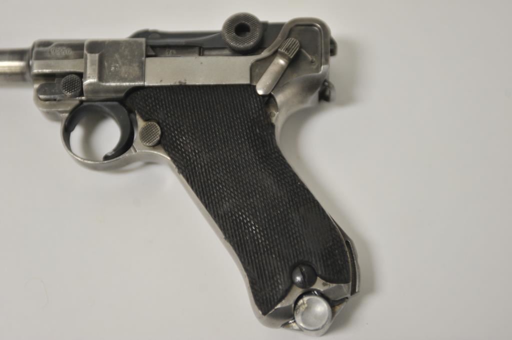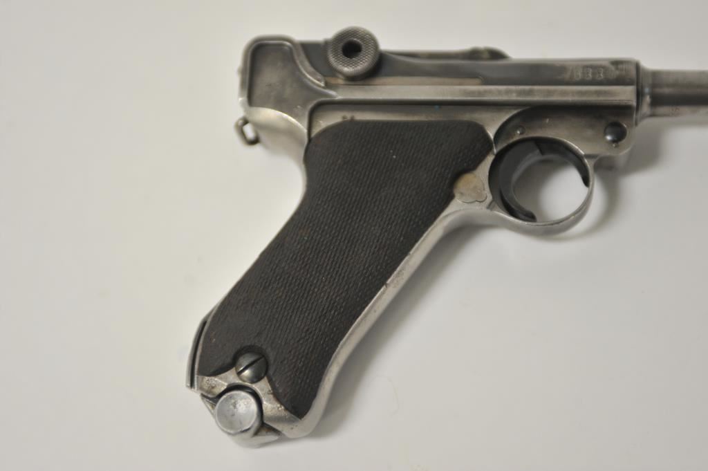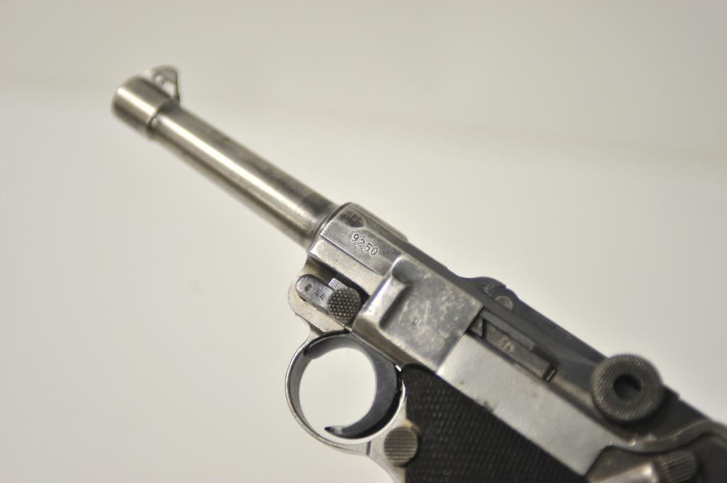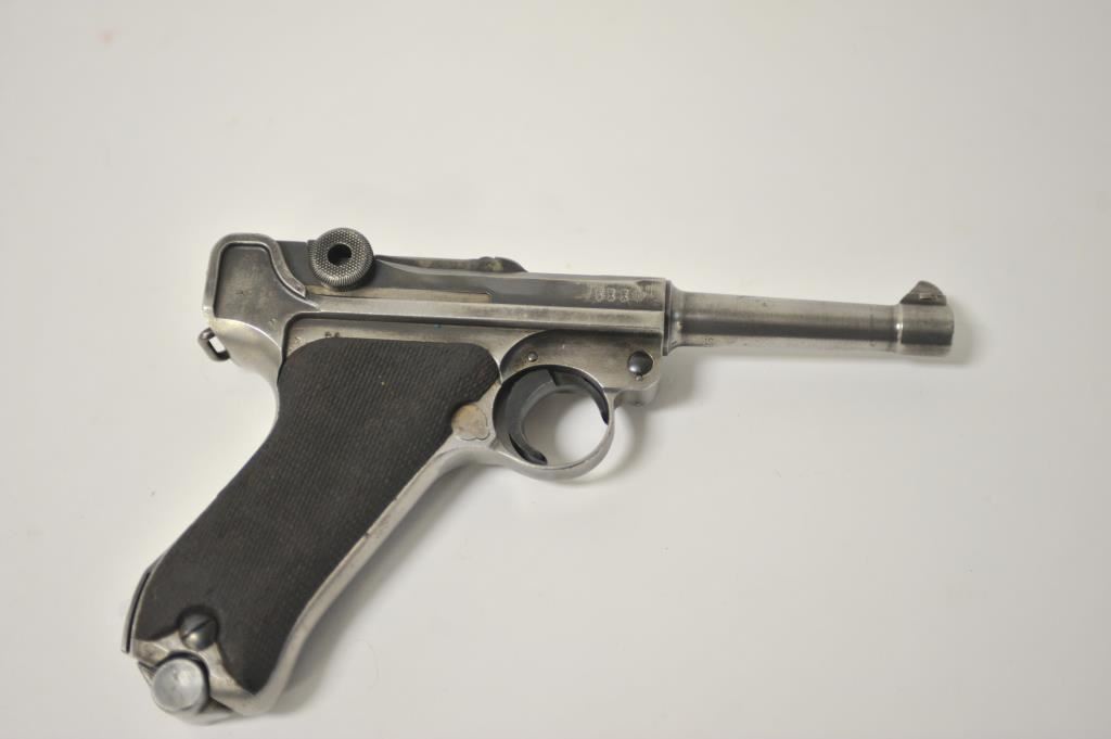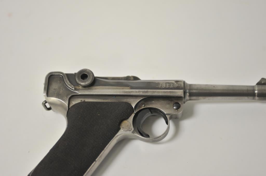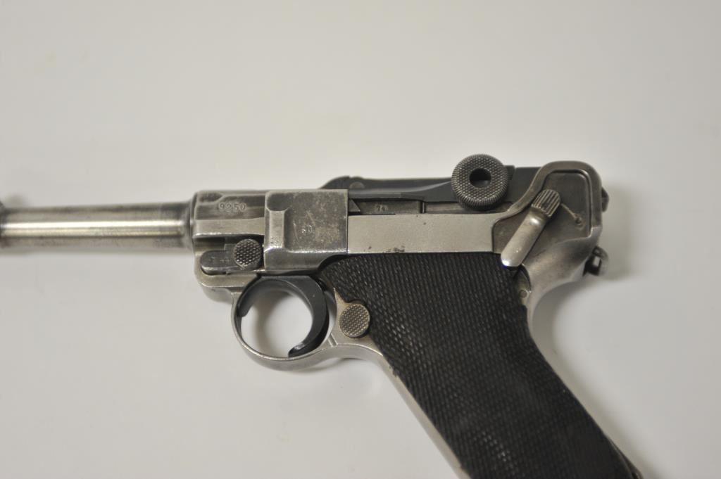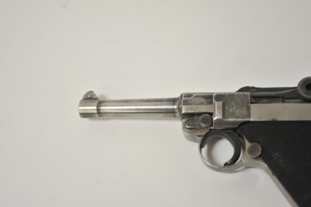 DWM Luger marked 1918 semi-automatic pistol, 9mm caliber, 4” barrel, blued finish, checkered wood grips, S/N 9250 (some mis-matched #’s); overall fair only with some old cleaning to metal surfaces, fair bore, good action, fair markings and grips. (C&R/PPT). Est.: $300-$600.