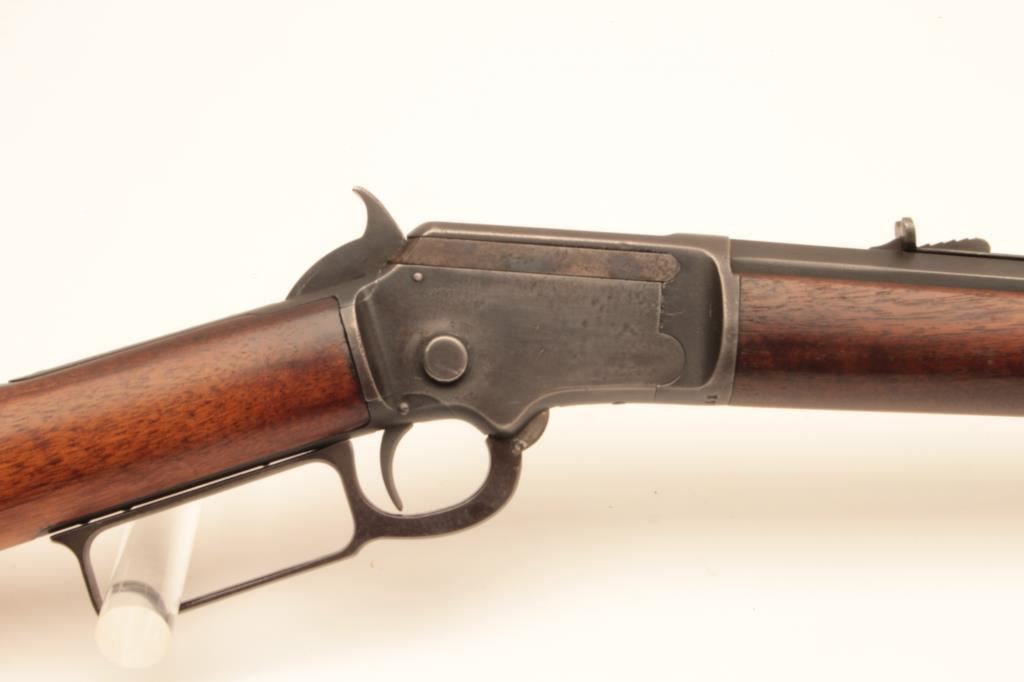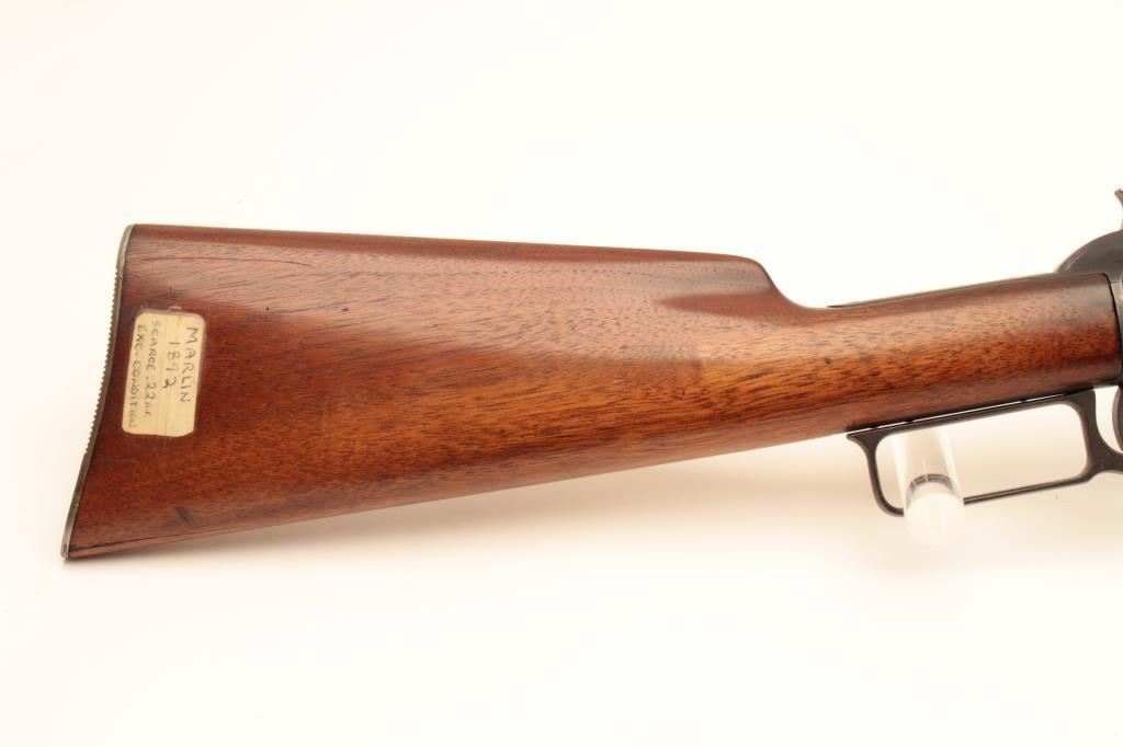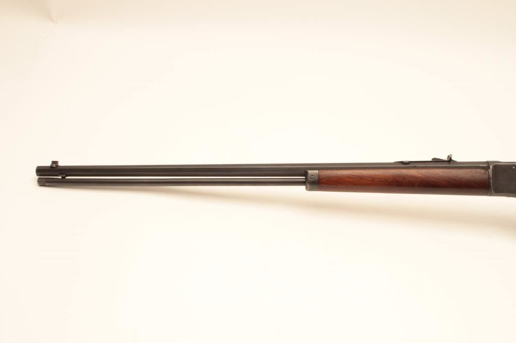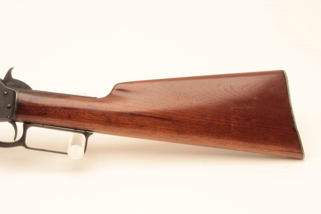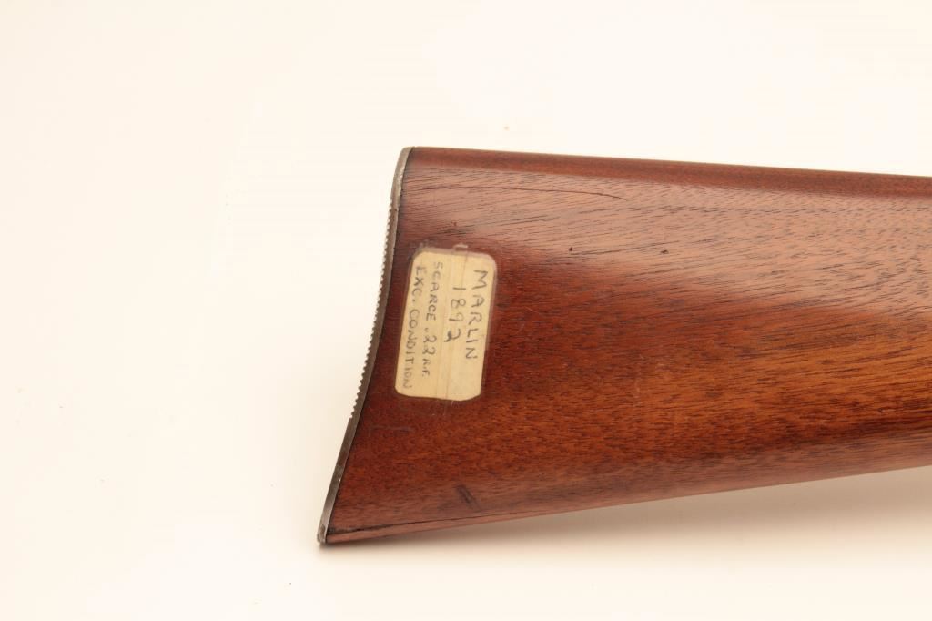 Marlin Model 92 lever action rifle, scarce .22RF caliber, 24” octagon barrel, blued finish, wood stocks, S/N 379740; overall good condition with majority of muted blued finish remaining on metal surfaces, fair bore, crisp action, good markings and good wood; fore stock shows a small chip at the top rail on left side at breech. (C&R/PPT). Est.: $300-$600.