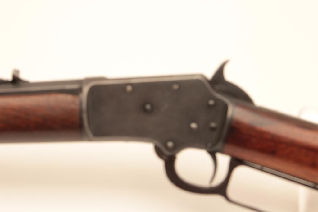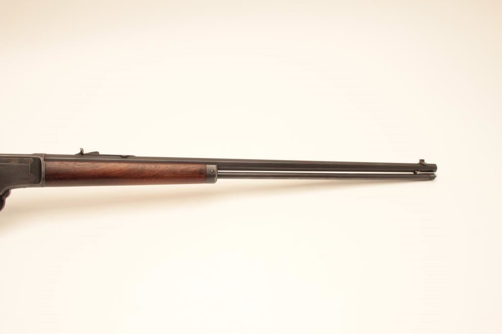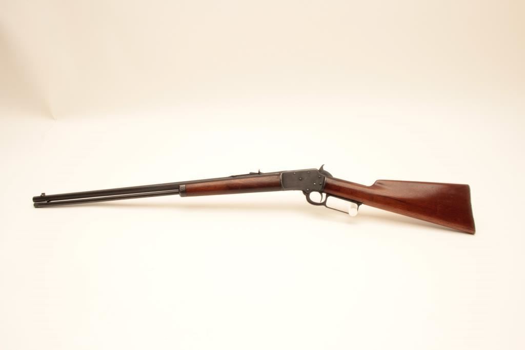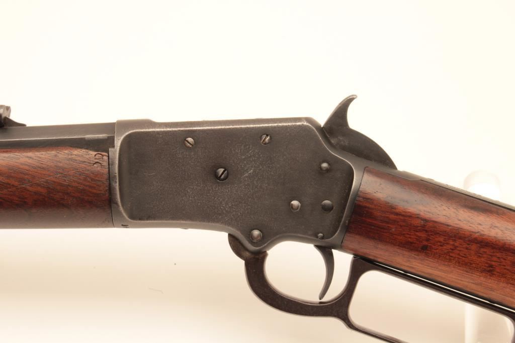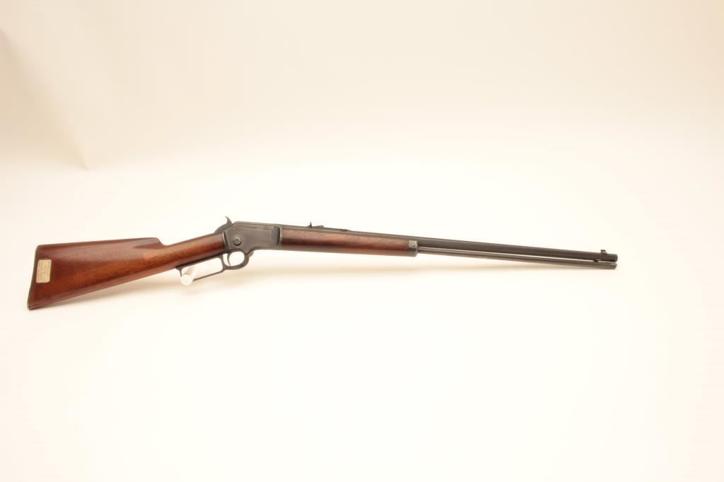 Marlin Model 92 lever action rifle, scarce .22RF caliber, 24” octagon barrel, blued finish, wood stocks, S/N 379740; overall good condition with majority of muted blued finish remaining on metal surfaces, fair bore, crisp action, good markings and good wood; fore stock shows a small chip at the top rail on left side at breech. (C&R/PPT). Est.: $300-$600.