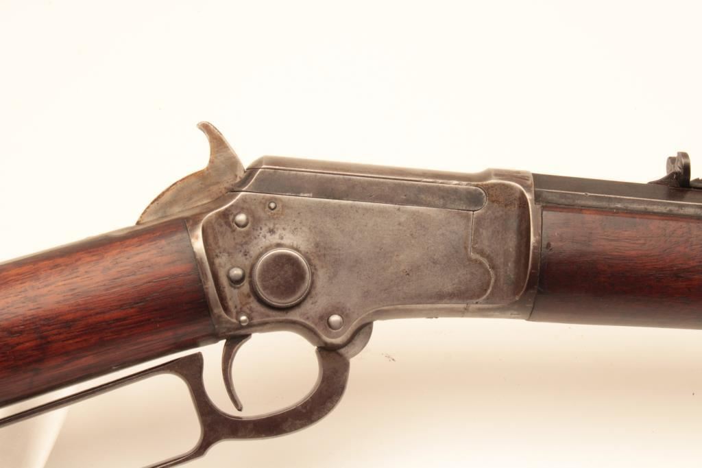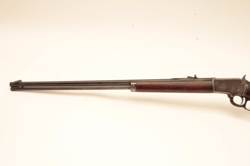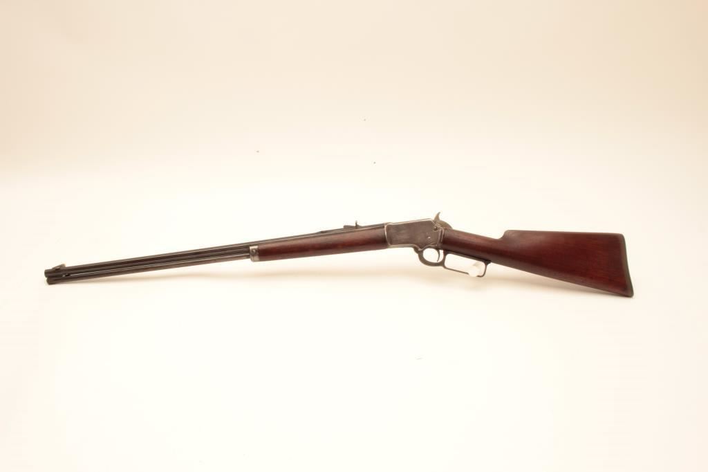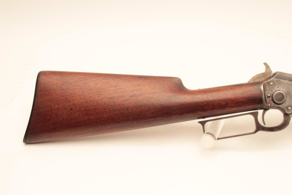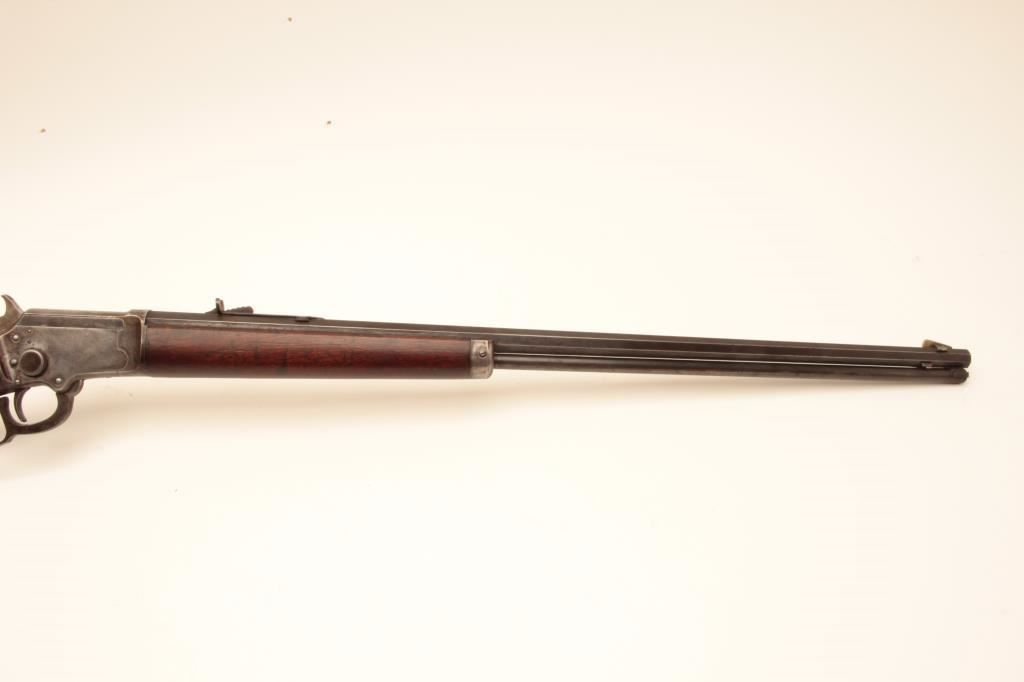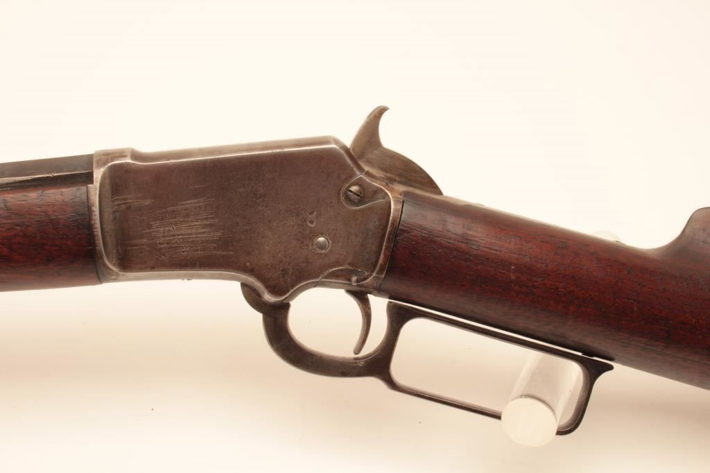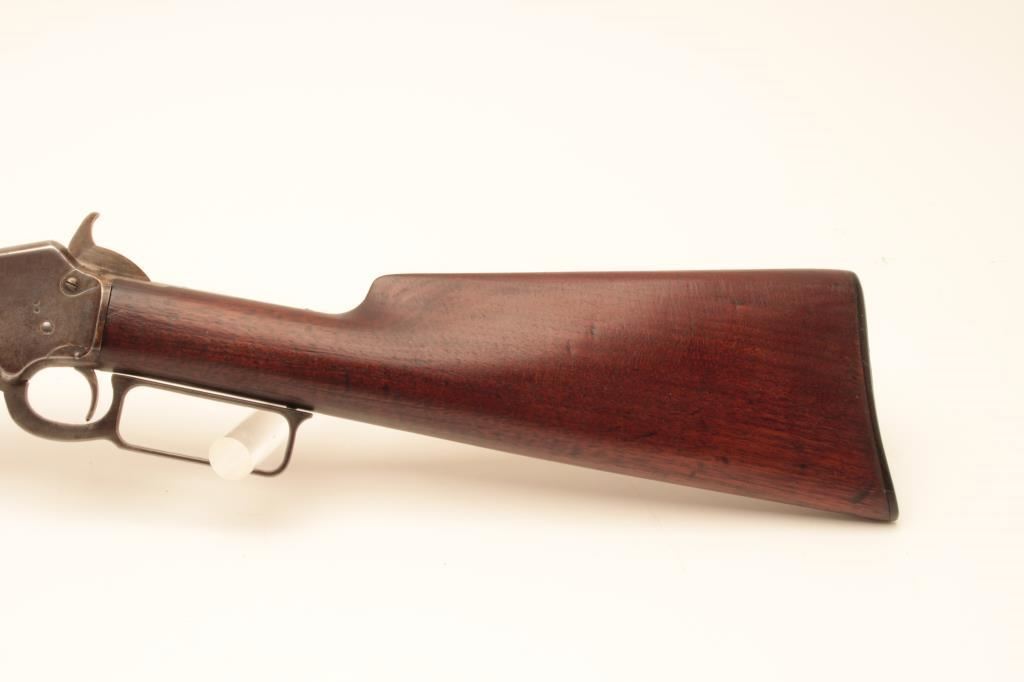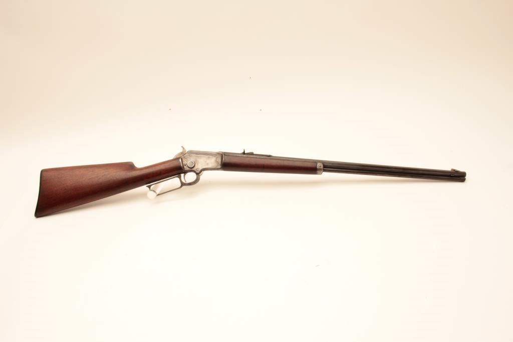 Marlin Model 1897 lever action rifle, .22 caliber, 24” octagon barrel, blued finish, wood stocks, S/N 153204; overall good + condition displaying majority of muted blued finish on barrel and loading tube, grey patina to receiver, good bore, crisp action and markings, good to very good wood; accompanied by a 1983 dated factory letter confirming features and noting shipping date as July 27, 1897. (Antique). Est.: $600-$1,200.