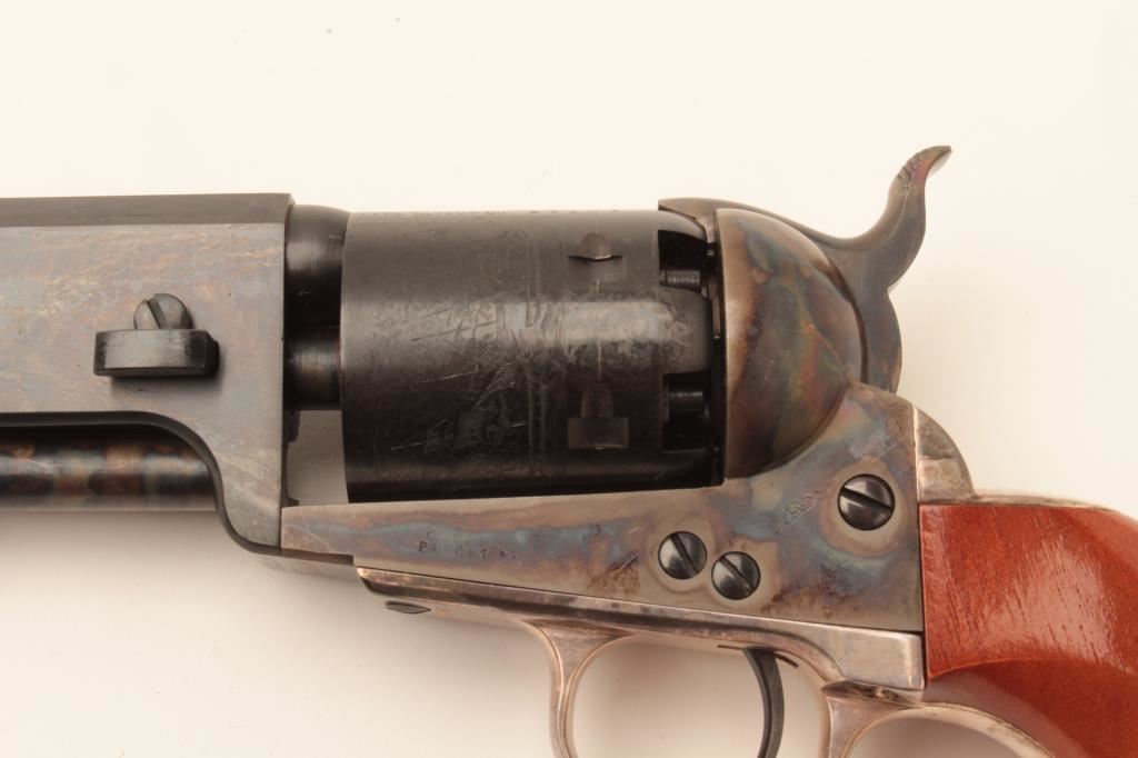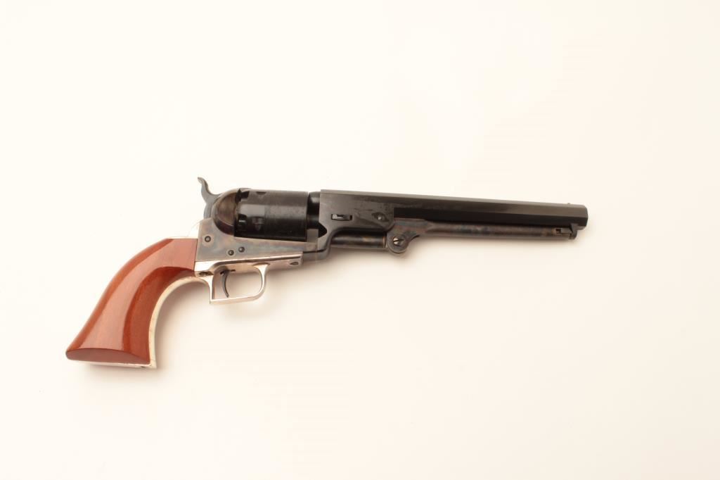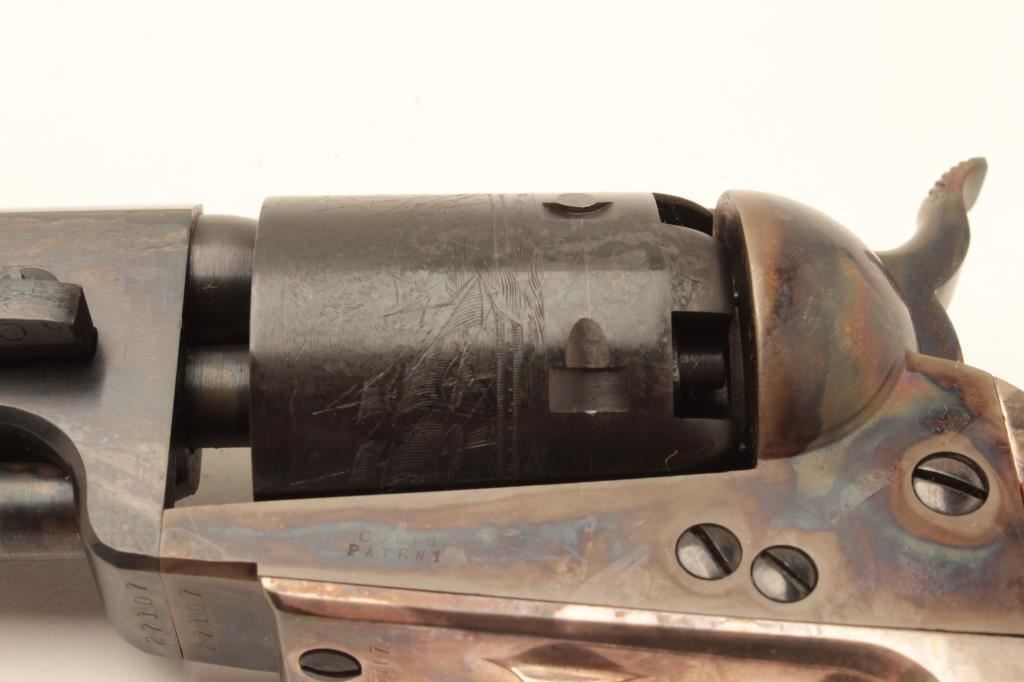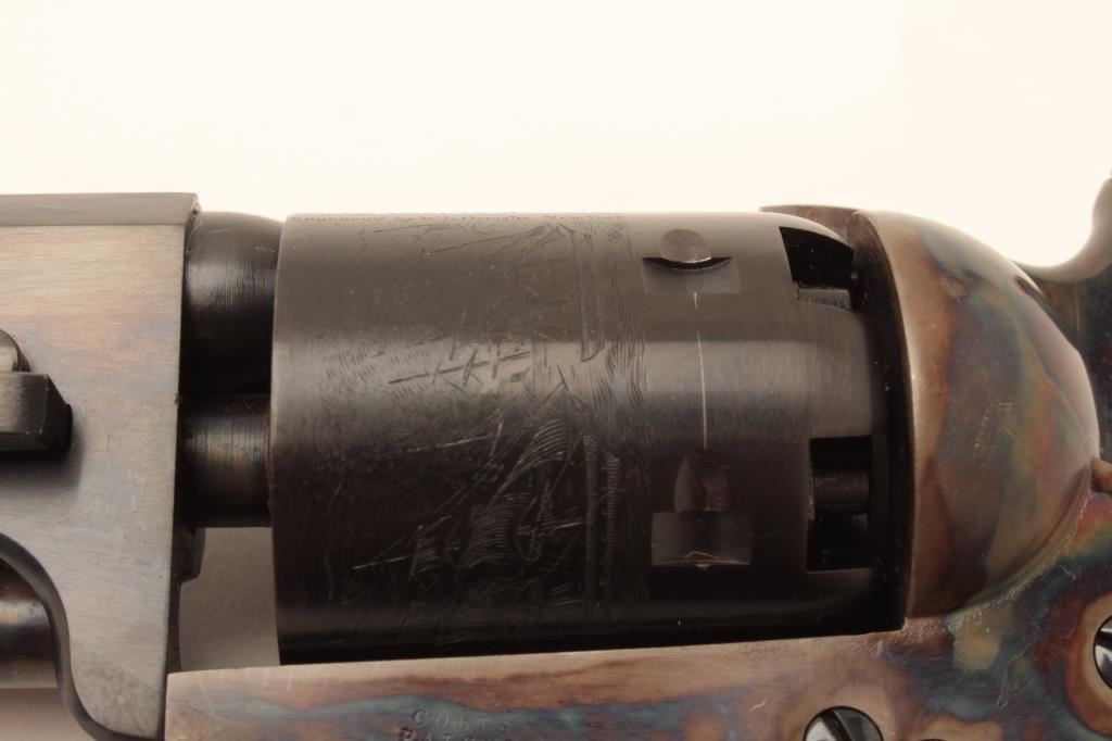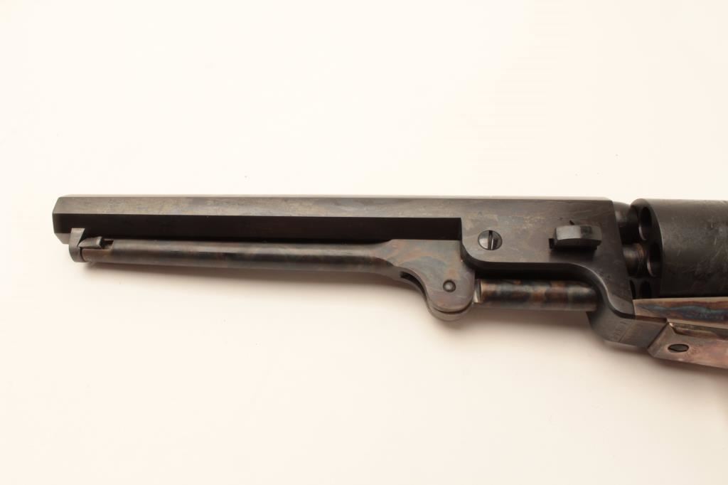 Colt New Blackpowder percussion Model 1851 Navy revolver, .36 caliber, 7.5” barrel, blued and case hardened finish, wood grips, S/N 27107; like new condition and contained in factory black cardboard box with end label numbered to this gun. (percussion). Est.: $400-$800.