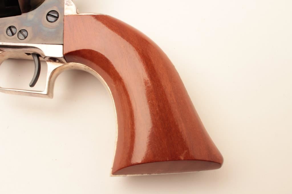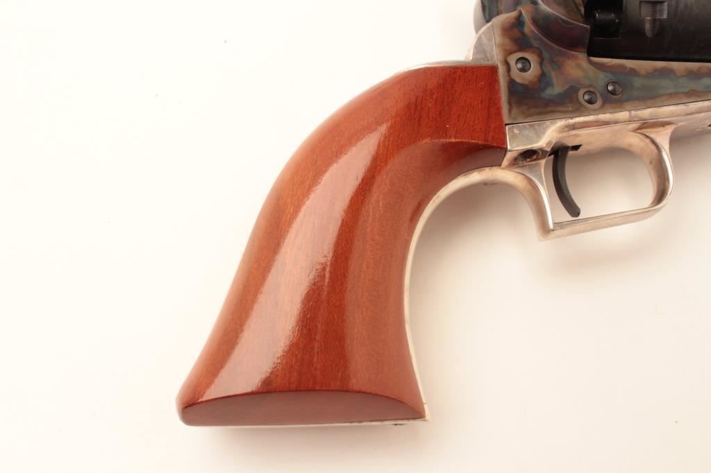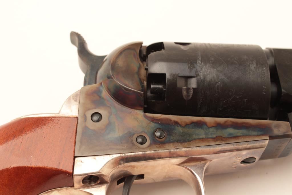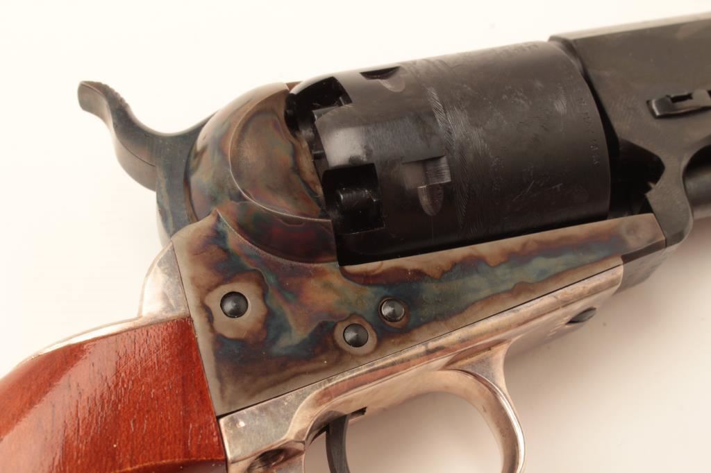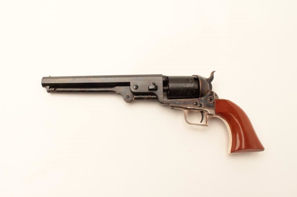 Colt New Blackpowder percussion Model 1851 Navy revolver, .36 caliber, 7.5” barrel, blued and case hardened finish, wood grips, S/N 27107; like new condition and contained in factory black cardboard box with end label numbered to this gun. (percussion). Est.: $400-$800.