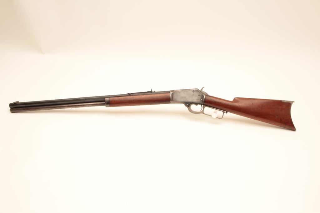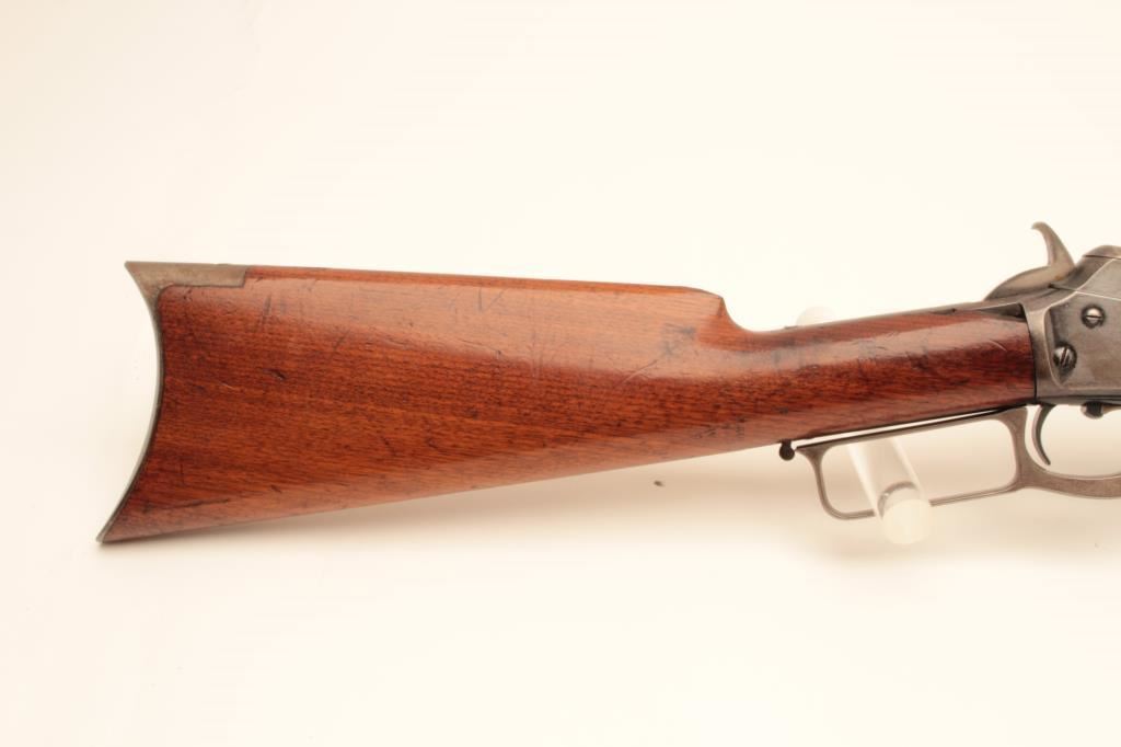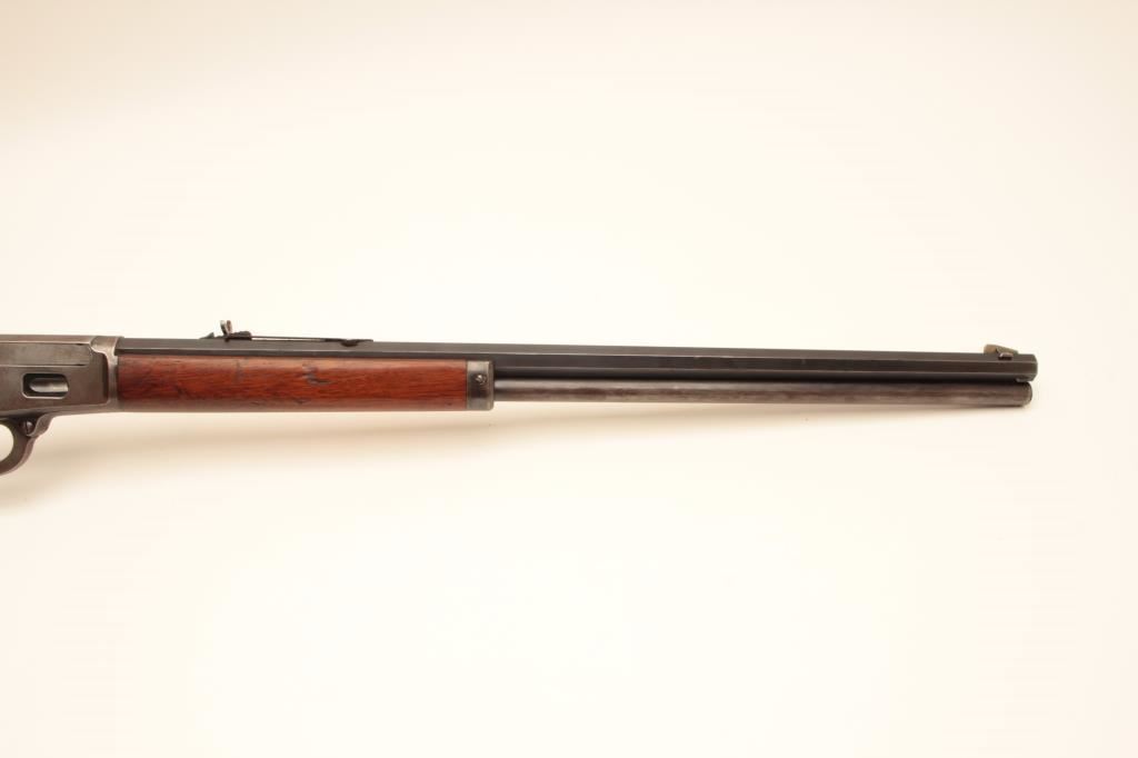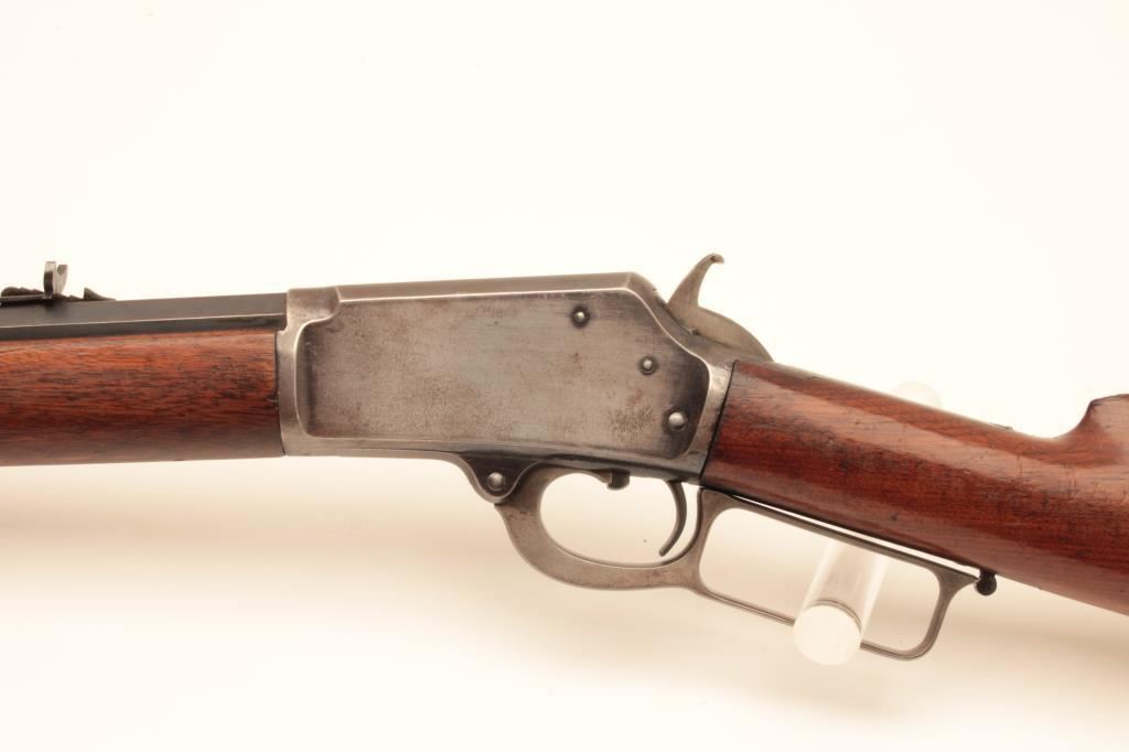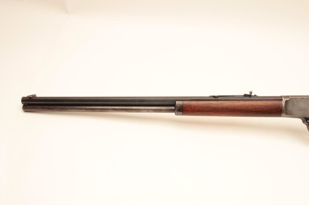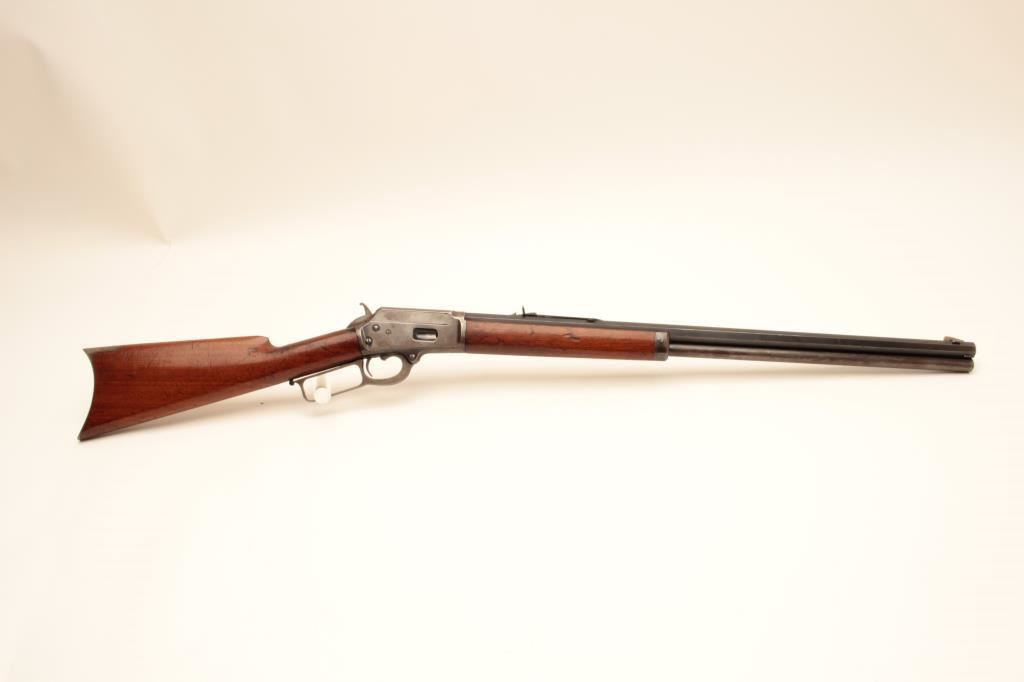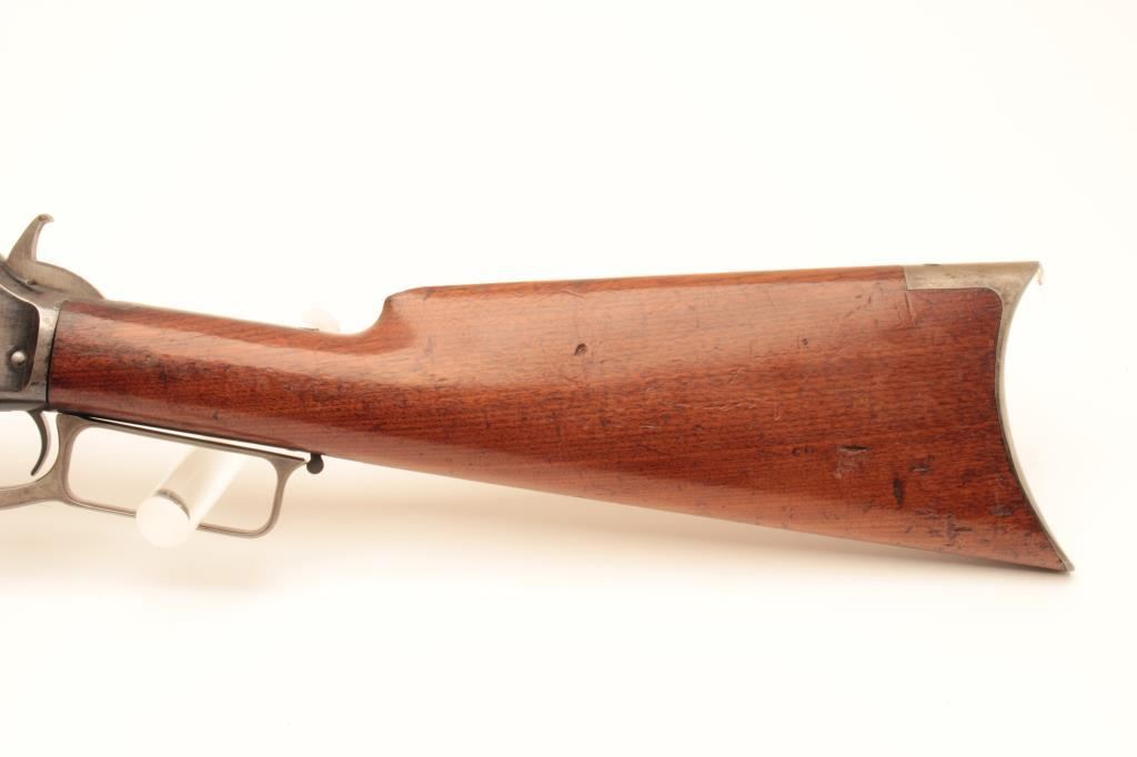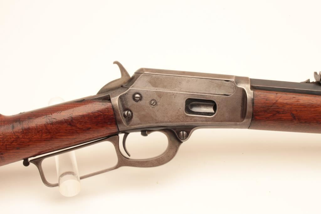 Marlin Model 1889 lever action rifle, .38-40 caliber, 24” octagon barrel, blued finish, wood stocks, S/N 42964; overall good to very good condition with majority of original blued finish on barrel, balance of metal surfaces gone to a grey and brown patina; very good bore, crisp action and markings, stocks are good with scattered old mars and scratches from carry and storage plus a small old loss to the right side of the butt stock wrist below the hammer. (Antique). Est.: $700-$1,400.