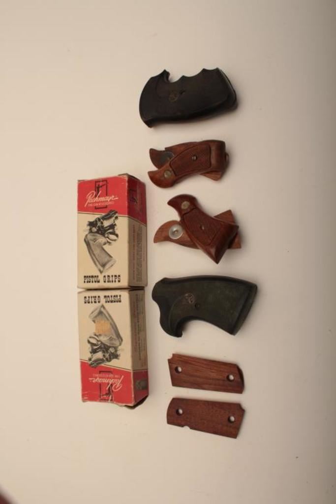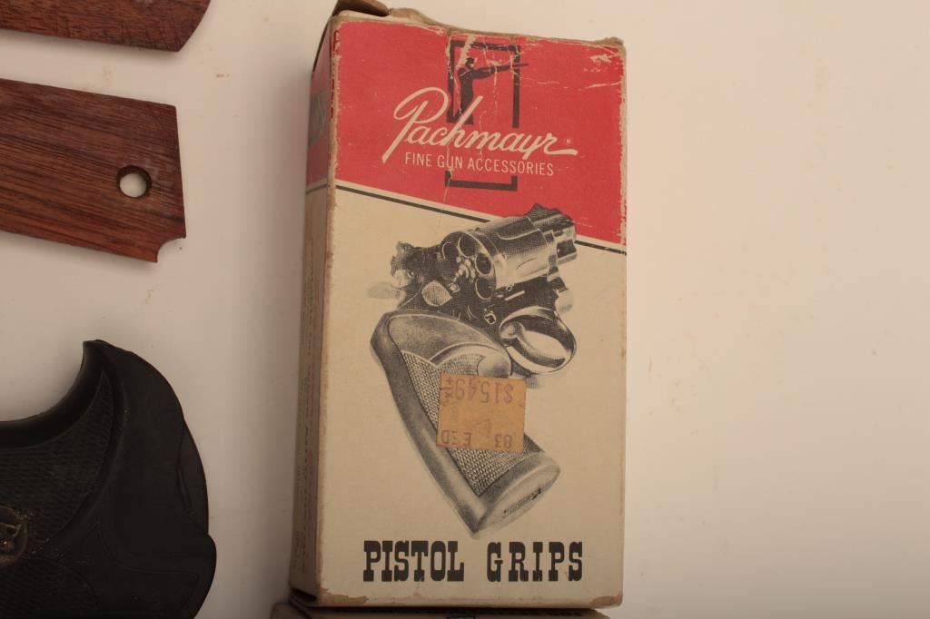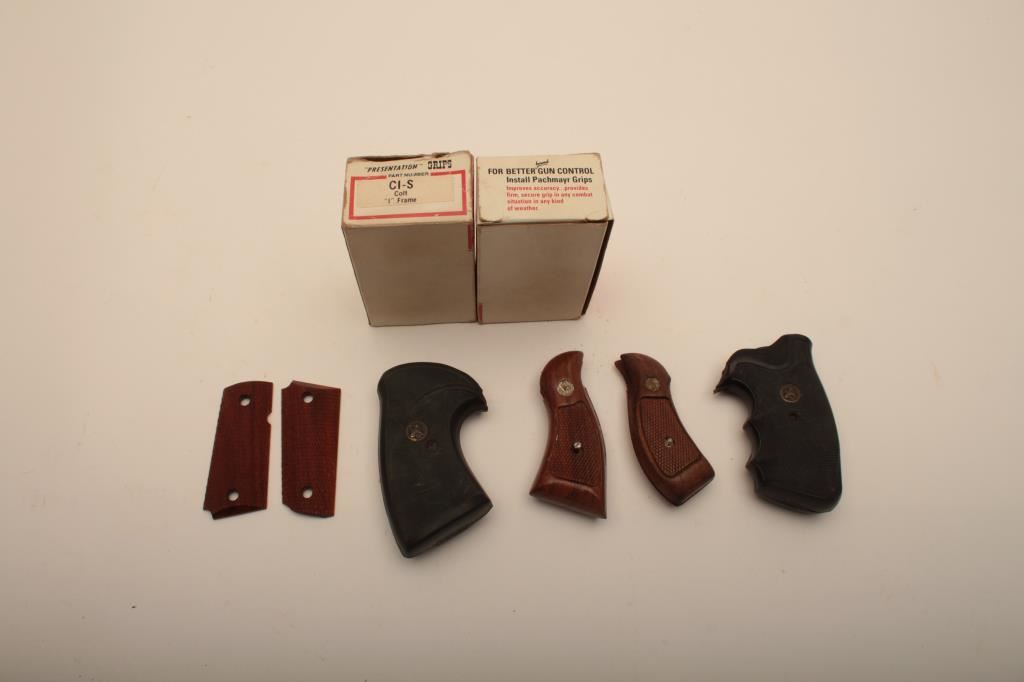 Lot of grips - 2 Smith & Wesson checkered logo grips, one round butt and one square butt, 4 sets of Pachmayrs, and one set of checkered wood grips, possibly for a Mustang. Est.$75-150