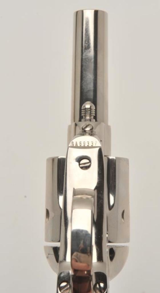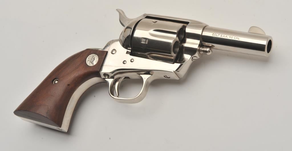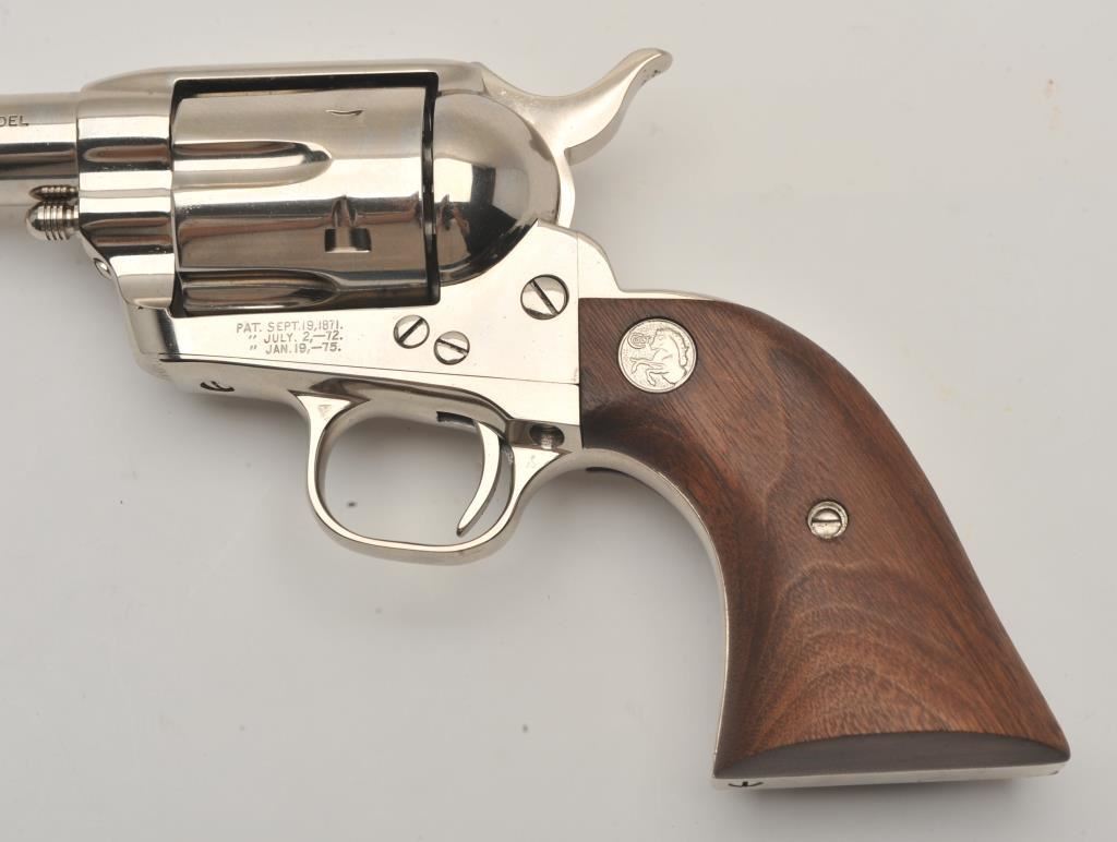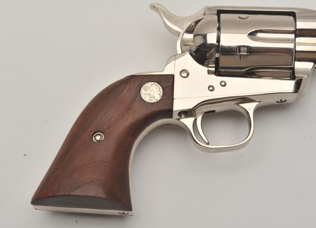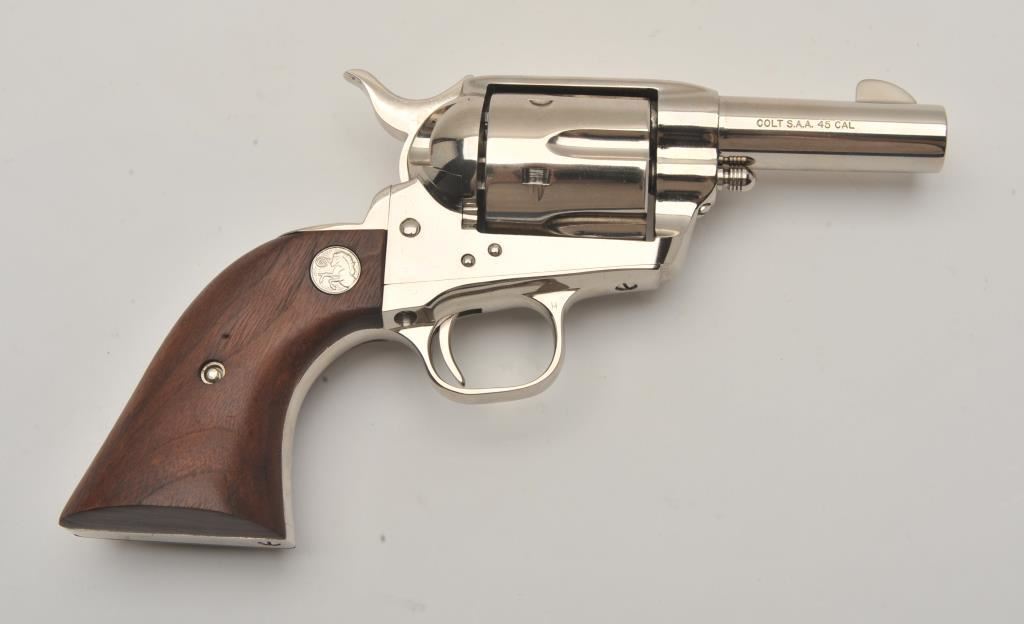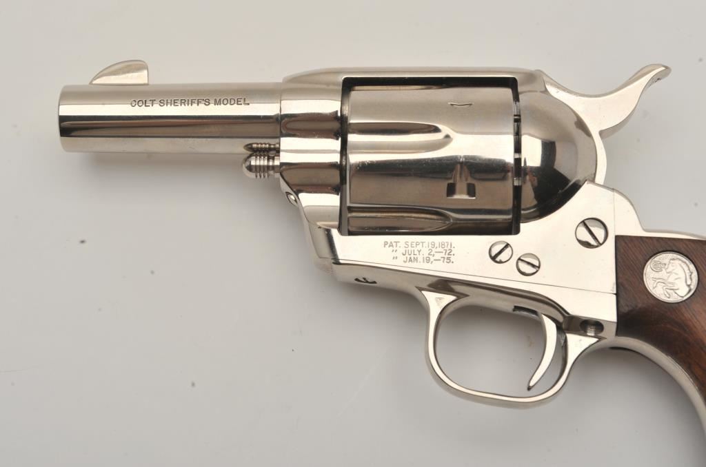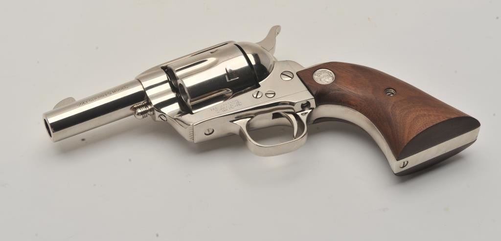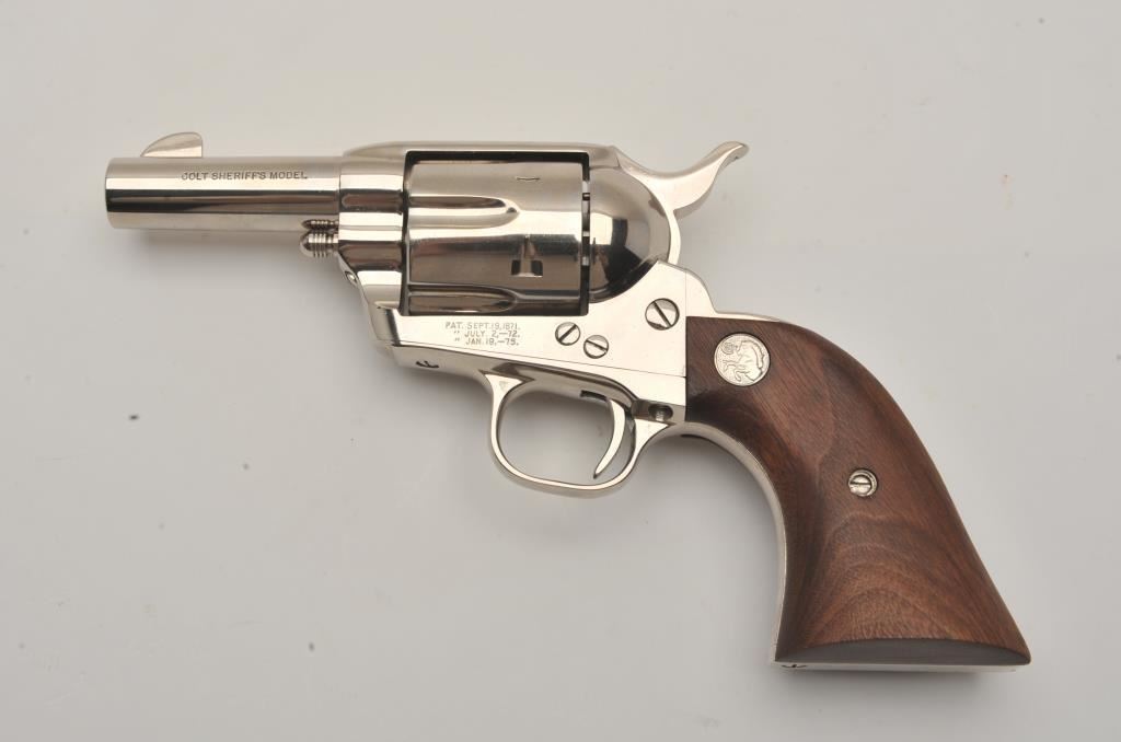 Colt 3rd Generation SAA Sheriff’s Model revolver, .45 caliber, 3” barrel, nickel finish, smooth wood medallion grips, S/N SA69337; like new condition. (Modern/PPT). Est.: $800-$1,600.