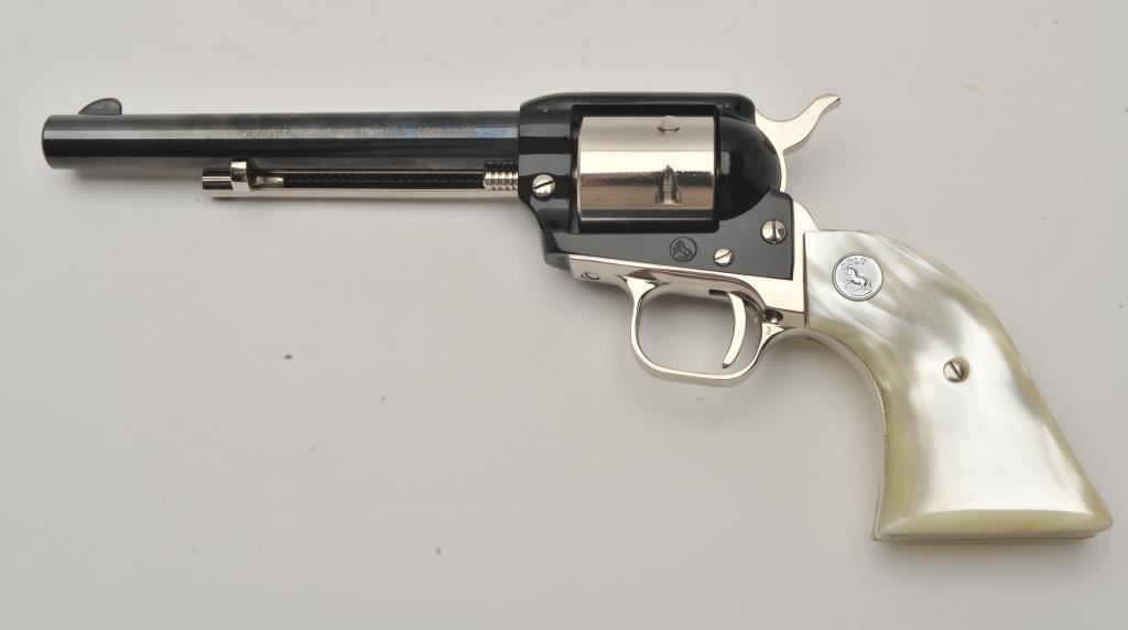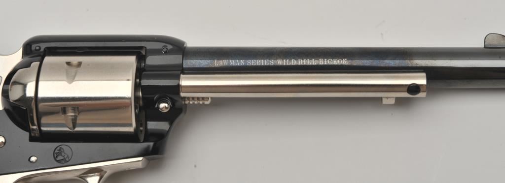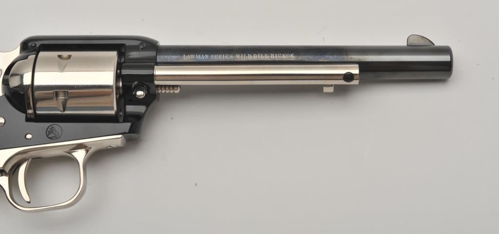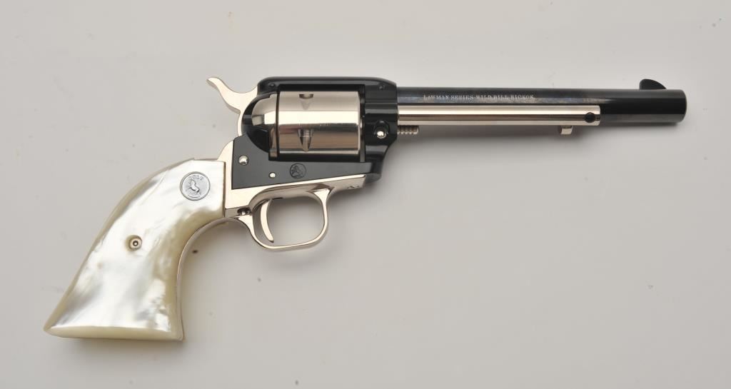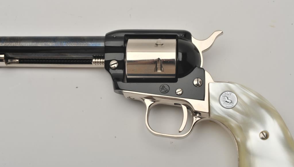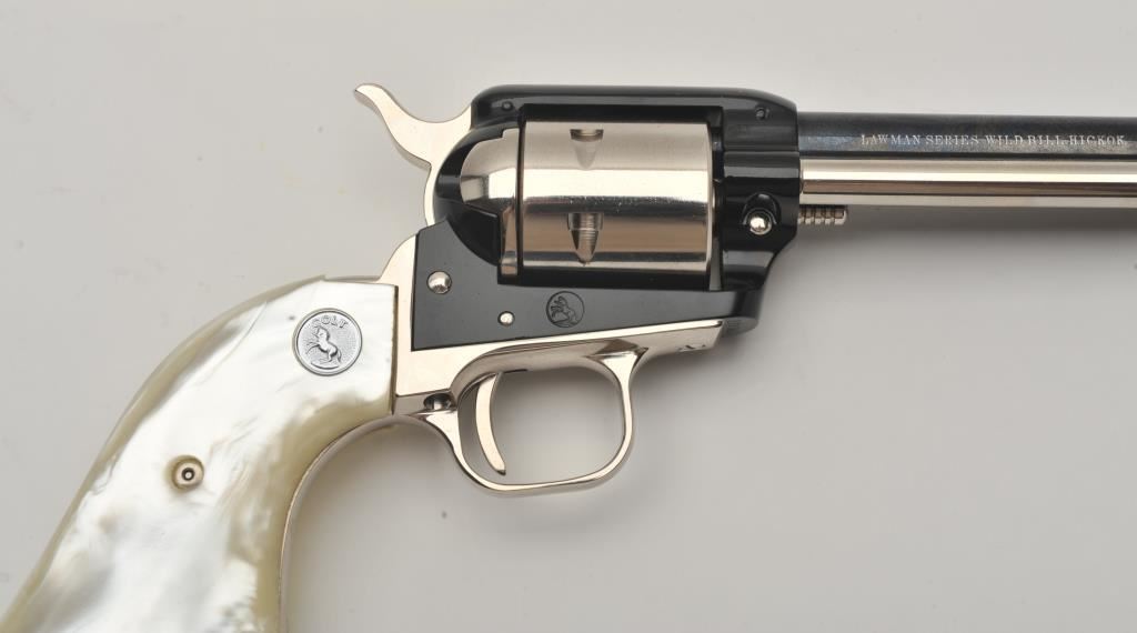 Colt Single Action Frontier Scout Lawman Series Wild Bill Hickok revolver, .22LR caliber, 6” barrel, two tone finish (blued and nickel), simulated pearl medallion grips, S/N 2649WB; like new condition. (Modern/PPT). Est.: $300-$600.