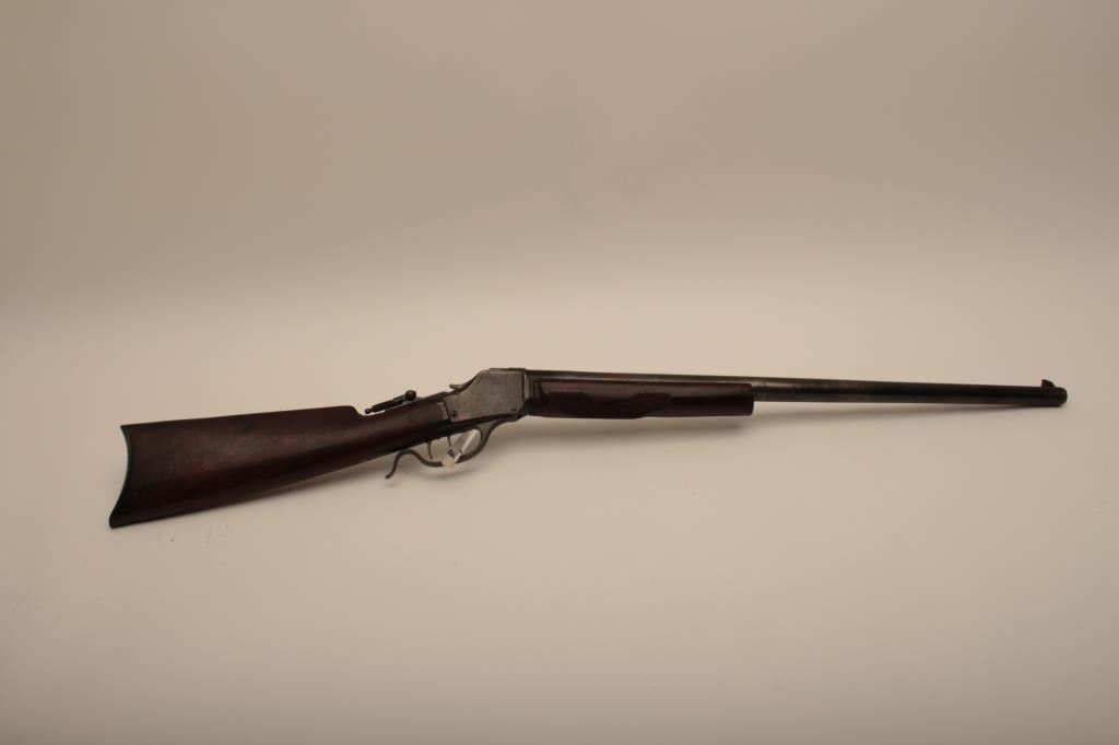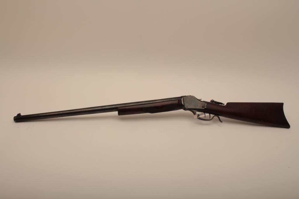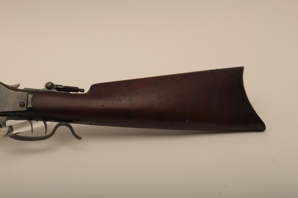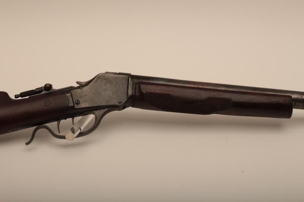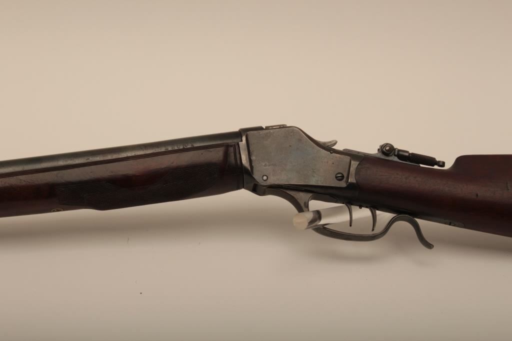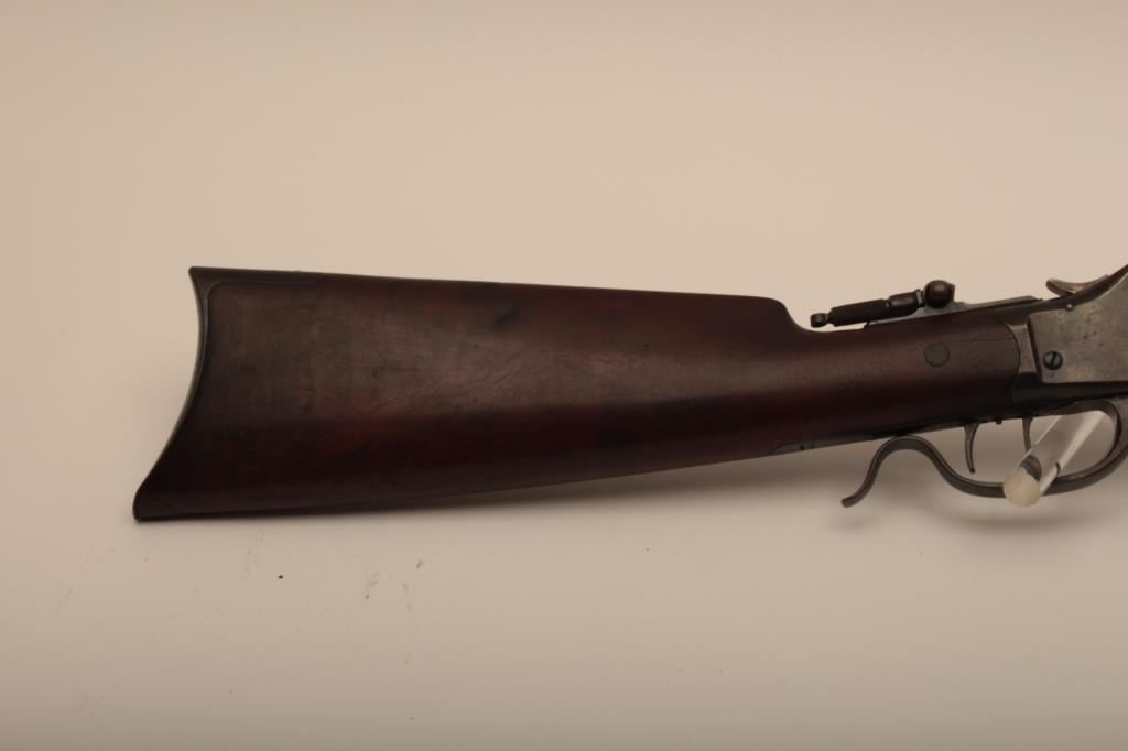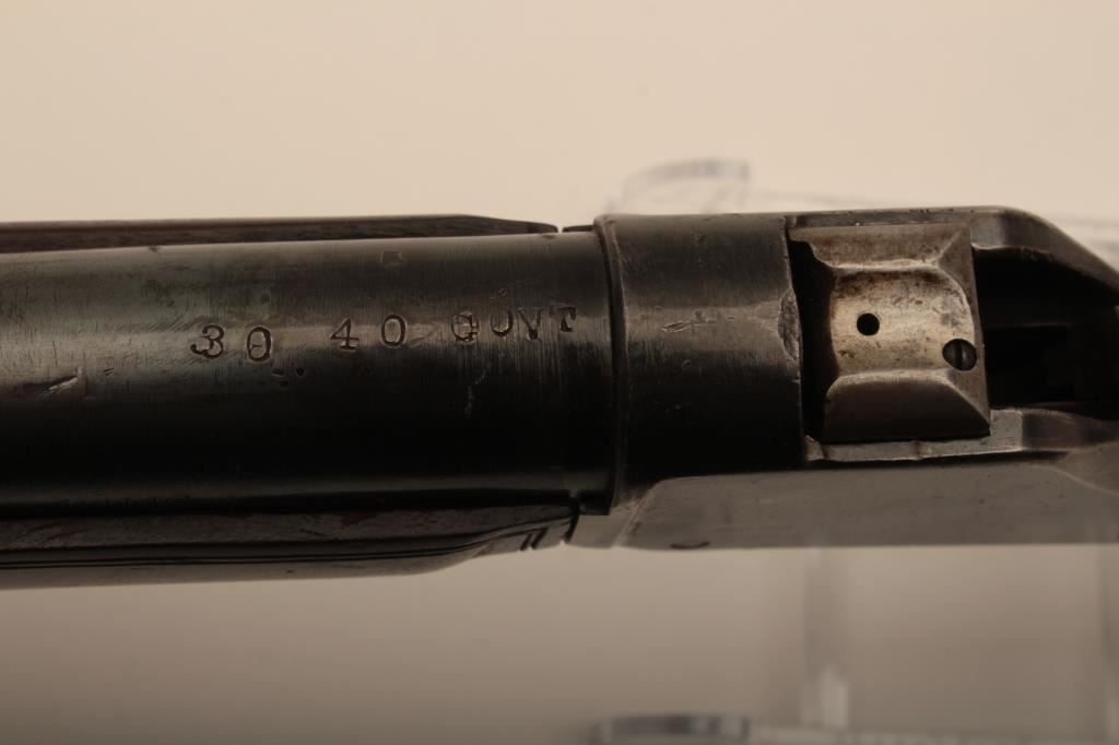 Winchester High Wall action with custom heavy round barrel and fore end in .30-40 Govt. (Krag) with non-factory double set triggers, S/N 95281. The left rear of action hand stamped “Buick”. From 1940-60s there was a mechanic on Glassel St. in Orange that built single shot rifles using car axles and parts. He was a good machinist and had a rifling machine. His guns were brokered by Serven Gun Room and Sam Fowler. He was known to mark the, “Buick, Cadillac, Chevy, Ford, Etc.” The rifle shows a poor shop quality refinish and a crudely checkered fore end. 26” barrel of slightly heavy weight. Triggers work well and are adjustable. Lyman tang sight with blade front sight. No rear barrel sight. Original buttstock repaired at toe. About good overall. (C&R) Est.: $300-$600