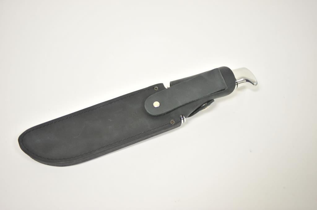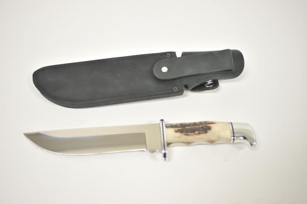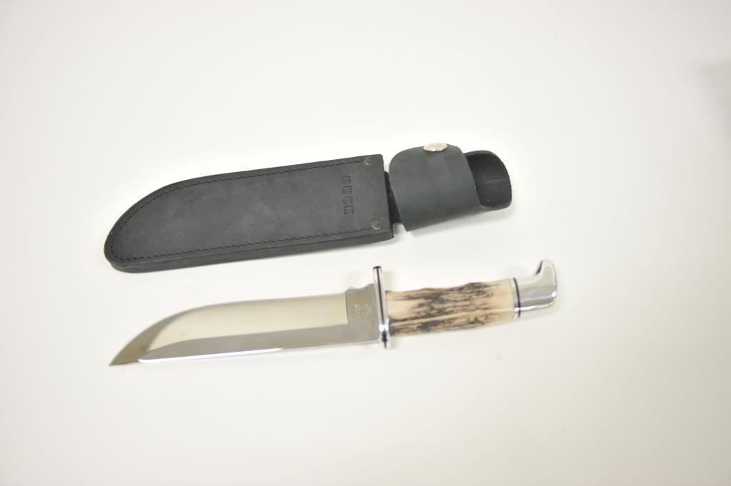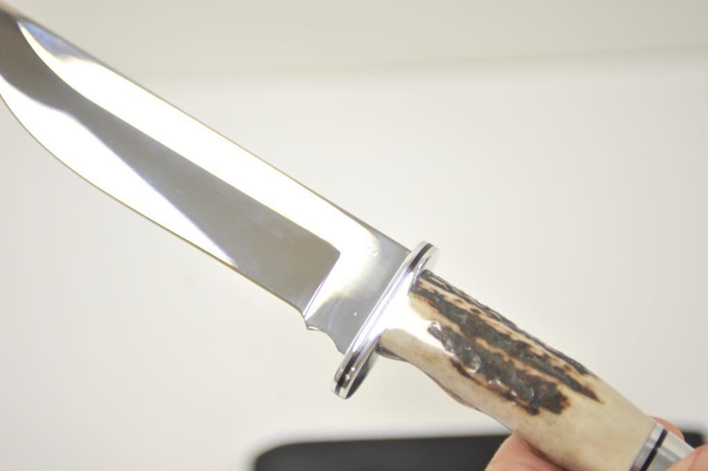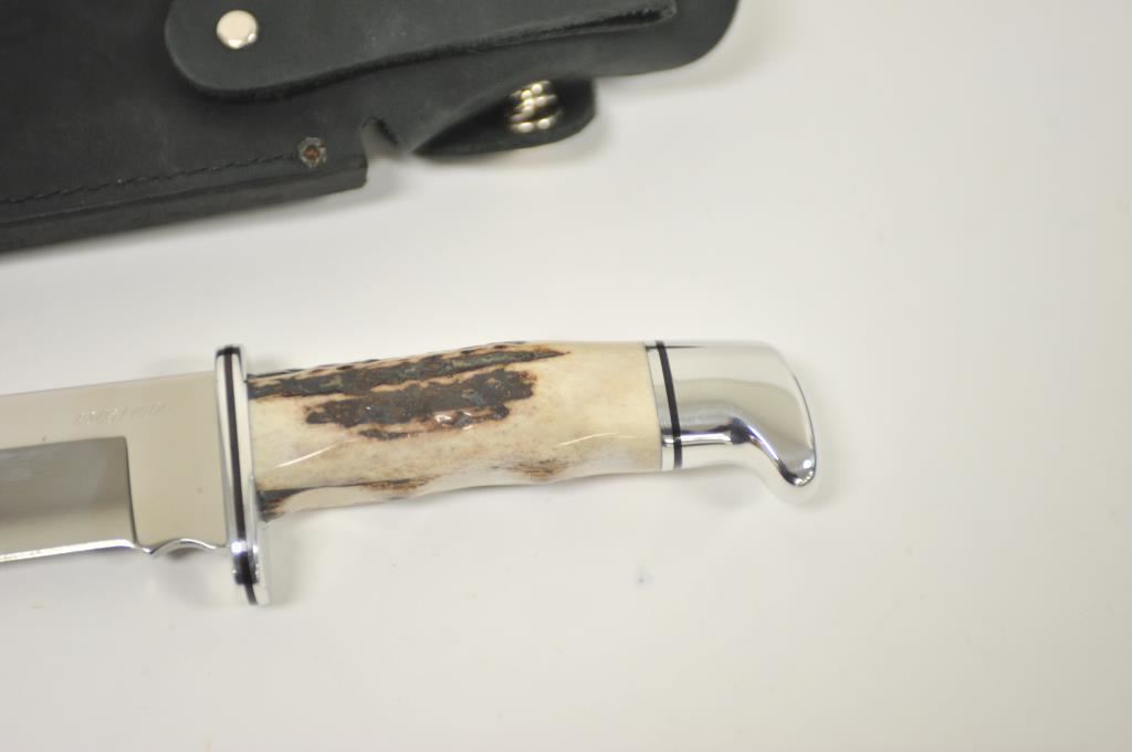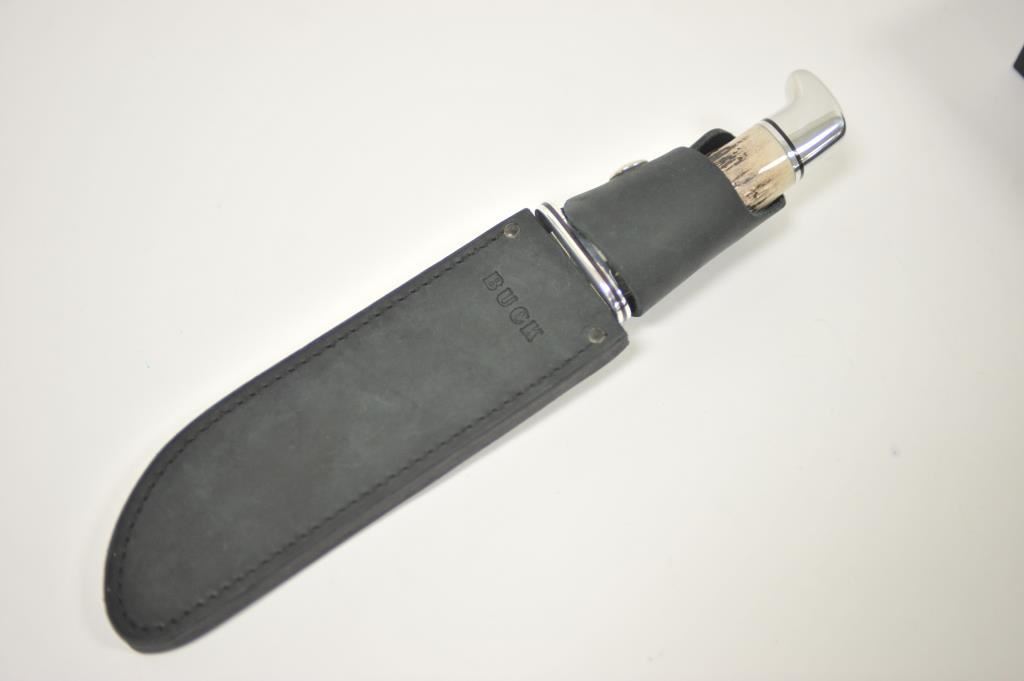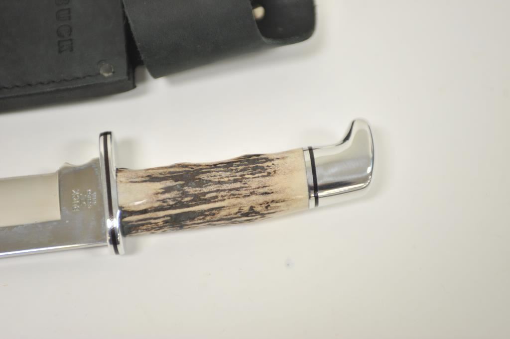Buck Limited Edition 124 Sambar Stag Frontiersman fixed blade knife with distressed leather scabbard in the factory cardboard box. The knife is numbered 0805/1000. It features a 7” mirror polished blade of 420HC stainless steel with a beautiful Sambar Stag handle. The handguard and pommel and done in stainless as well. A great knife, as new in the box. Est.: $125-$250.
