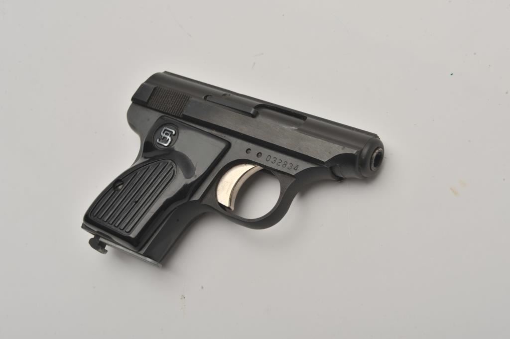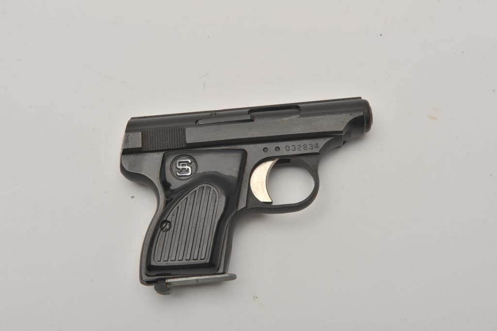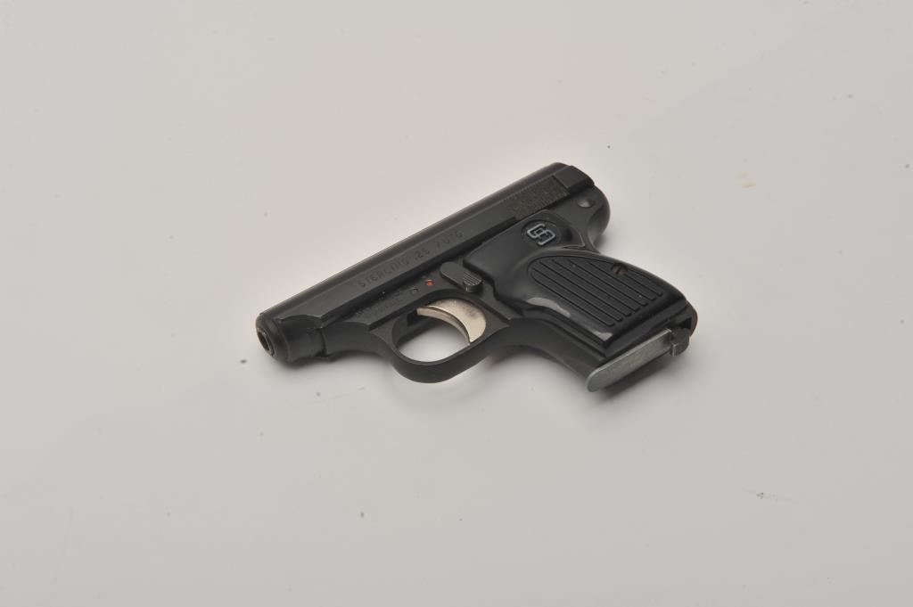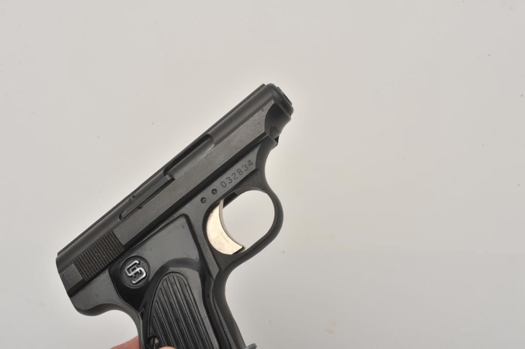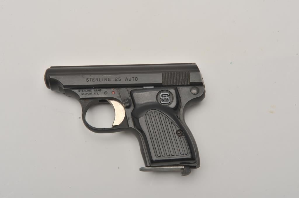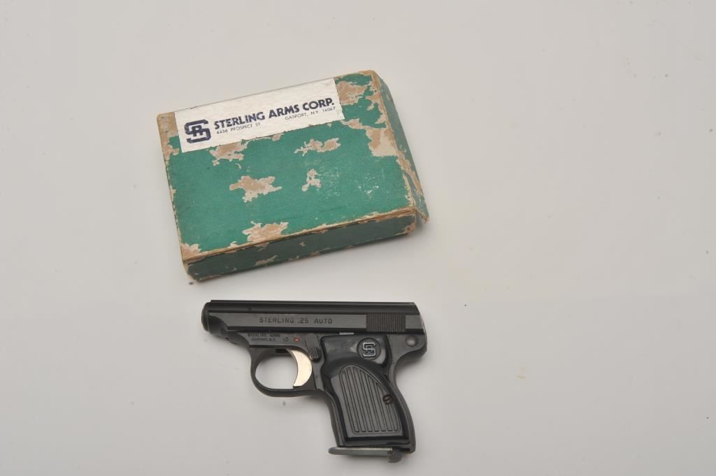 Sterling Arms semi-automatic pistol, .25 caliber, Serial #032834. The pistol is in very good overall condition with a 2 ½” barrel. The metal surfaces retain the majority of their blue finish with light handling marks. The ridged plastic grips are in very good condition showing little use. The lot includes the factory card board box and one correct magazine. The bore is good, the action functions and markings are legible on this lightly used pistol. Est.: $75-$150. (Modern/PPT).