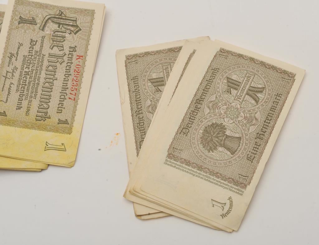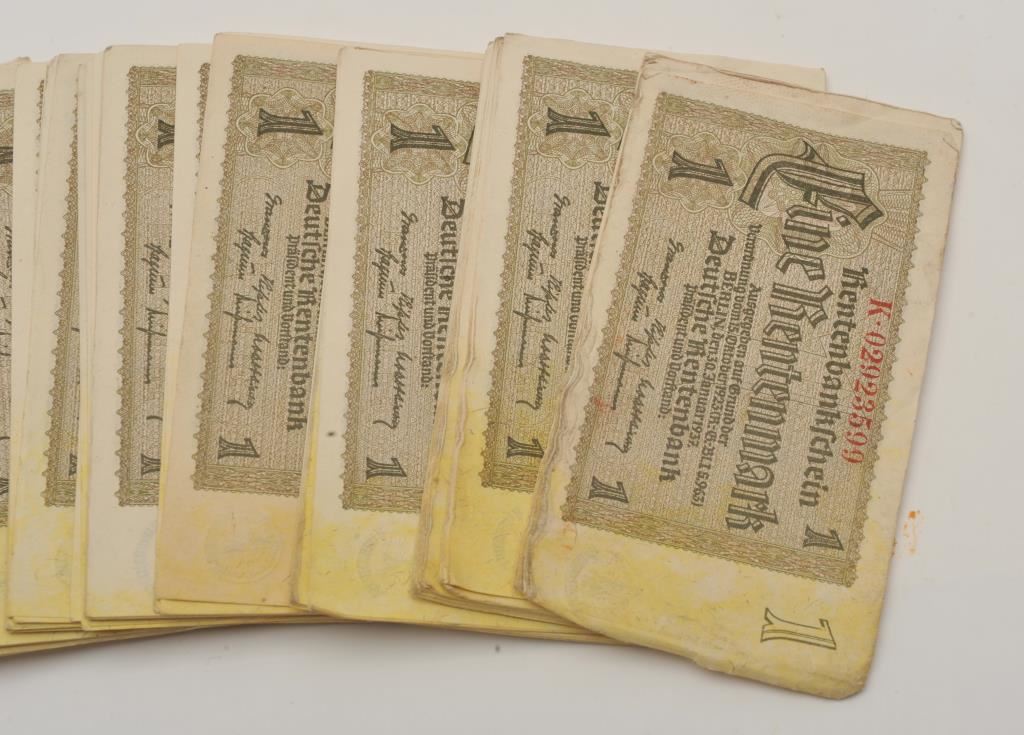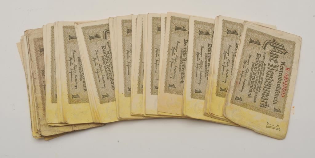 Approximately 100 Gorman Rentenmark (1937 era) some in sequence. 1 MK notes in good condition. WWII Bring backs. Est.: $100-$300