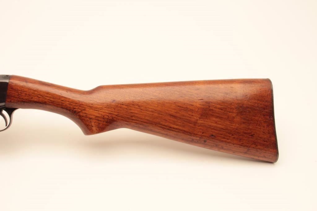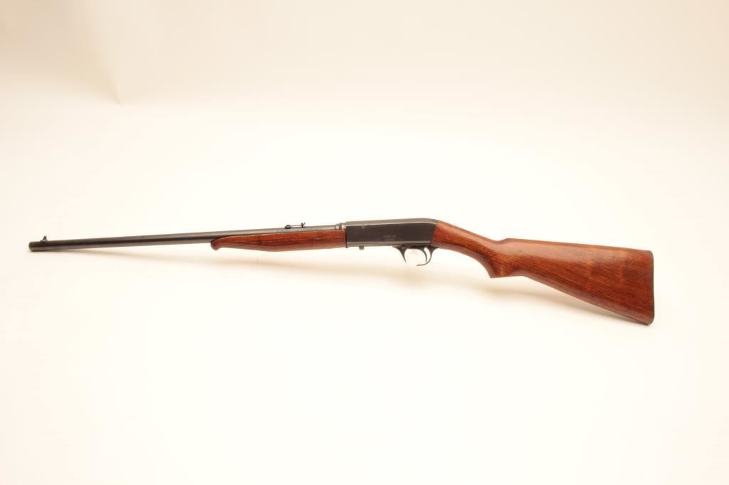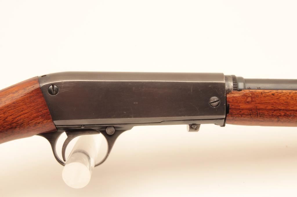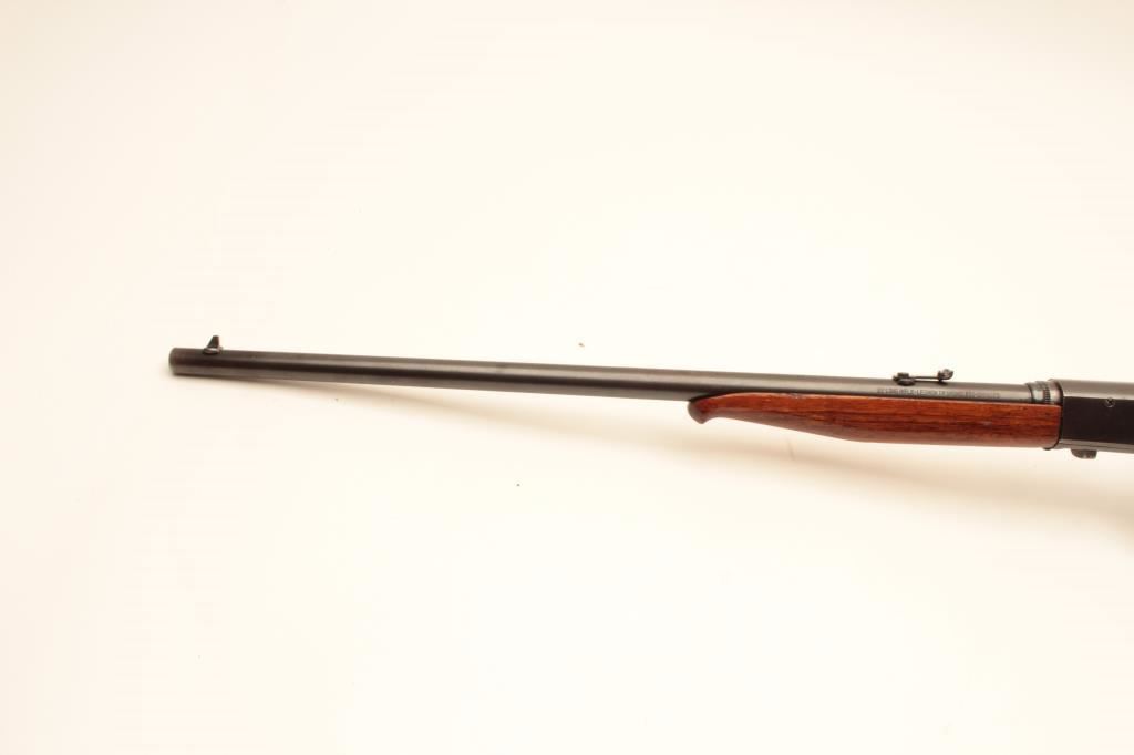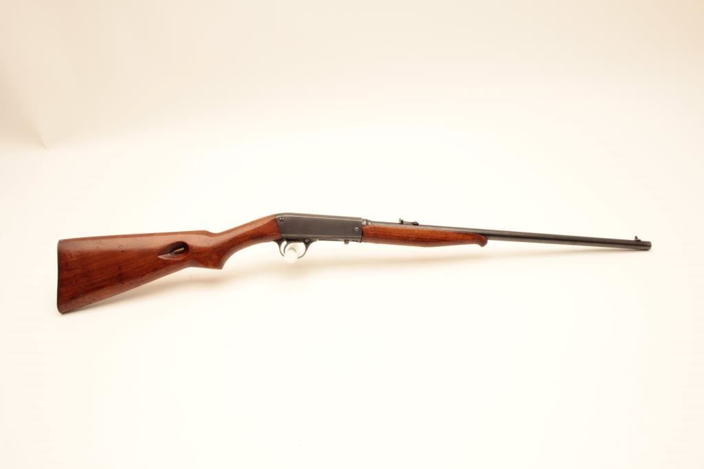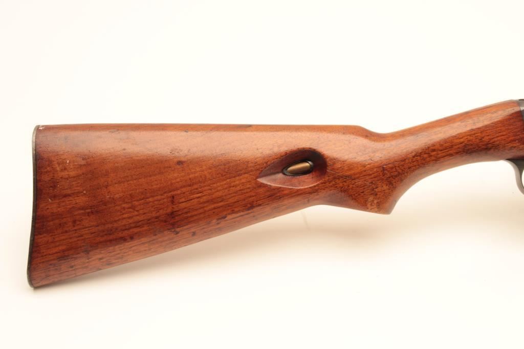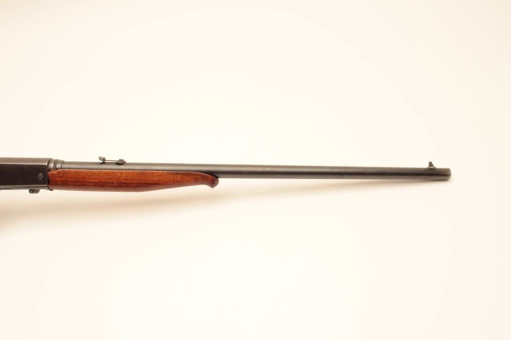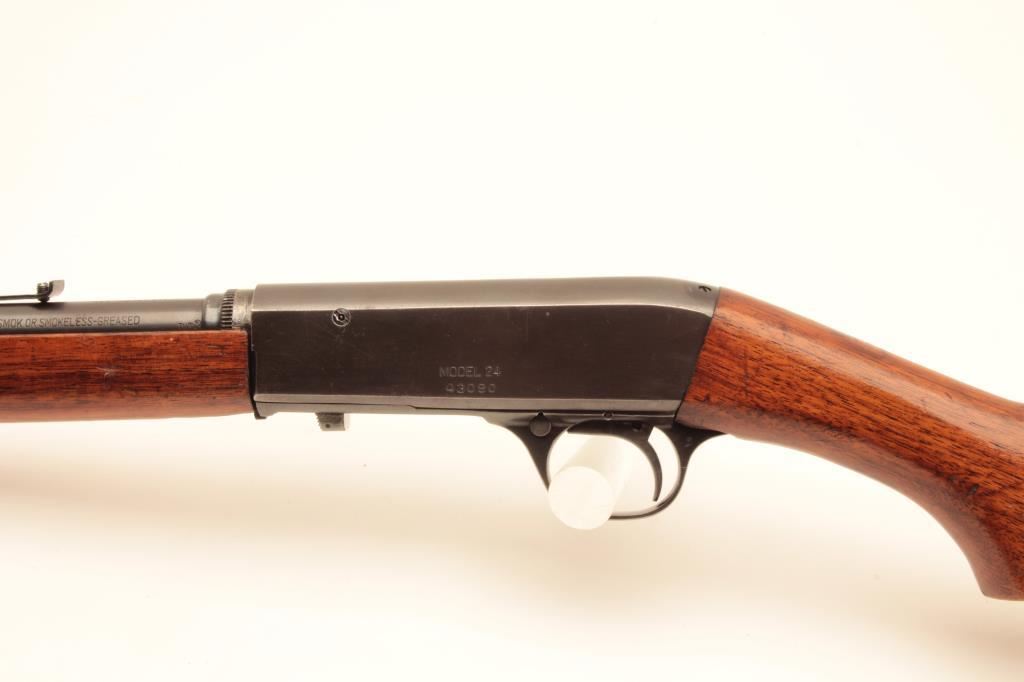 Remington Model 24 .22 L.R. Caliber Semi-Auto take down rifle with a 19” barrel, S/N 43090 circa about 1926. Good to very good original condition. 75%-85% naturally aging blue finish. Stocks are good with 1 large chip by right rear of barrel at takedown collar. Other minor dings, mars and scratches. Good action. Bore fair to good and may improve with scrubbing. Browning patent marked. (C&R) Est.: $200-$400