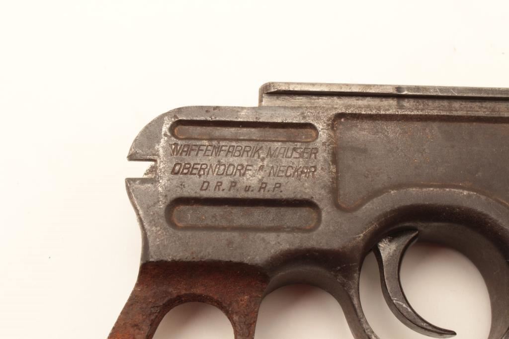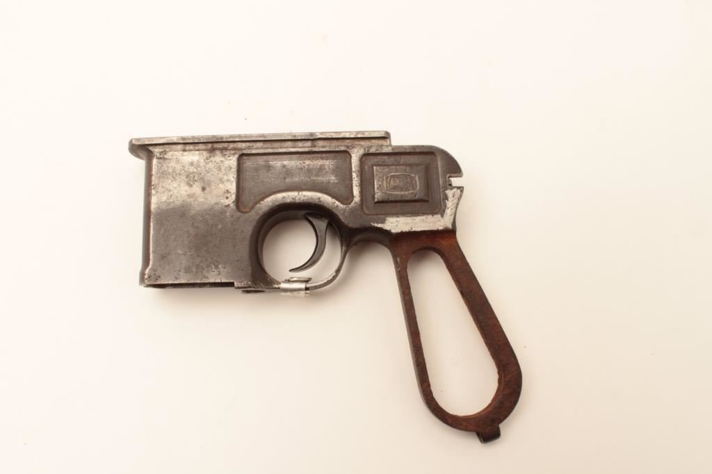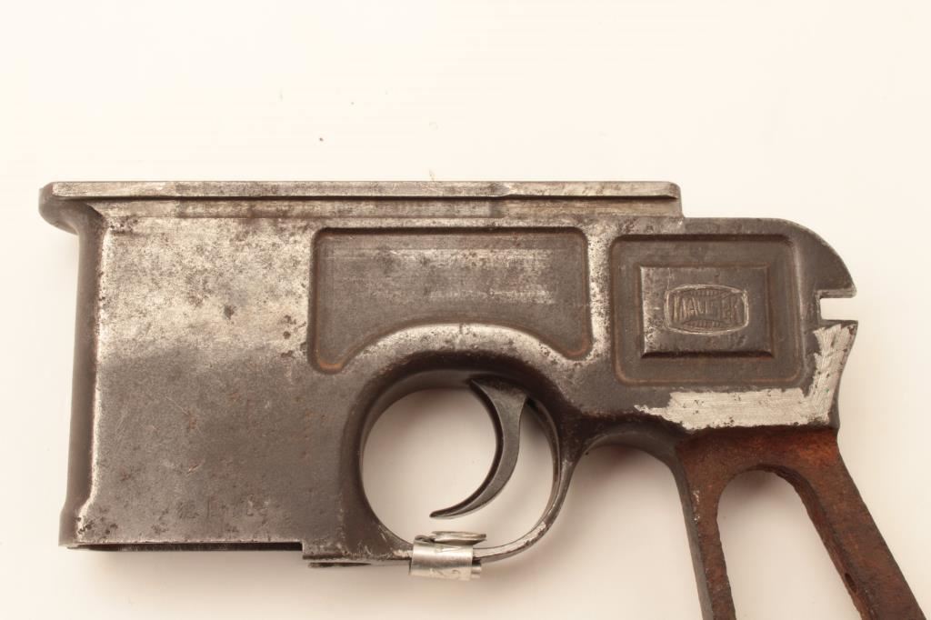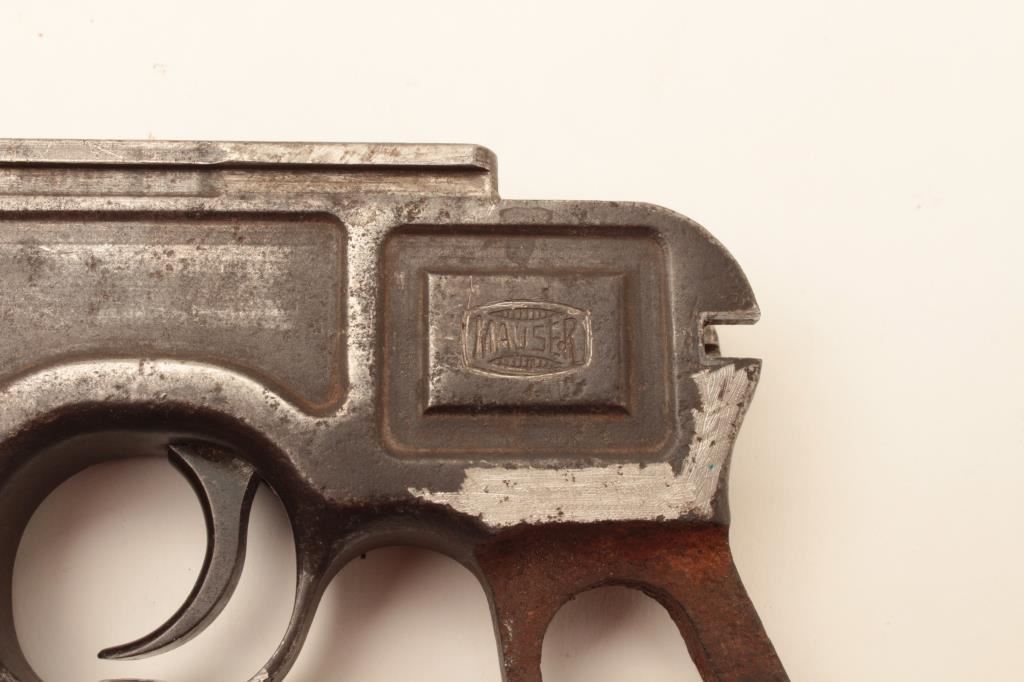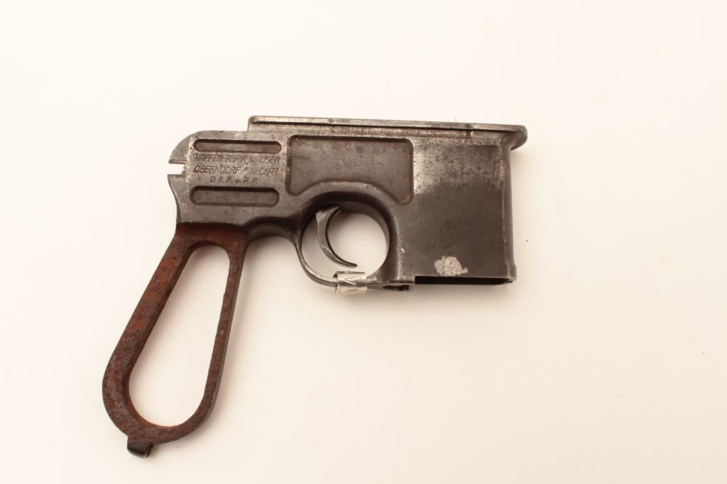 Bolo Mauser C-96 semi-automatic pistol, 9mm caliber, 4” barrel, replaced wood grips, import-marked S/N 449954; overall fair condition showing mixture of dark patina and areas of polished metal surface, working action, good replacement grips; accompanied by a modern tan leather holster in good condition AND an extra Mauser frame only. (C&R/PPT). Est.: $200-$400.