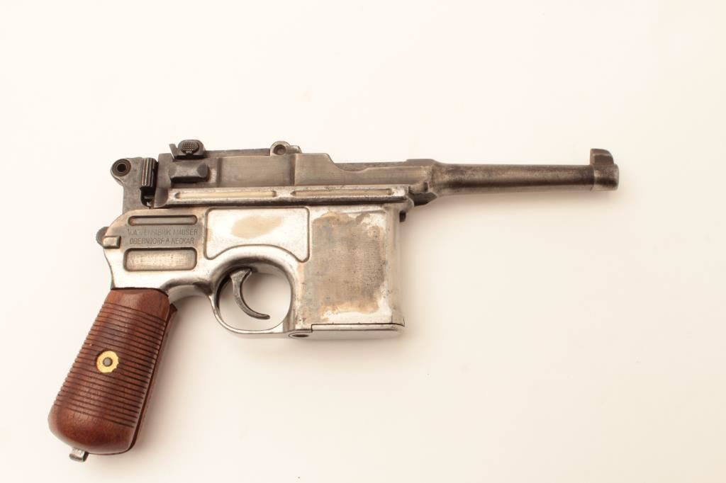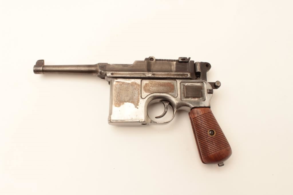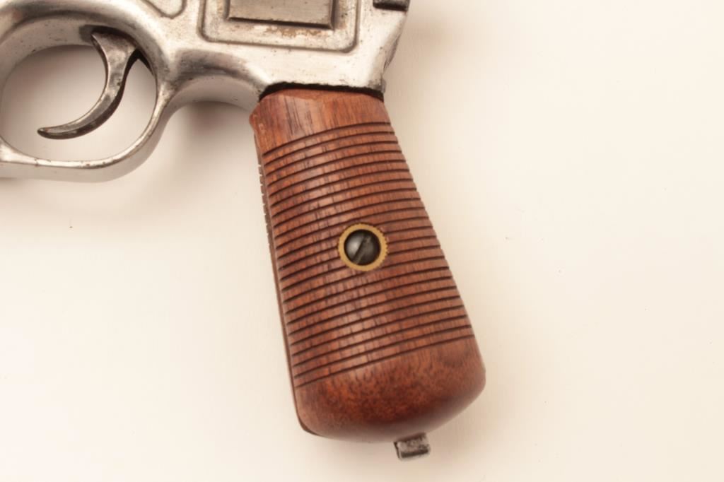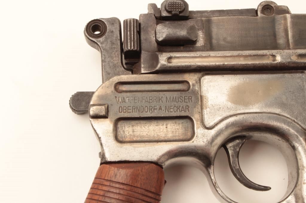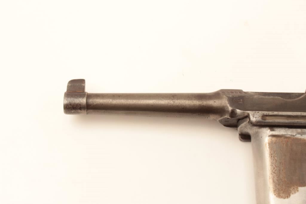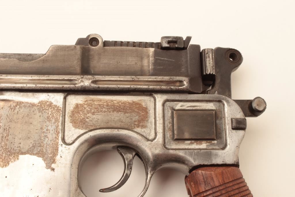 Bolo Mauser C-96 semi-automatic pistol, 9mm caliber, 4” barrel, replaced wood grips, import-marked S/N 449954; overall fair condition showing mixture of dark patina and areas of polished metal surface, working action, good replacement grips; accompanied by a modern tan leather holster in good condition AND an extra Mauser frame only. (C&R/PPT). Est.: $200-$400.