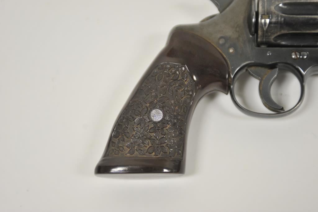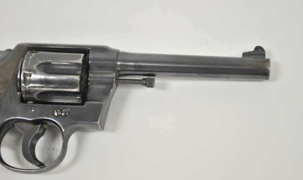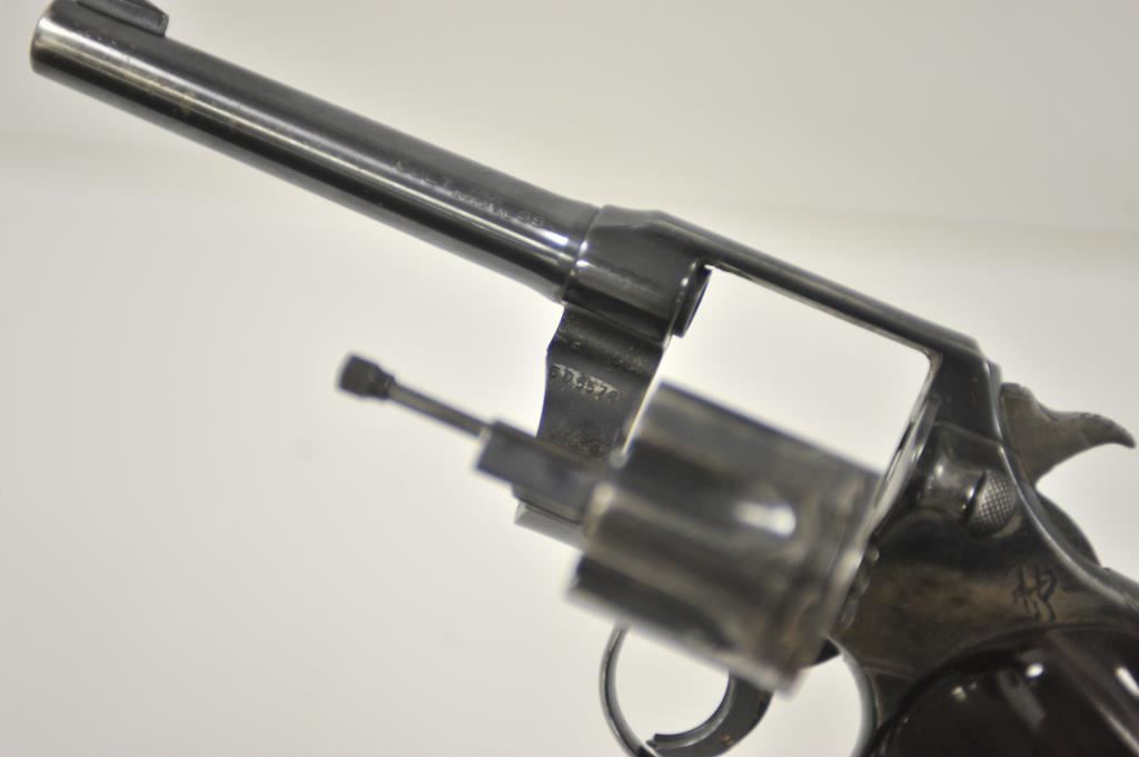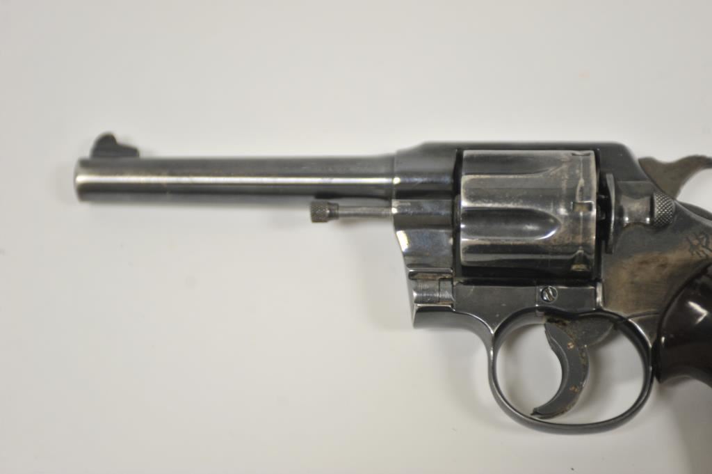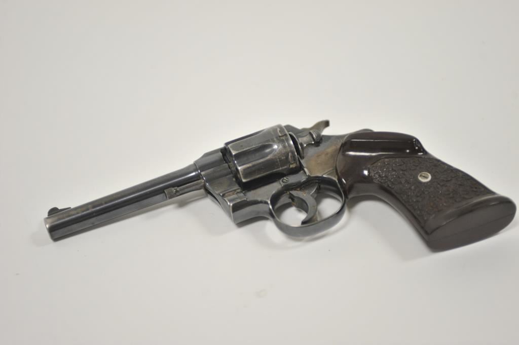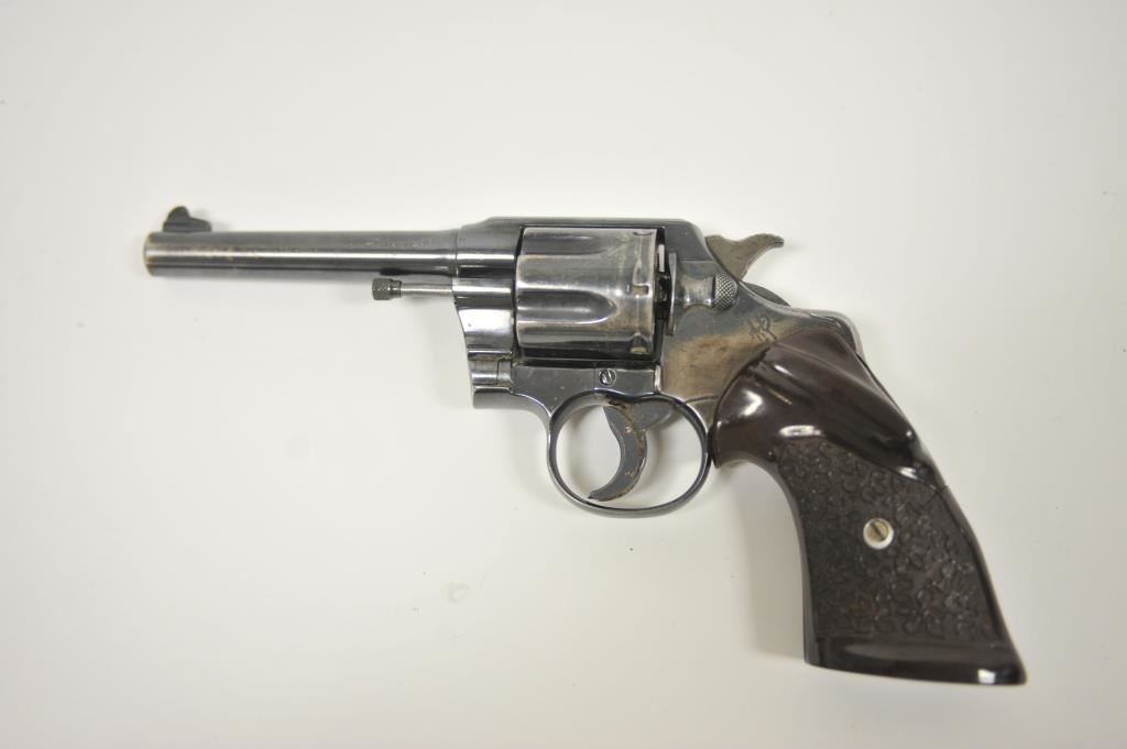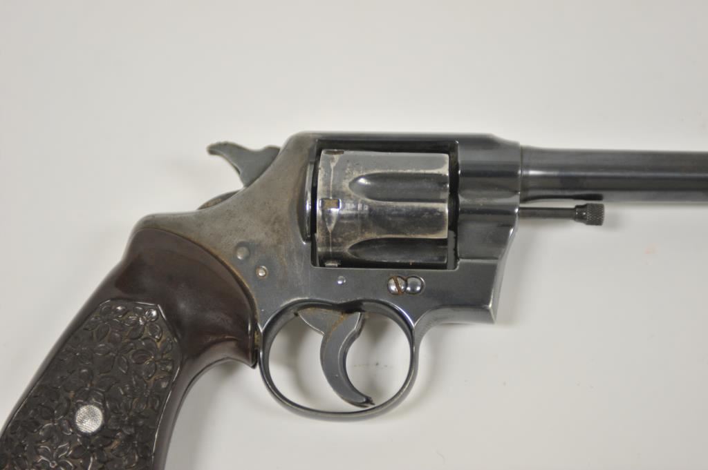 Colt Army Special, #505578, .38 cal, 5" barrel, blued finish, trigger shoe, with target thumb rest grips. Revolver is in fair condition overall, as refinished, good bore, action functions, cylinder does not stay shut. Front sight has been reshaped, crack in left grip panel. (C&R / PPT) Est. $175-350