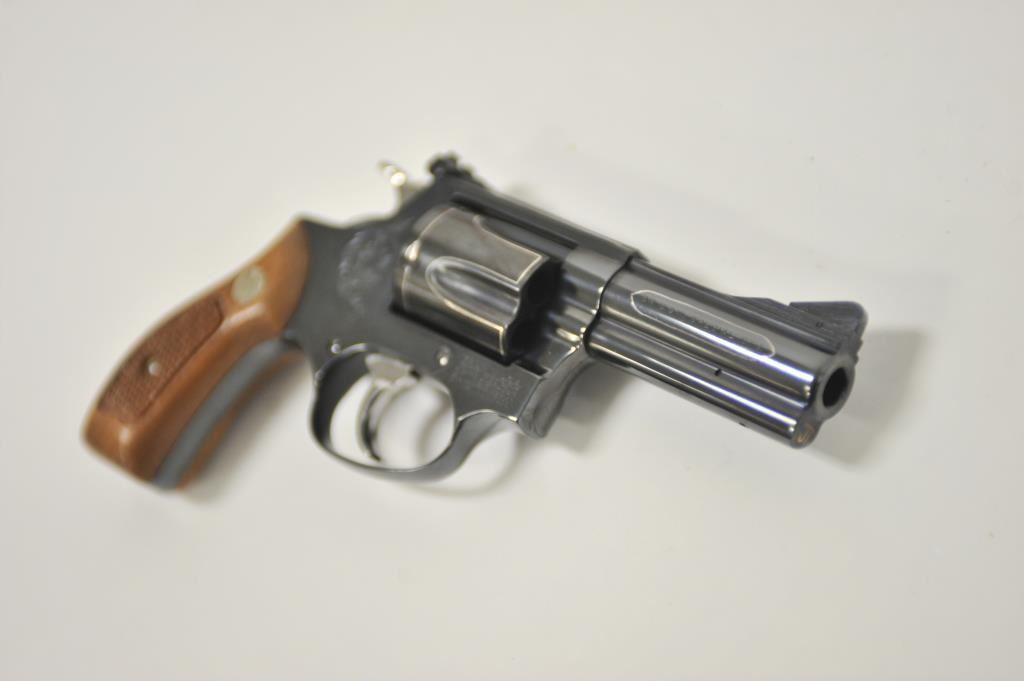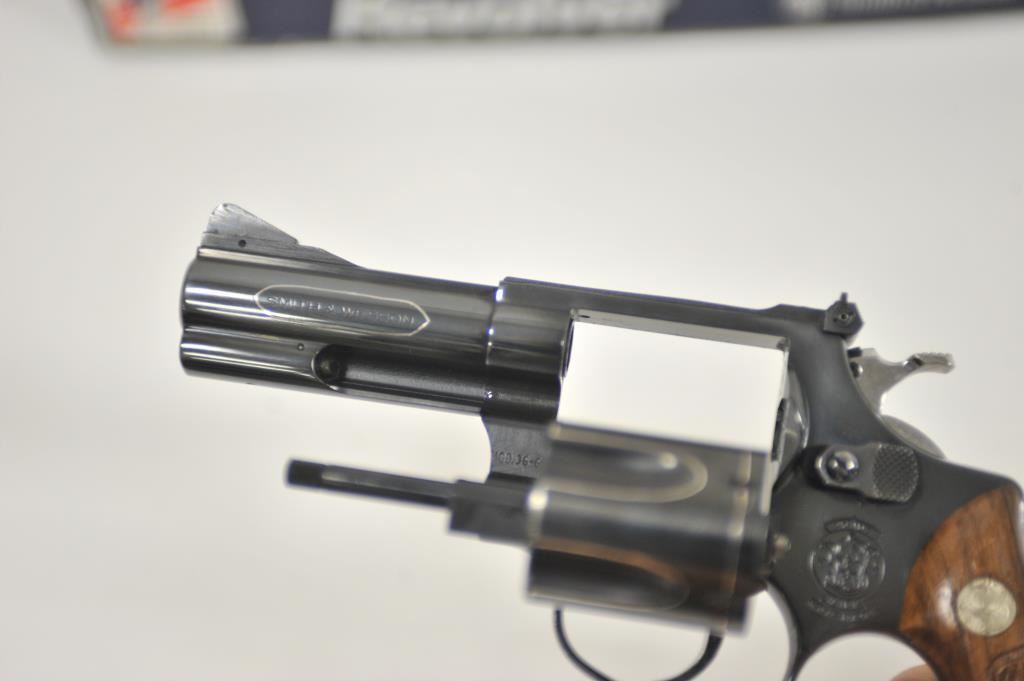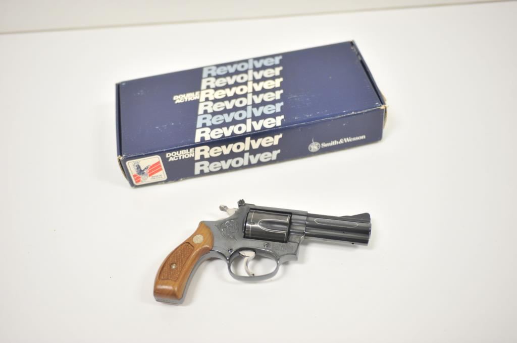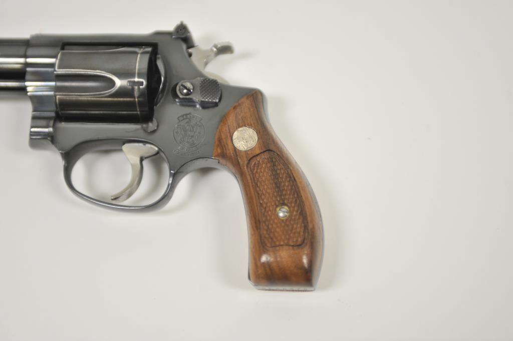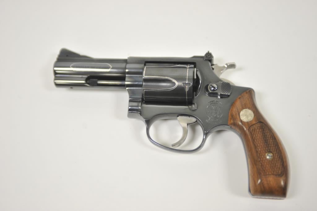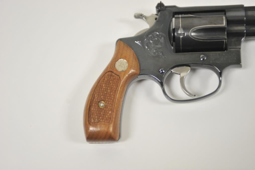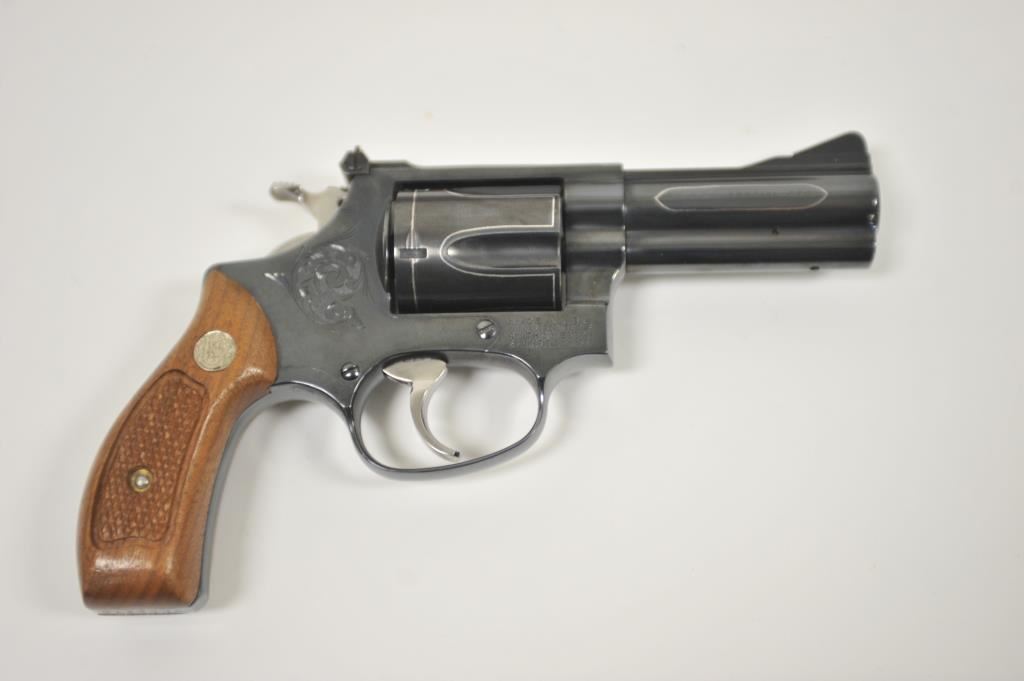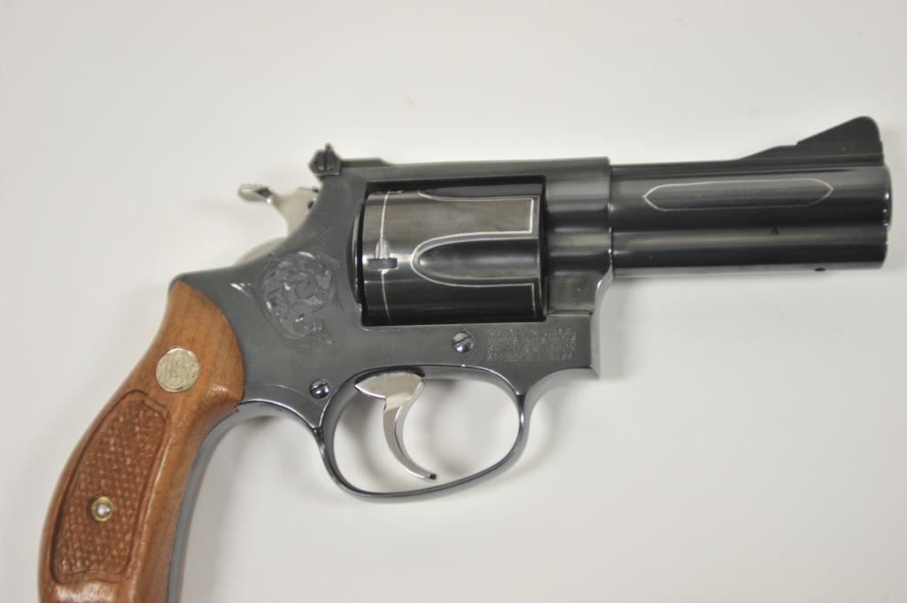 Unique Smith & Wesson 36-6, 3" full lug barrel, #BEA8475, 38 Special cal., blued finish, adjustable sights, polished hammer and trigger, checkered medallion grips. Revolver is in fine condition overall, showing the majority of a quality refinish after being engraved and silver inlaid, the bore is very good plus, the action is finely tuned, the grips are near excellent. The gun has scroll engraving on the sideplate and silver inlay on the cylinder outlining the flutes and where the drag line would be, as well as outlining on the barrel around the factory lettering. There is also a "JT" on the face of the barrel lug in gold. There is some evidence of pitting under the finish logo on the left side. Includes the original one piece blue box showing special order # 9228. (Modern / PPT) Est, $350-700
