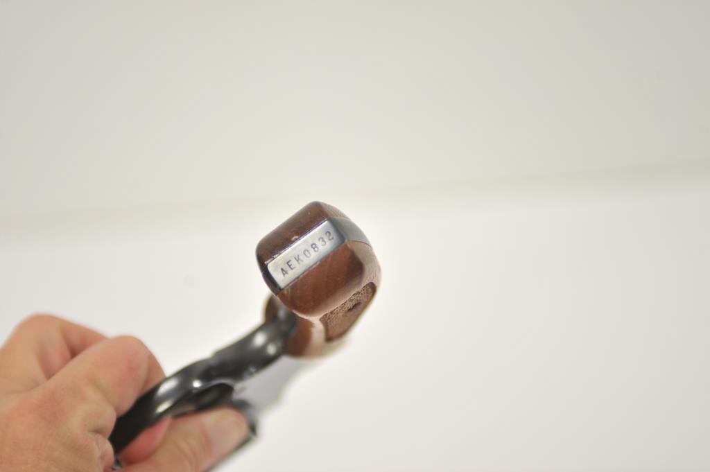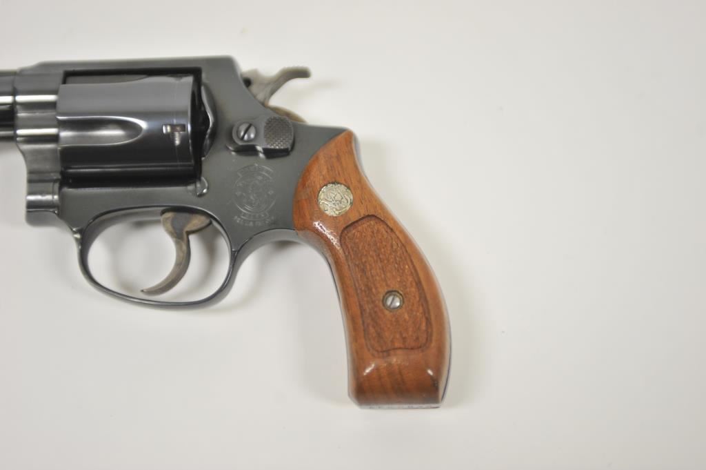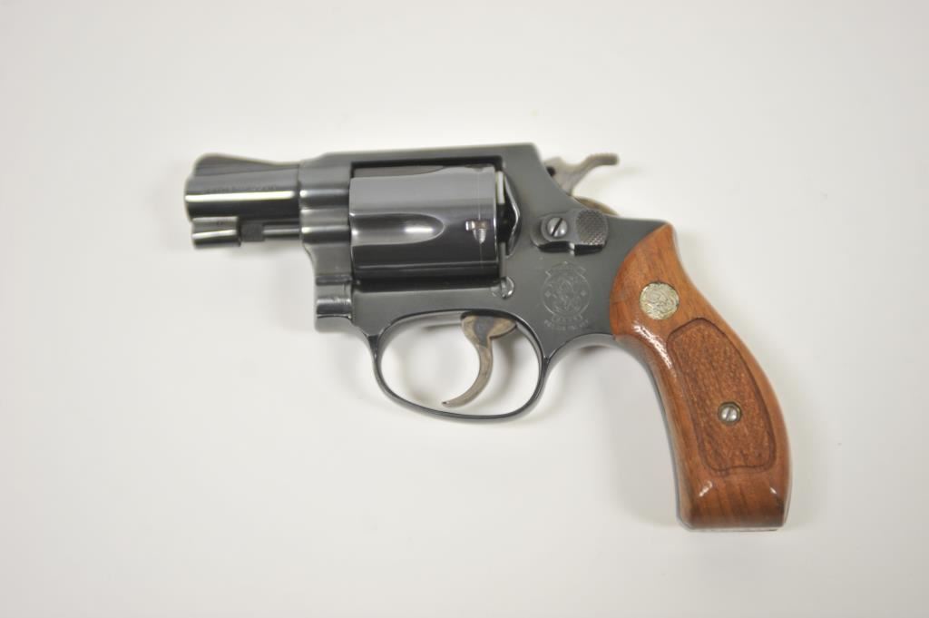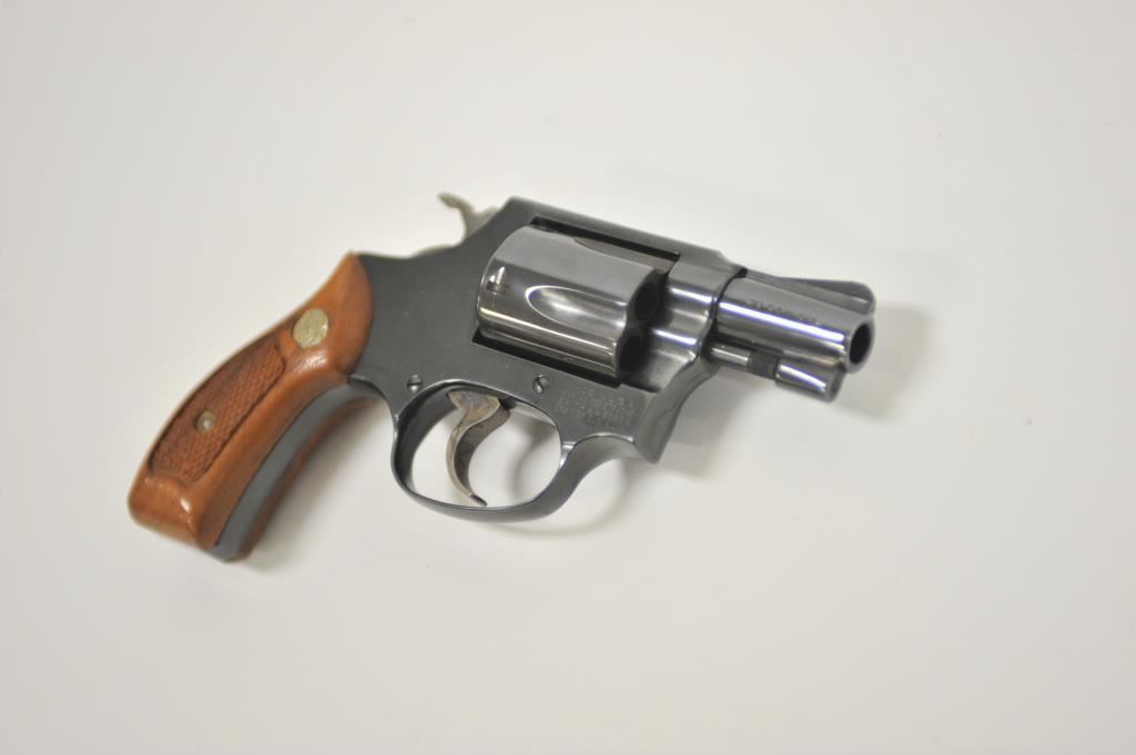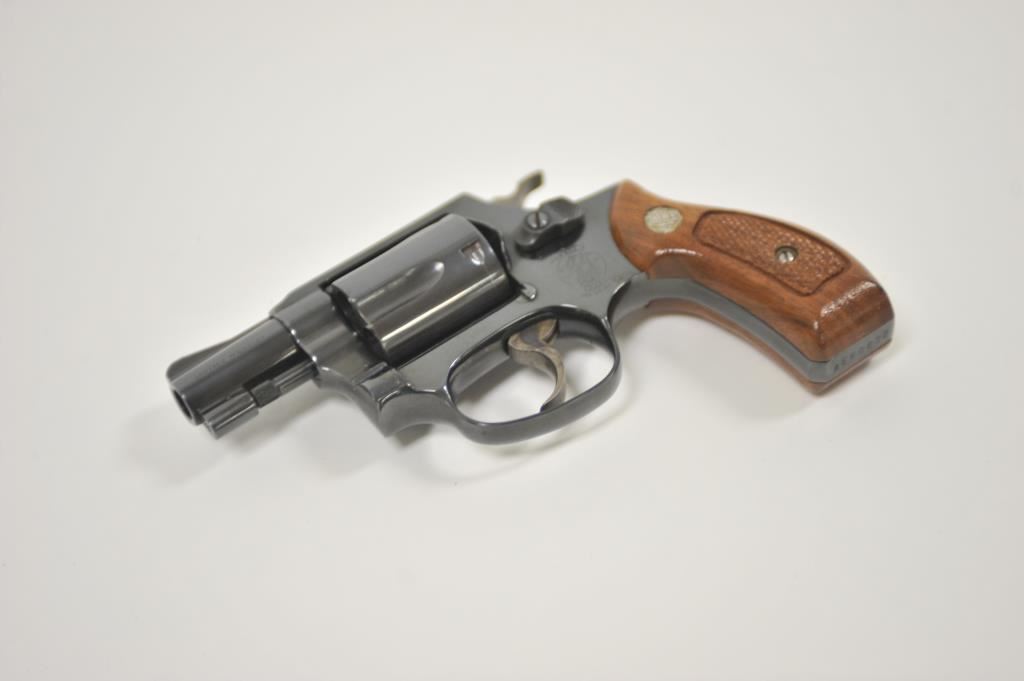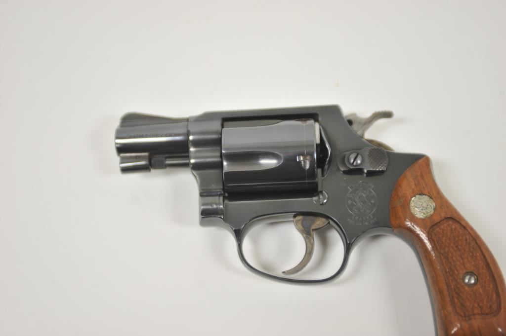 Smith & Wesson 36, #AEK0832, .38 Special cal., 2" barrel, blued finish, fixed sights, checkered medallion grips. Revolver is in very good condition, as refinished showing the majority of it's finish, the bore is good, the action is very good, the grips are fine. (Modern / PPT) Est, $200-400