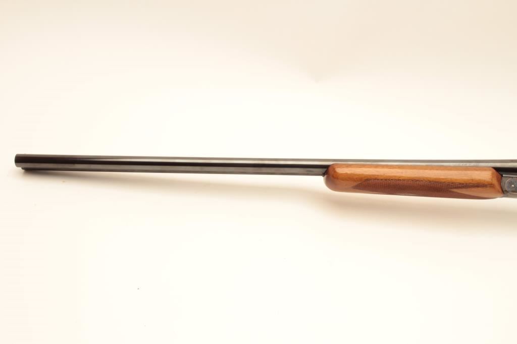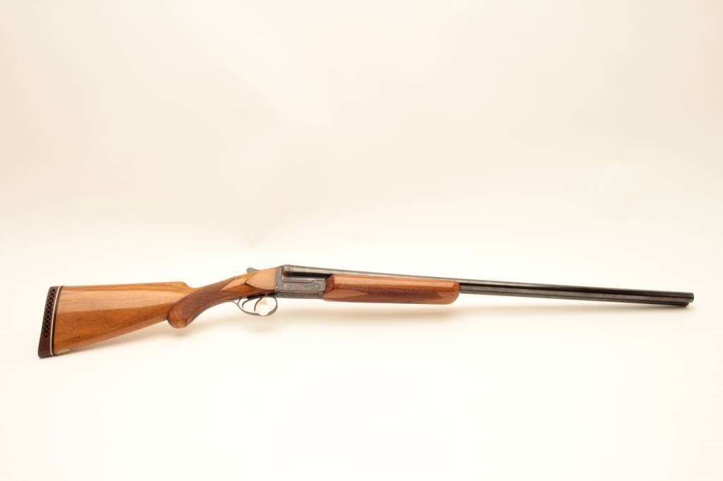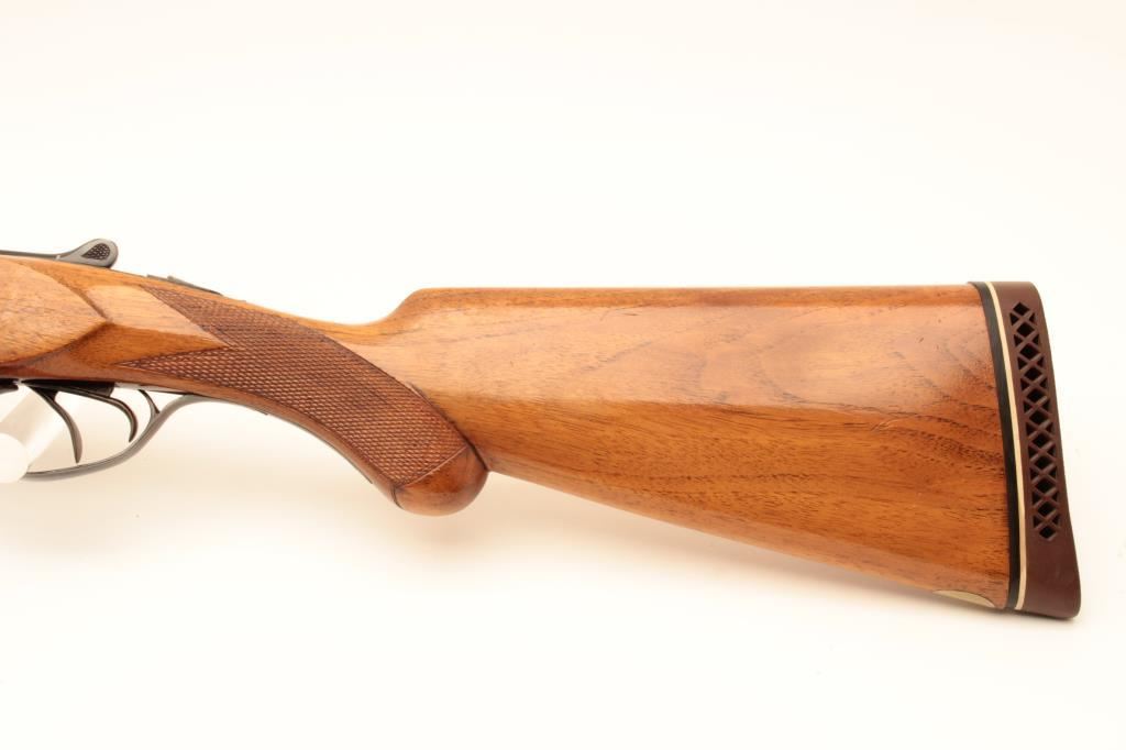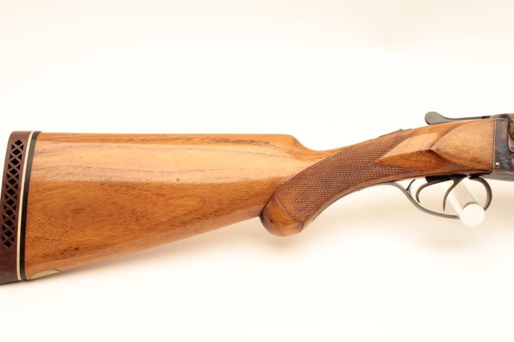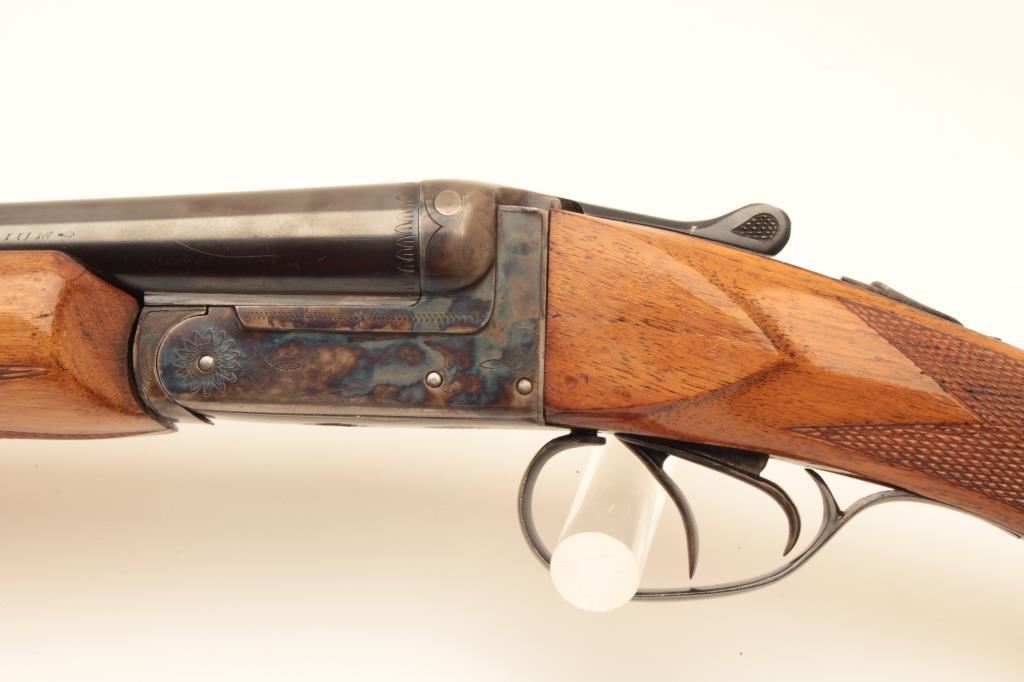 Jansen Fils & Co. Liege Belgium marked SxS 16GA shotgun with 28” barrels choked modified right and extra full left. 90%-95% blue and case hardening remaining. Minor scratches and slight use. Oversize beavertail fore end and pistol grip stock coarsely checkered. Double triggers, standard extractors. Greener type cross bolt. Locks tight with almost fine bores. Measures 14 ½” to the end of thick rubber recoil pad. Shows good quality that Liege is known for. Probably 1950’s-70s period of manufacturing. Est.: $300-$600