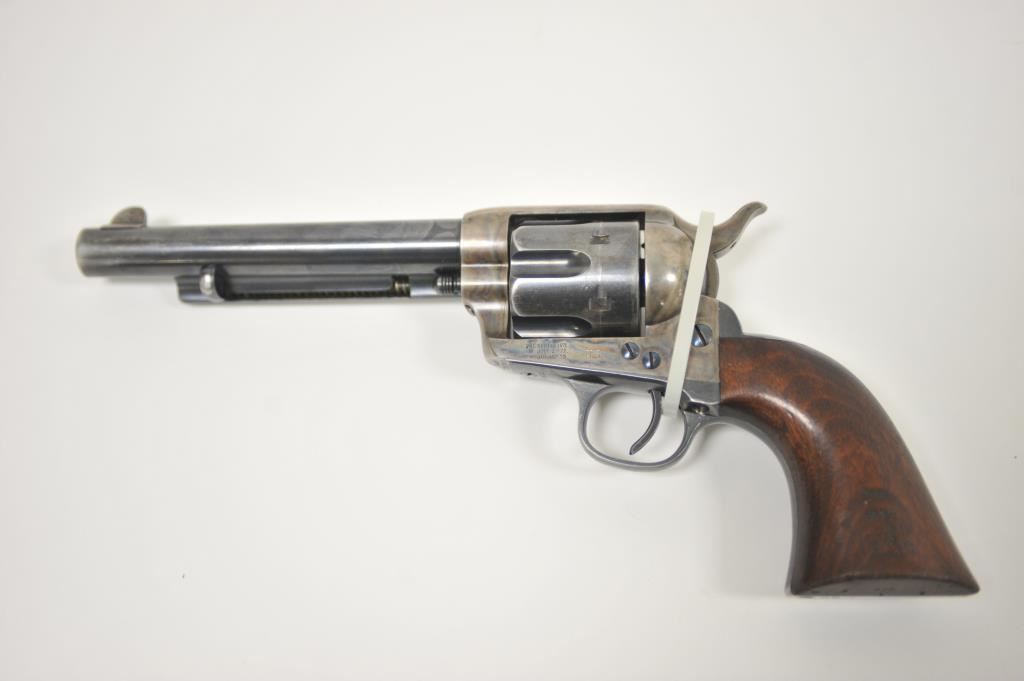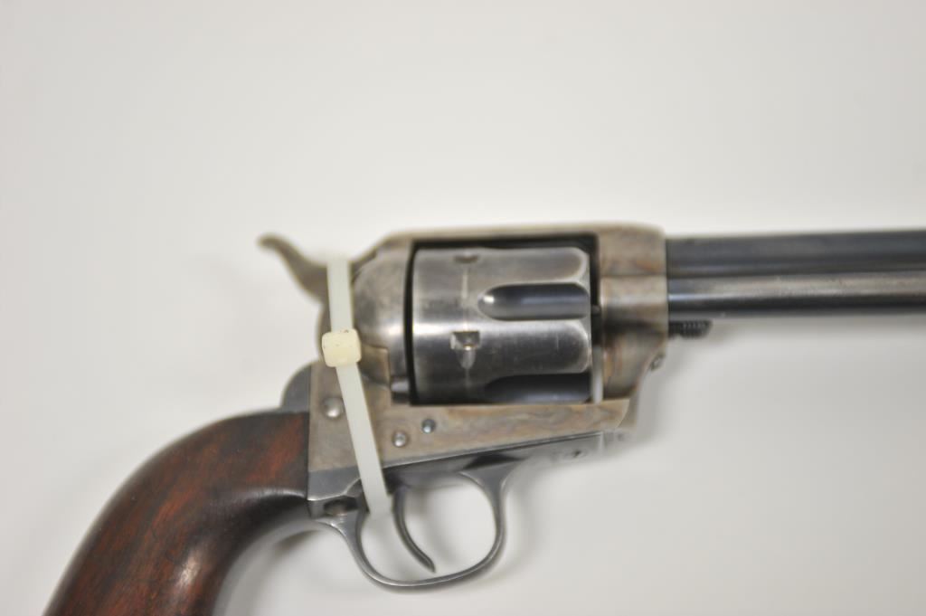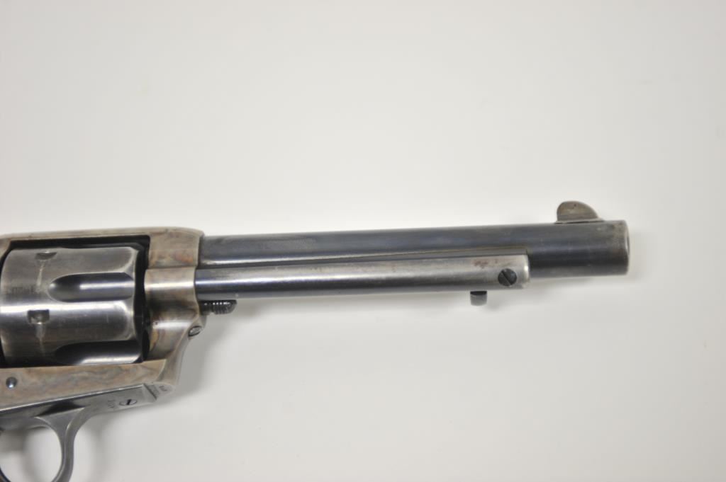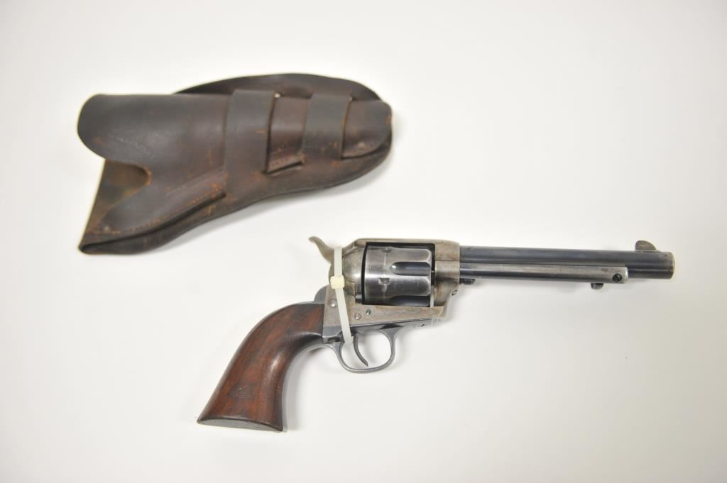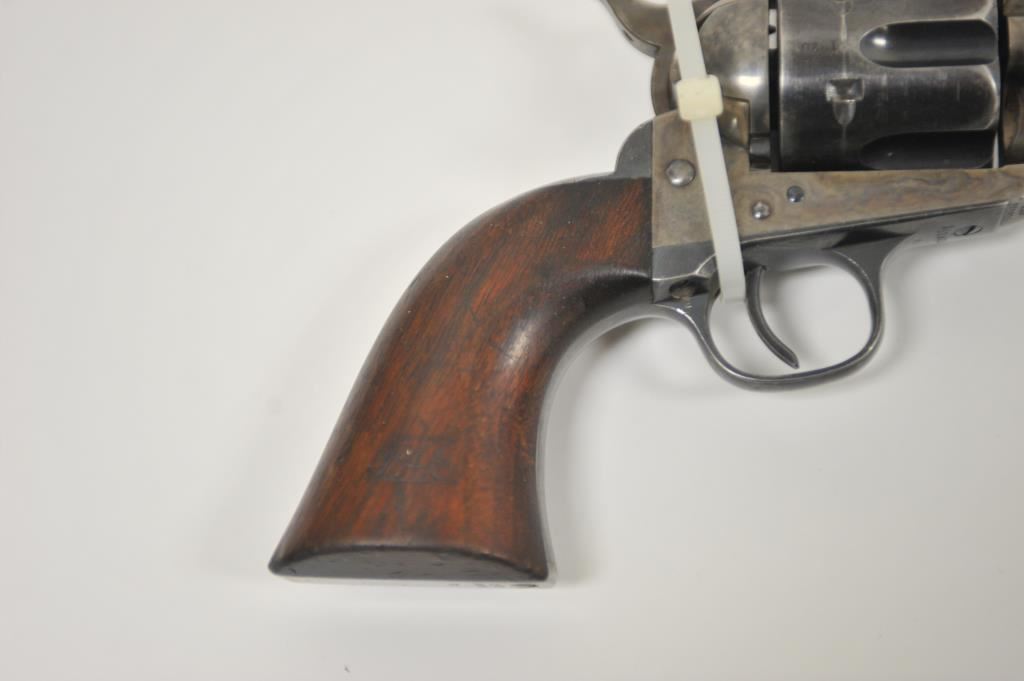 Newly discovered Colt U.S. Model Single Action revolver in .45 Colt caliber with barrel reduced to 6” and all matching serial numbers 131920. R.A.C. inspection with excellent cartouched grips dated 1890. The barrel was shortened and original front sight carefully dove tailed in the barrel. 90%-95% plus bright original blue and fiery case hardening. The interior is excellent and the bore is bright. The action is working but not holding on full cock. “R.A.C.” marked and proofed barrel (cannot remove ejector hosing but fits like a glove and do not want to mar). Bright blue on the screws. With double loop holster it was carried in north of Sacrament in ranching area. Note: Serial number 131928 went to Cebu Police in Philippines also near Rough Rider and New York Militia arms listed in Kopec and Fenn book. Factory letter states; .45 caliber, barrel not listed, blue finish, stocks not listed, sold to U.S. Government, Delivered to inspector at Colt plant, April 30, 1890, 300 guns in shipment. (Antique) Est.: $5,000-$10,000