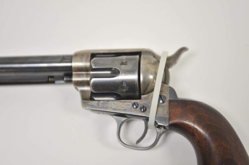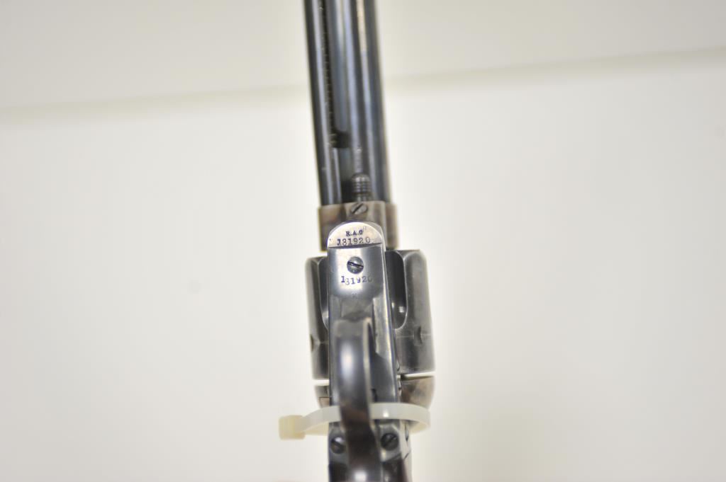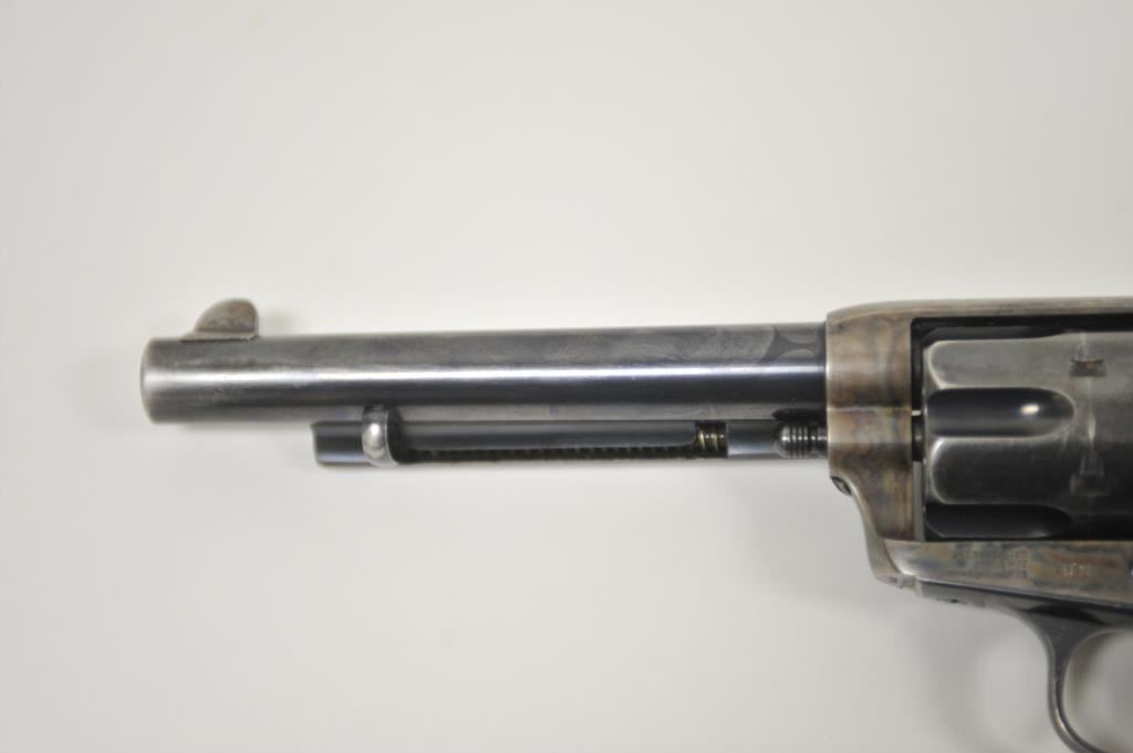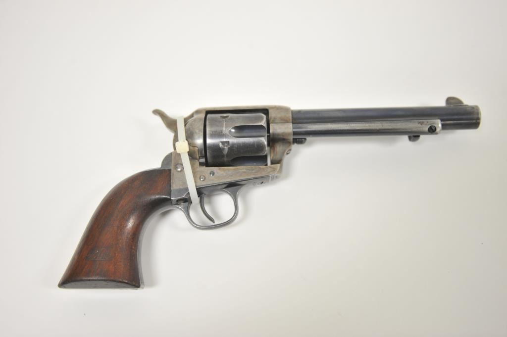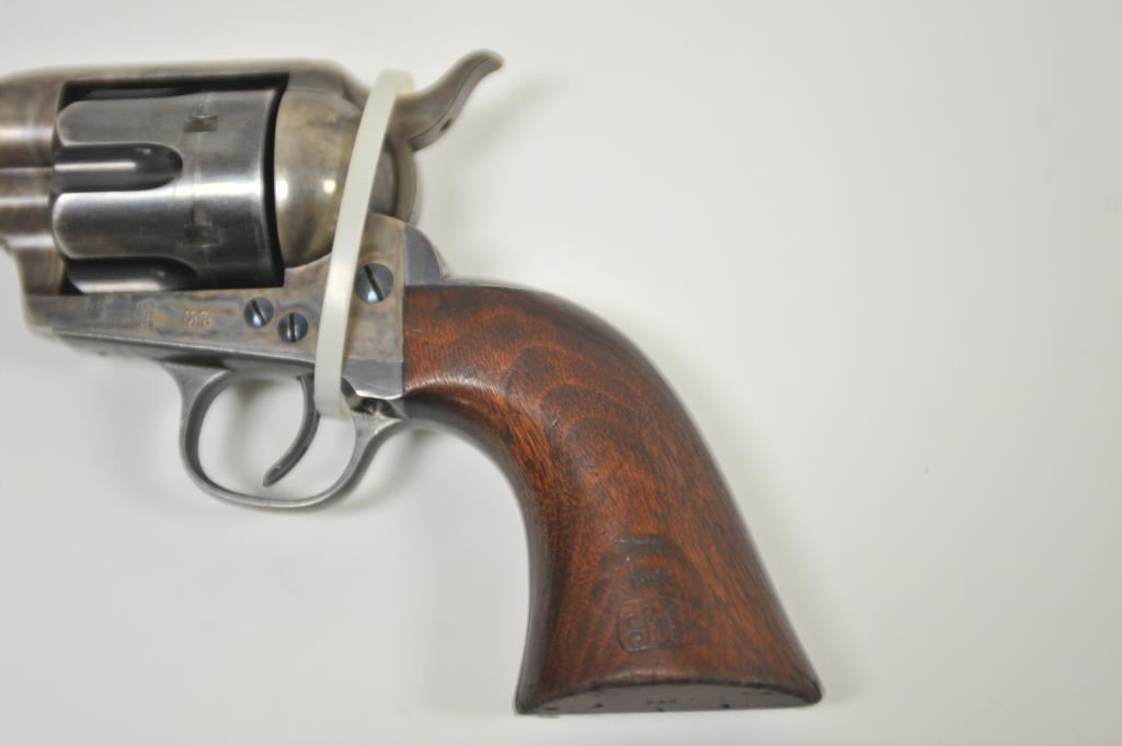 Newly discovered Colt U.S. Model Single Action revolver in .45 Colt caliber with barrel reduced to 6” and all matching serial numbers 131920. R.A.C. inspection with excellent cartouched grips dated 1890. The barrel was shortened and original front sight carefully dove tailed in the barrel. 90%-95% plus bright original blue and fiery case hardening. The interior is excellent and the bore is bright. The action is working but not holding on full cock. “R.A.C.” marked and proofed barrel (cannot remove ejector hosing but fits like a glove and do not want to mar). Bright blue on the screws. With double loop holster it was carried in north of Sacrament in ranching area. Note: Serial number 131928 went to Cebu Police in Philippines also near Rough Rider and New York Militia arms listed in Kopec and Fenn book. Factory letter states; .45 caliber, barrel not listed, blue finish, stocks not listed, sold to U.S. Government, Delivered to inspector at Colt plant, April 30, 1890, 300 guns in shipment. (Antique) Est.: $5,000-$10,000