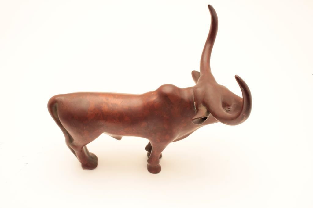 Asian cast alloy art sculpture of water buffalo measuring 10” in height by 8” across horns. This alloy goes back many ages and contains copper, bronze and aluminum in certain stages and proportions to get red cast. Never attempted in the west to our knowledge. Collected 40 years ago in Asia. Est.: $250-$500