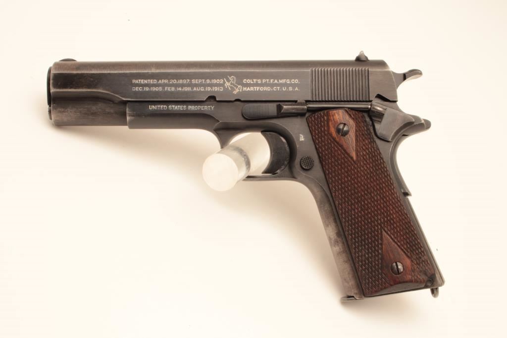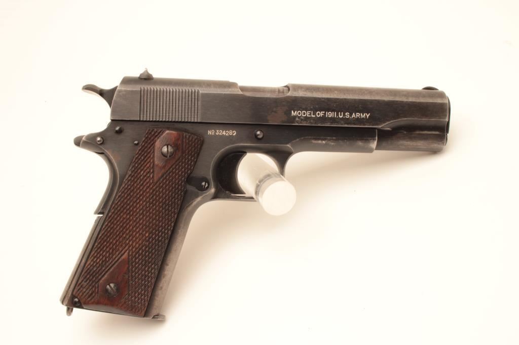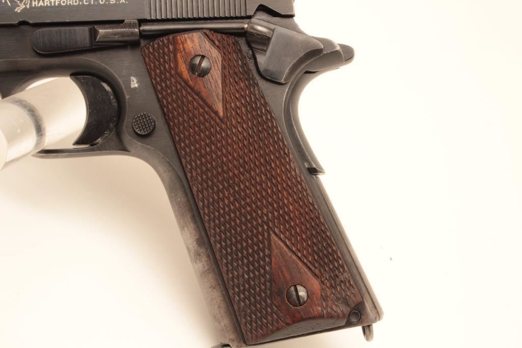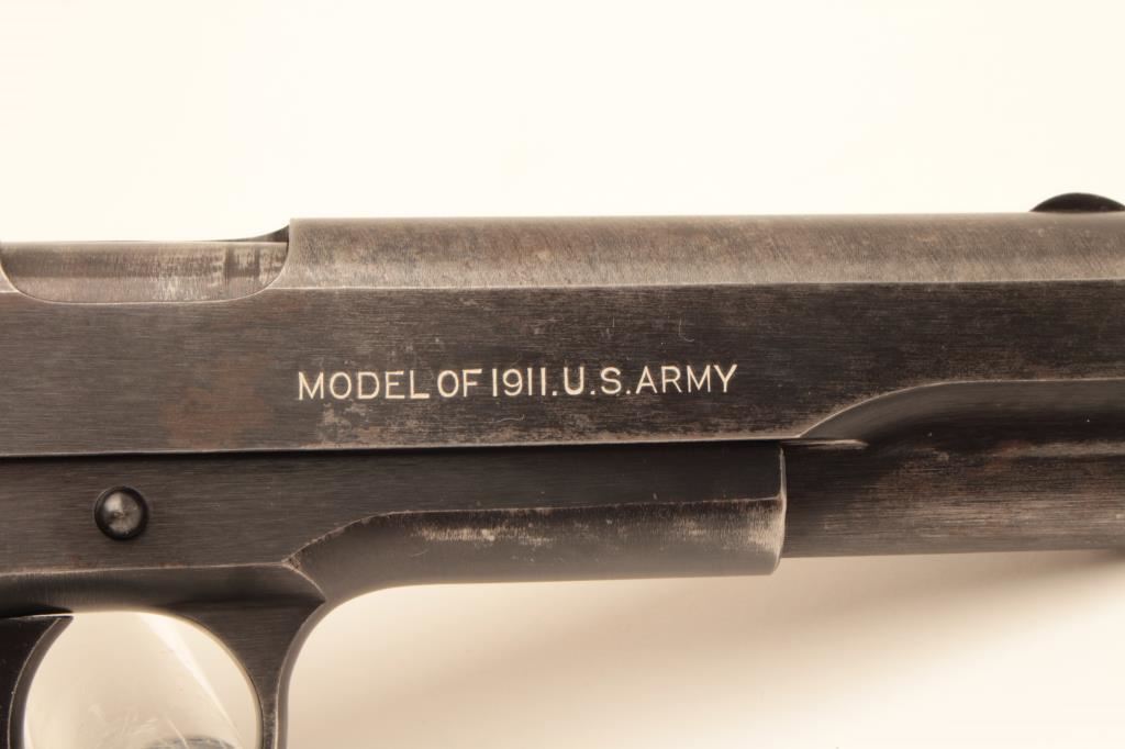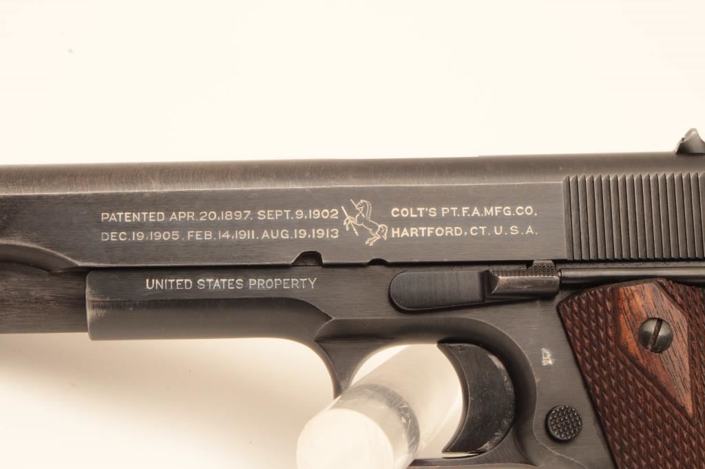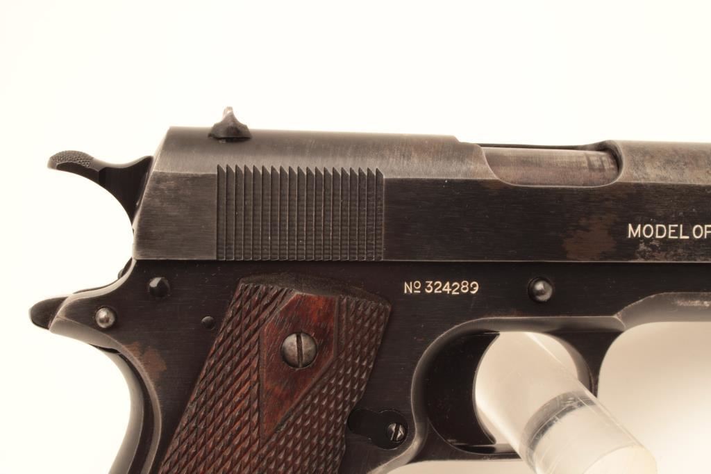 Colt Model 1911 U.S. Property marked .45 caliber semi-auto pistol, S/N 324289. Very good original condition with 60%-80% original war time dark blue finish (so called black army). Minor erosion on the straps and even loss of finish. Springfield eagle proof on the frame (S14) “P” and “H” proof on the barrel. Good original diamond checkered wood grips. Two tone original mag. Good bore. A very acceptable WWI Colt over 100 years old. (C&R/PPT) Est.: $1250-$2500