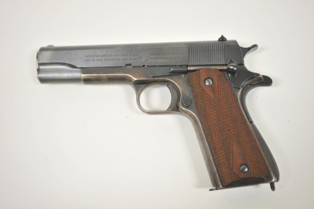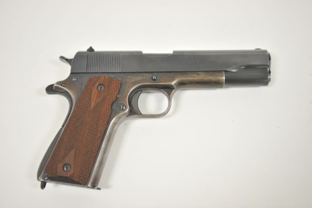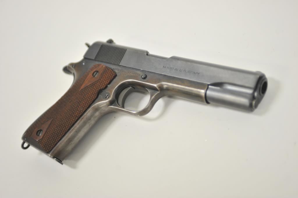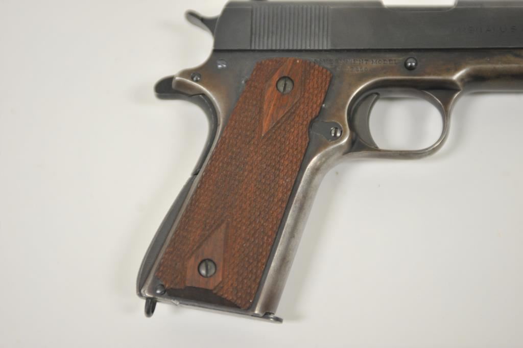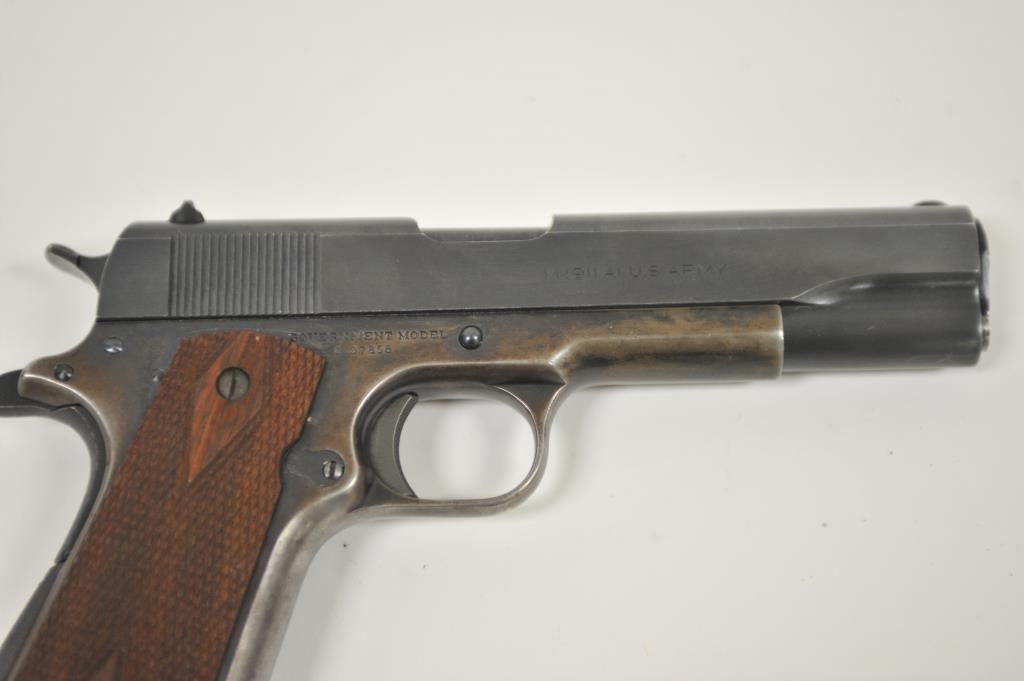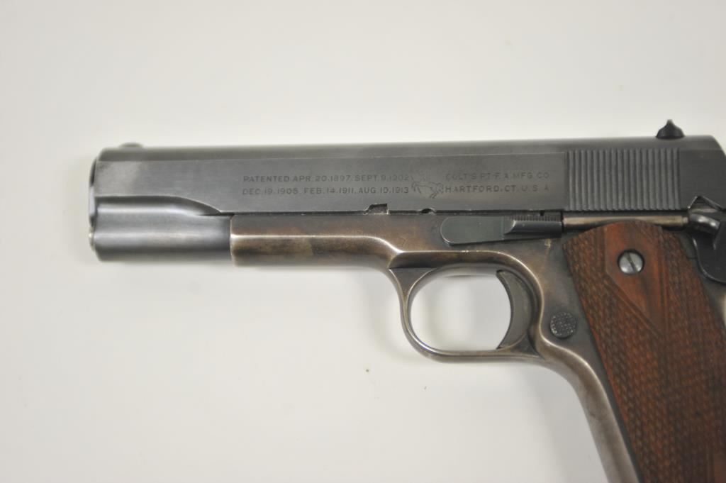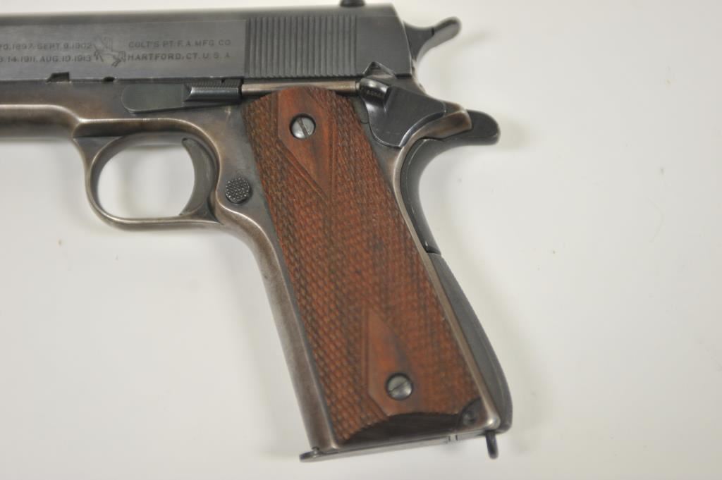 Colt Model 1911 .45 caliber semi-Auto S/N C97856. The slide and barrel are near fine with 95% plus original finish with some loss at the chamber end of the barrel primarily. The bore is bright. The hammer and safeties show most of their bright finish. The frame has drifted to 20%-30% blue. The mainspring housing has been changed and the grips are not Colt products but diamond checkered wood. WWII era blue mag included. The top end of this Colt is gorgeous! (C&R/PPT) Est.: $700-$1400