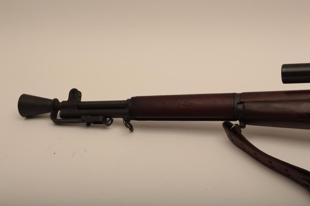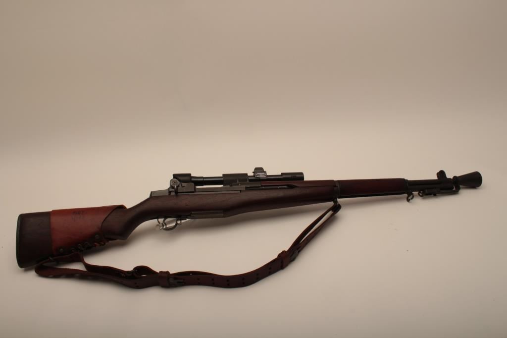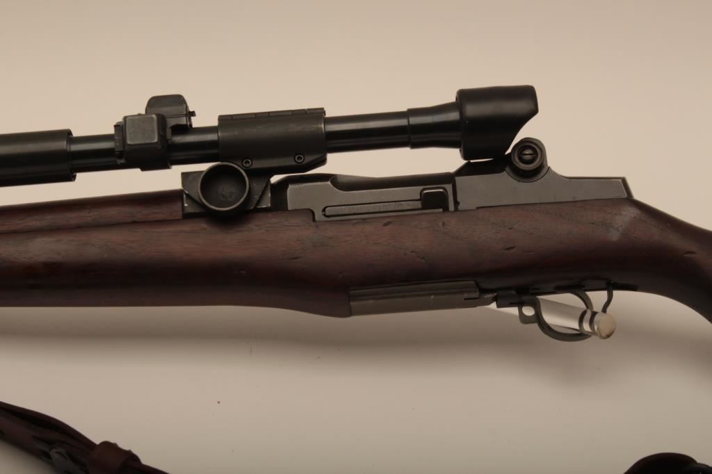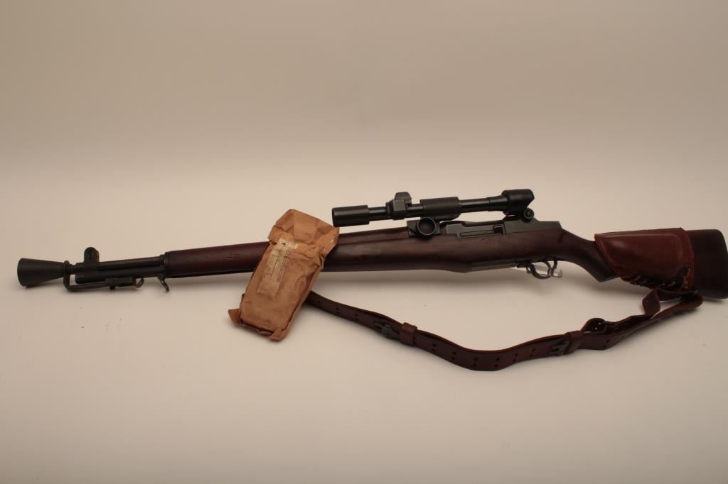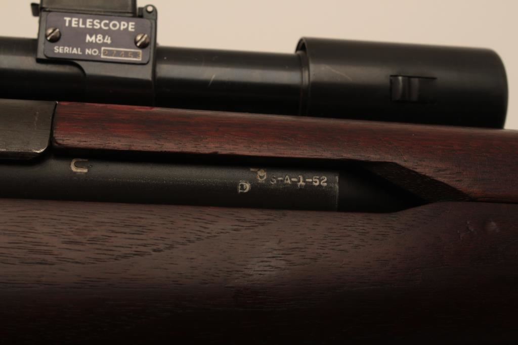 Springfield M1-D Garand .30-06 sniper rifle, S/N 3470803. The barrel is dated 1-52 (Korean era). The throat erosion is rated (2) and the muzzle (O). M-84 scope and all correct military issue. Good to very good condition. āPā proof on the inside of pistol grip. The bore is bright. Military style red paint with white numeral 3. Cheek piece flash hider and sling are included. A good example. (C&R) Est.: $1750-$3500