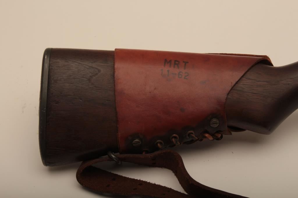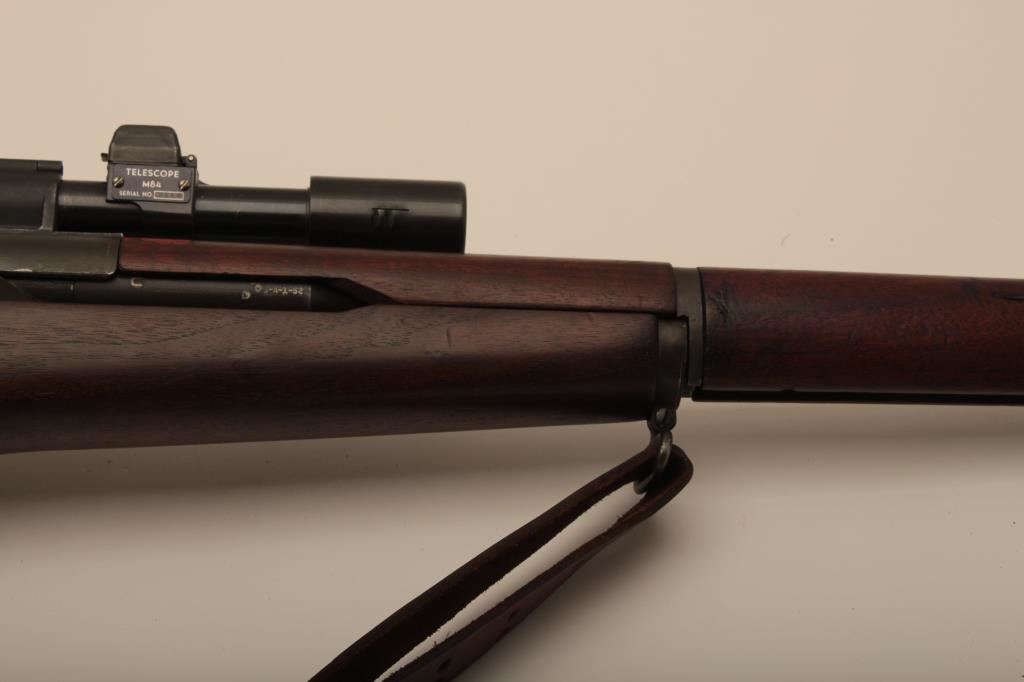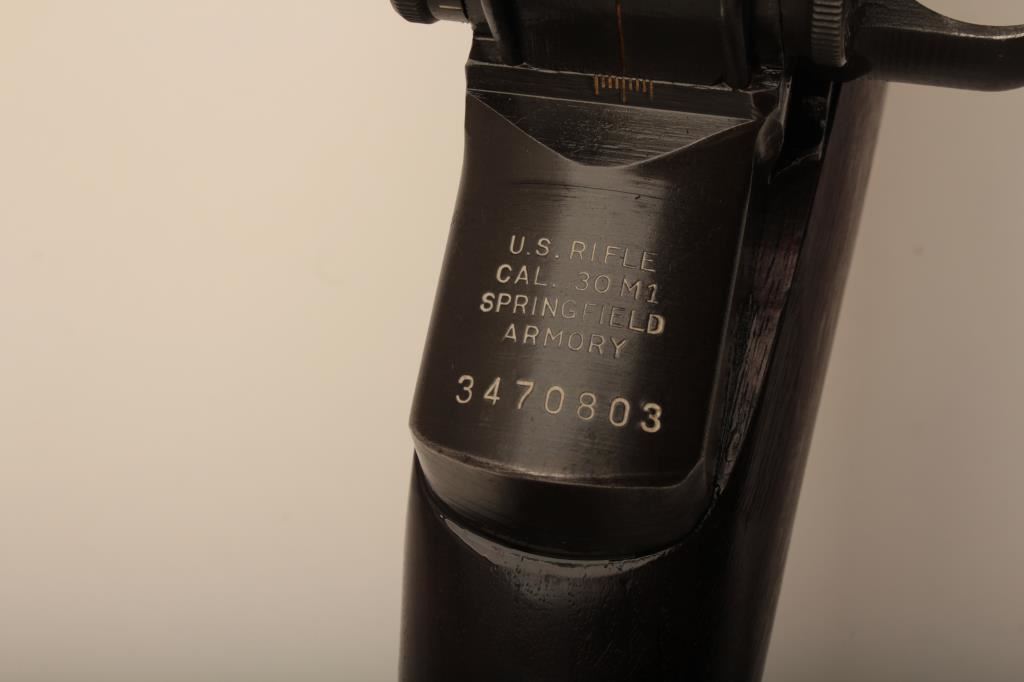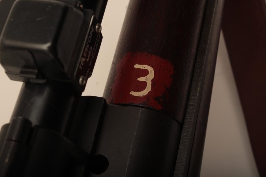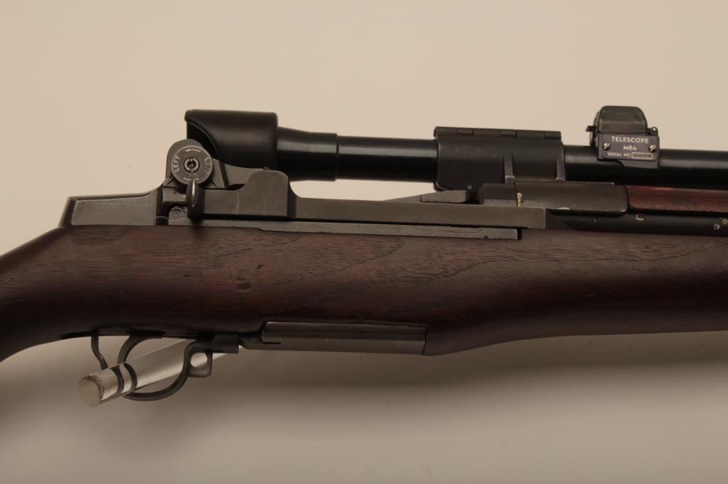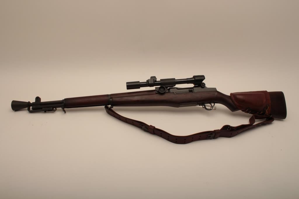 Springfield M1-D Garand .30-06 sniper rifle, S/N 3470803. The barrel is dated 1-52 (Korean era). The throat erosion is rated (2) and the muzzle (O). M-84 scope and all correct military issue. Good to very good condition. āPā proof on the inside of pistol grip. The bore is bright. Military style red paint with white numeral 3. Cheek piece flash hider and sling are included. A good example. (C&R) Est.: $1750-$3500