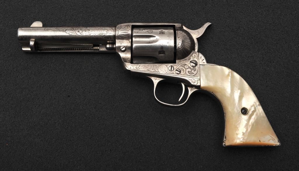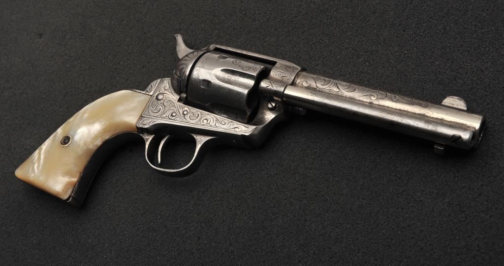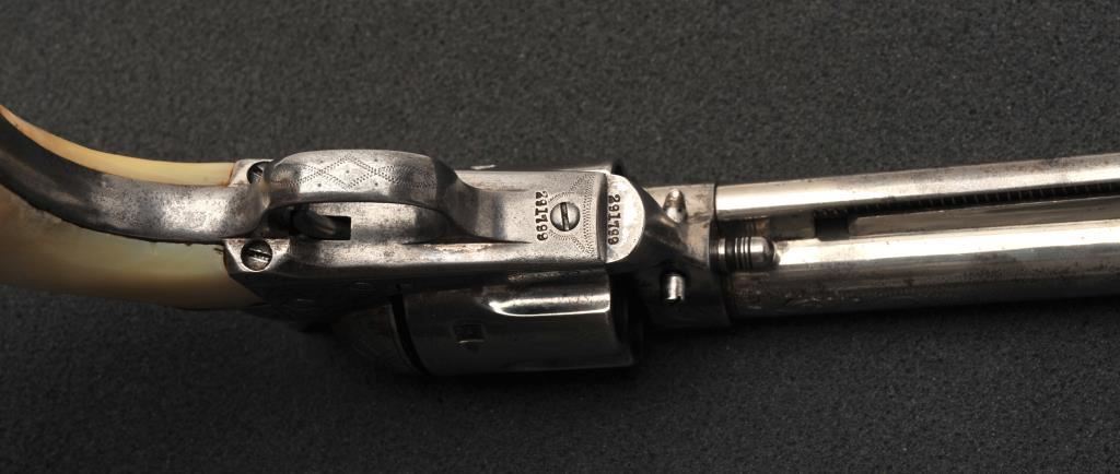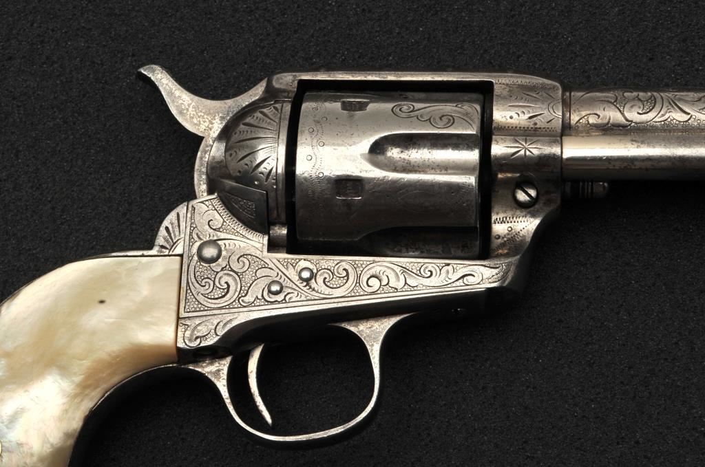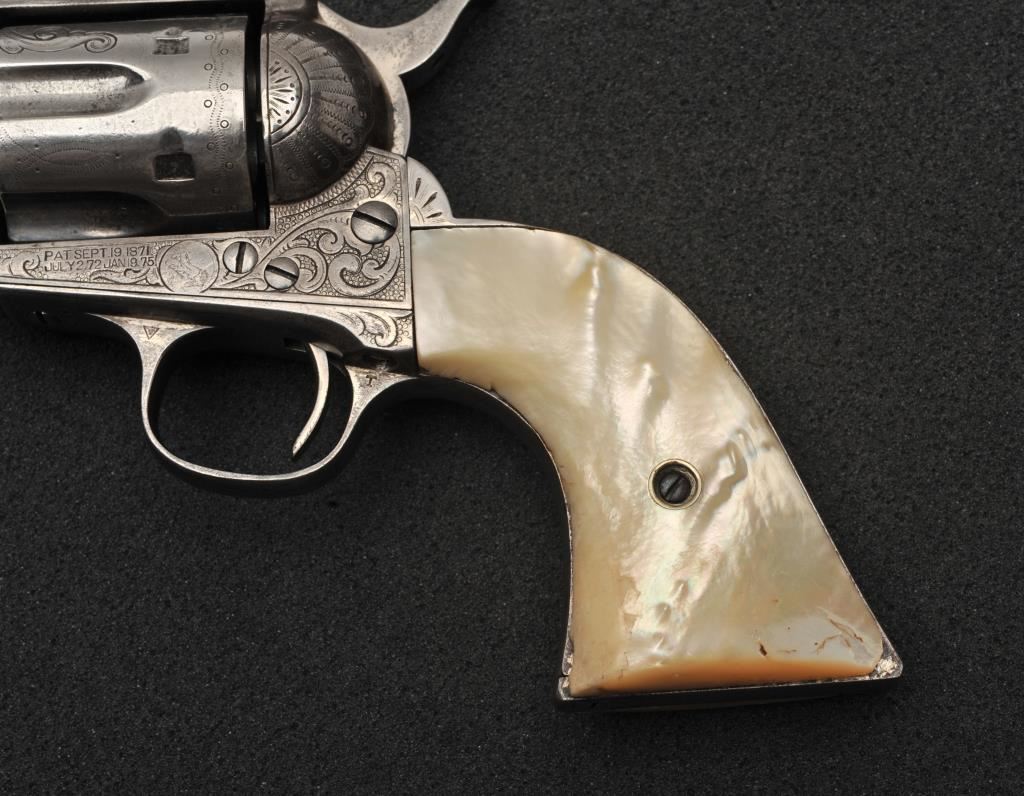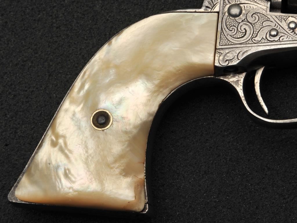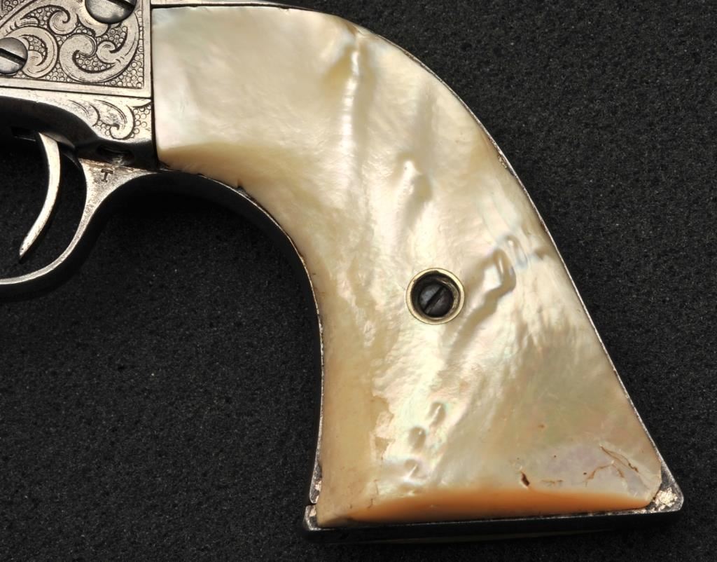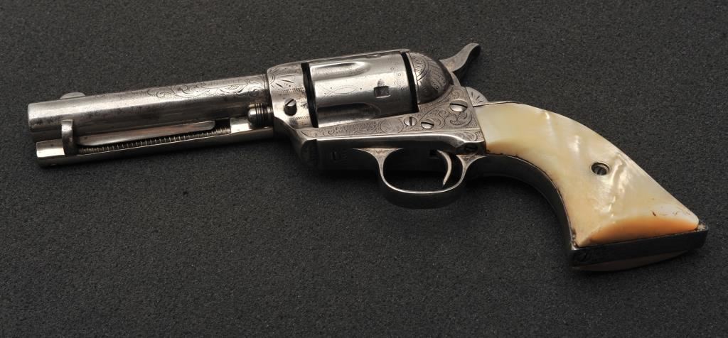 Colt Single Action Army revolver in .45 Colt caliber with a 4 ¾” barrel, nickel finish, pearl grips, and factory engraved shipped to H&D Folsom Arms, Co., New York, N.Y., April 6, 1907, 4 guns in shipment. All features verified by factory letter (Included) except stocks “Not Listed”. This Colt remains in original good to vry good condition with 10%-20% original nickel mostly drifted and lightly cleaned to gray metal patina. Good edges and slightly light markings. All matching visible numbers. The grips are slightly undersized with small losses and chips but definitely of same era. The front sight has been slimmed very slightly. Good action and good overall. Classic engraving pattern. (C&R/No PPT) Est.: $6,000-$12,000