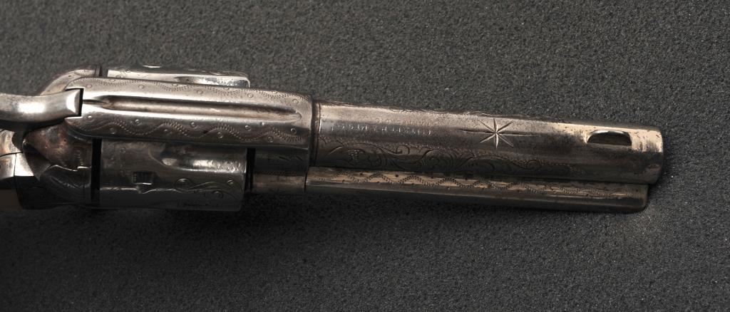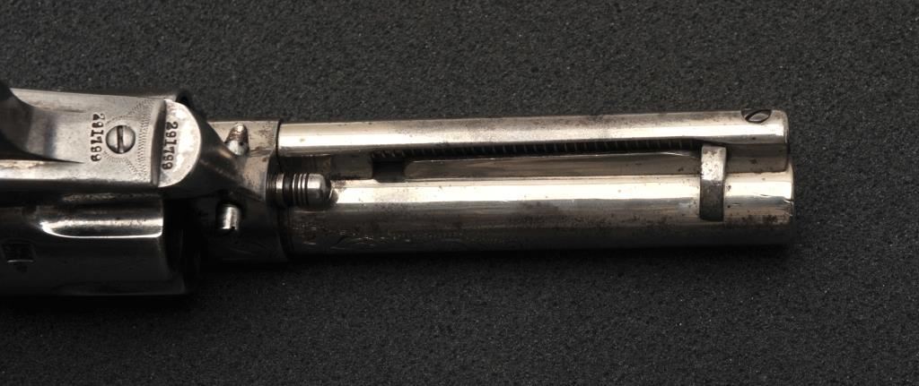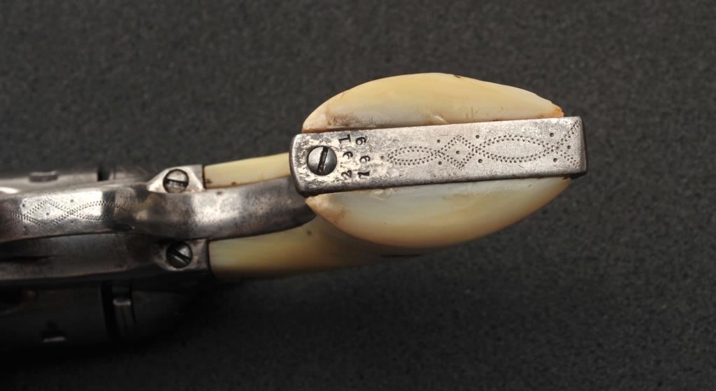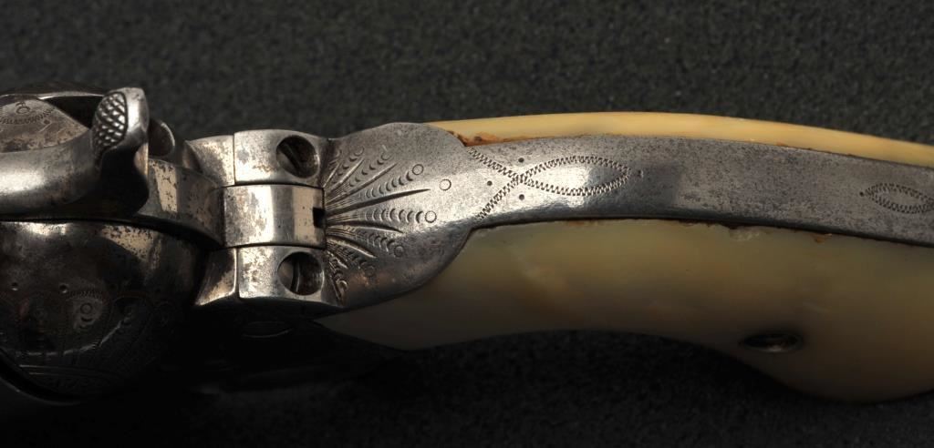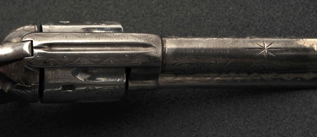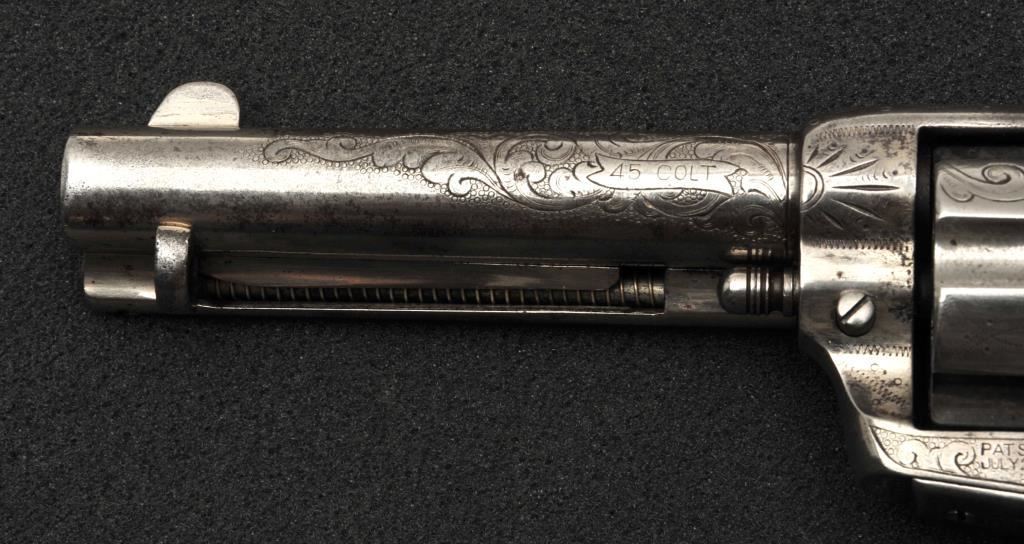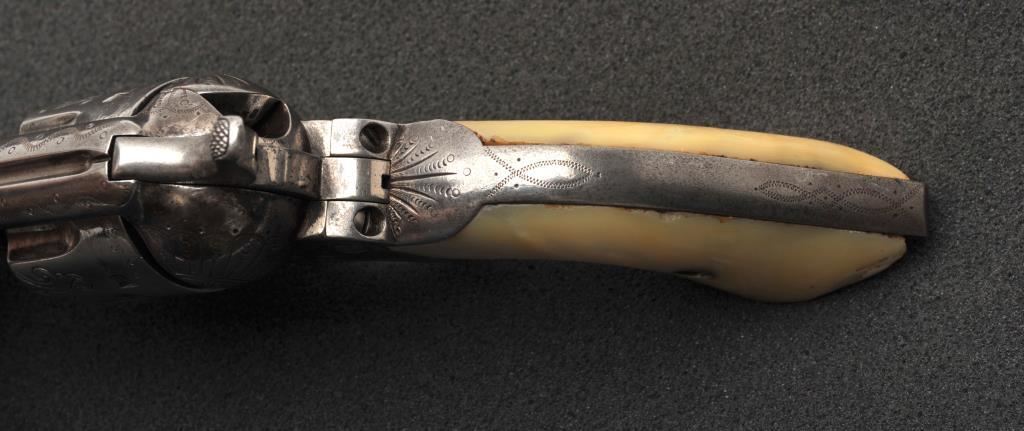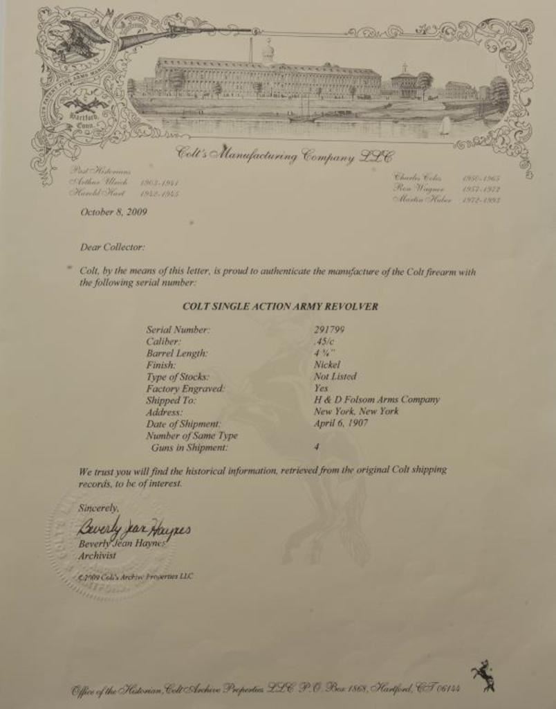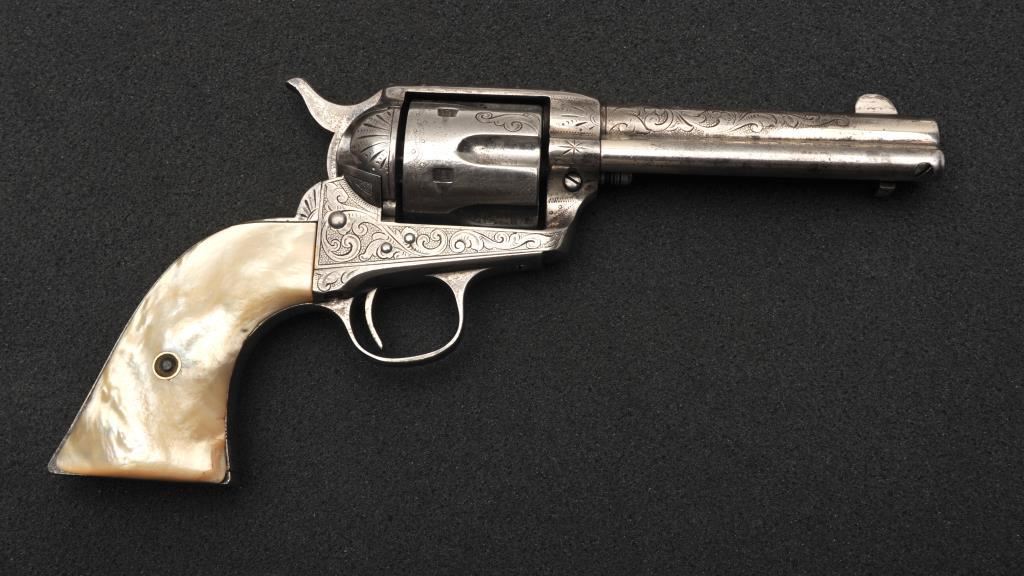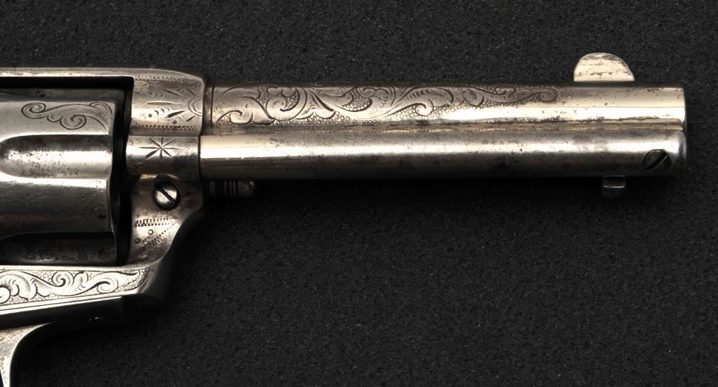 Colt Single Action Army revolver in .45 Colt caliber with a 4 ¾” barrel, nickel finish, pearl grips, and factory engraved shipped to H&D Folsom Arms, Co., New York, N.Y., April 6, 1907, 4 guns in shipment. All features verified by factory letter (Included) except stocks “Not Listed”. This Colt remains in original good to vry good condition with 10%-20% original nickel mostly drifted and lightly cleaned to gray metal patina. Good edges and slightly light markings. All matching visible numbers. The grips are slightly undersized with small losses and chips but definitely of same era. The front sight has been slimmed very slightly. Good action and good overall. Classic engraving pattern. (C&R/No PPT) Est.: $6,000-$12,000