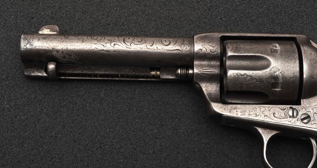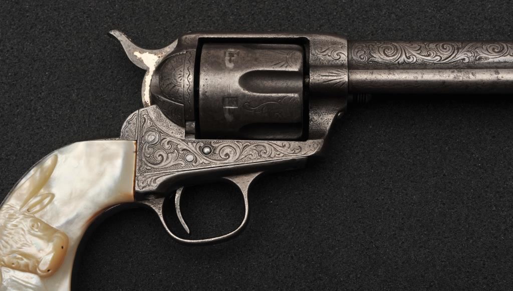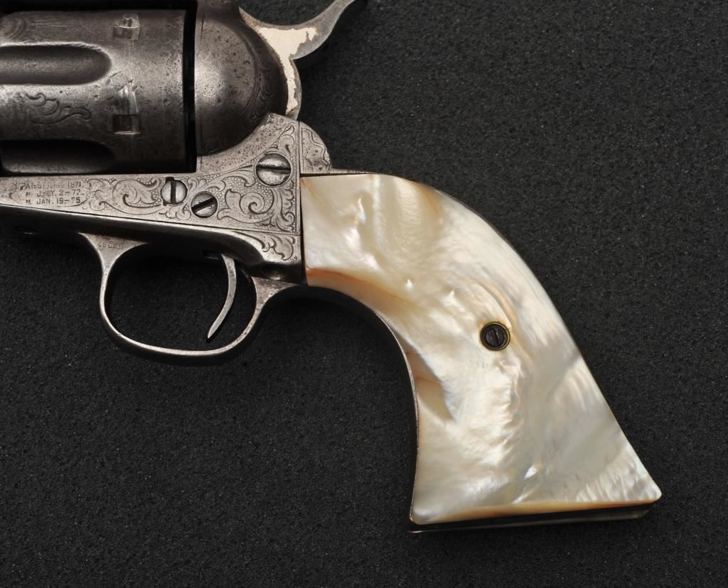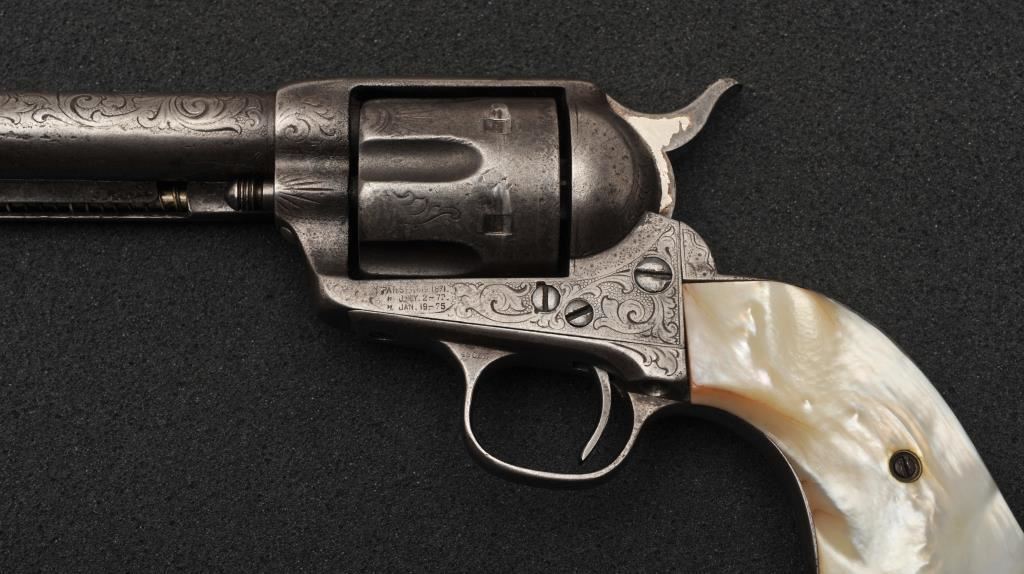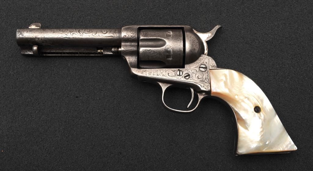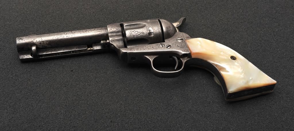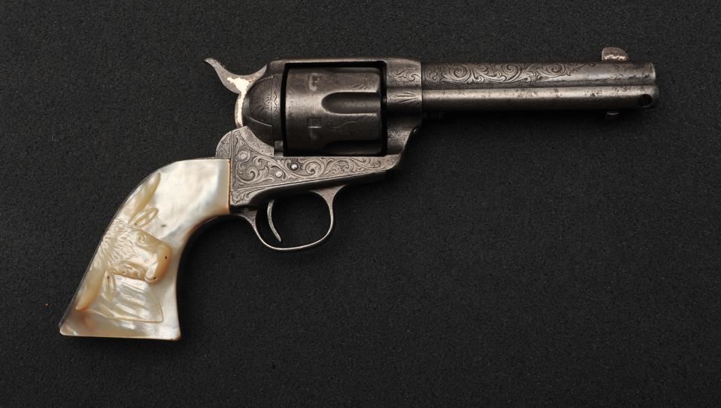 Colt Single Action Army revolver in .45 L.C. Caliber with a 4 ¾” barrel, nickel finish, carved pearl steer head grip, factory engraved, shipped to Simmons Hardware Co, St. Louis, Mo., Nov. 3, 1889, 2 guns in shipment , S/N 130729. Features verified by factory letter except the barrel length not listed and stocks listed as “Rubber”. The grips were most likely dealer supplied and of same era and are a good fit. Good metal surfaces with patina finish and some traces of nickel where protected. The markings are slightly light. The front sight has been reduced very slightly. Good action and fair bore. The grips are very good plus with high carving. A good looking and classic engraved “Black Powder” single action of frontier era. Matching numbers. (Antique) Est.: $6,000-$12,000