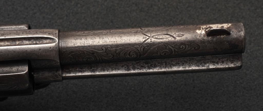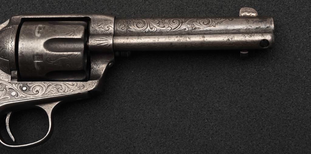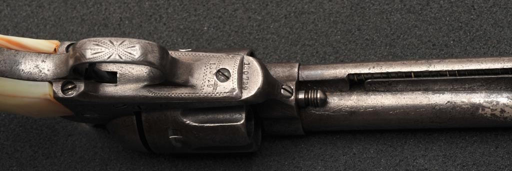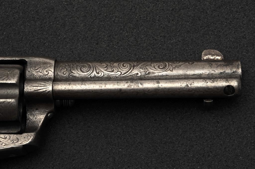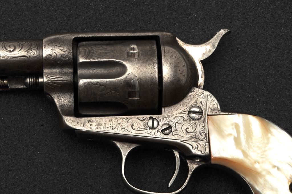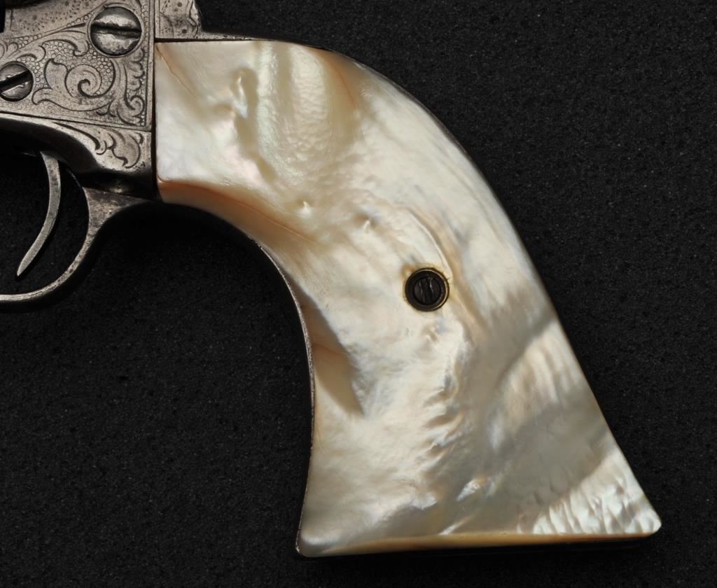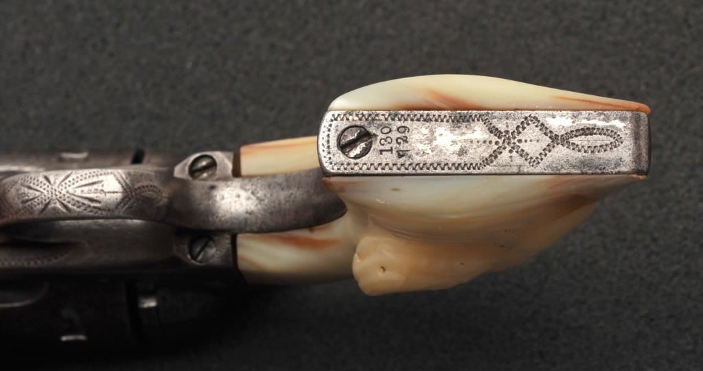 Colt Single Action Army revolver in .45 L.C. Caliber with a 4 ¾” barrel, nickel finish, carved pearl steer head grip, factory engraved, shipped to Simmons Hardware Co, St. Louis, Mo., Nov. 3, 1889, 2 guns in shipment , S/N 130729. Features verified by factory letter except the barrel length not listed and stocks listed as “Rubber”. The grips were most likely dealer supplied and of same era and are a good fit. Good metal surfaces with patina finish and some traces of nickel where protected. The markings are slightly light. The front sight has been reduced very slightly. Good action and fair bore. The grips are very good plus with high carving. A good looking and classic engraved “Black Powder” single action of frontier era. Matching numbers. (Antique) Est.: $6,000-$12,000