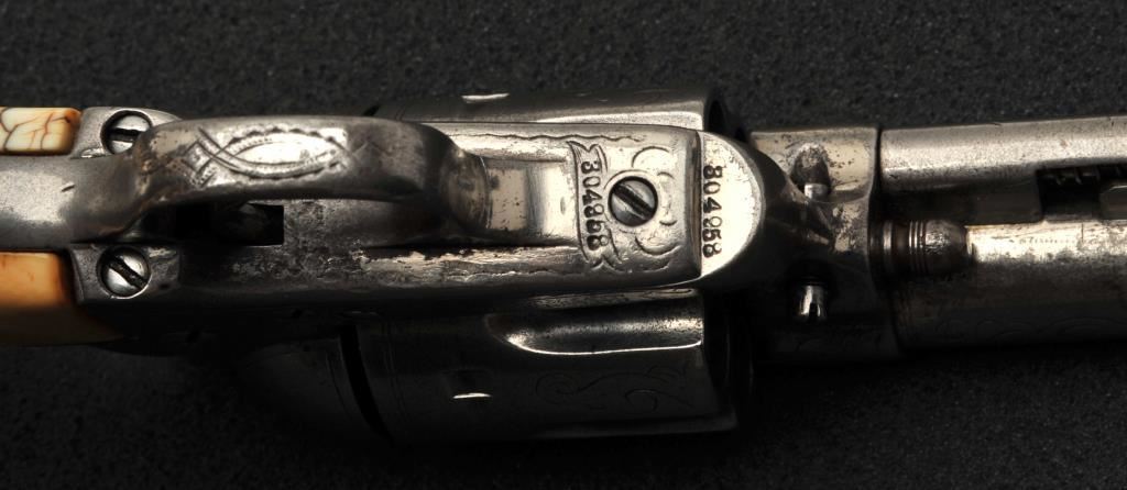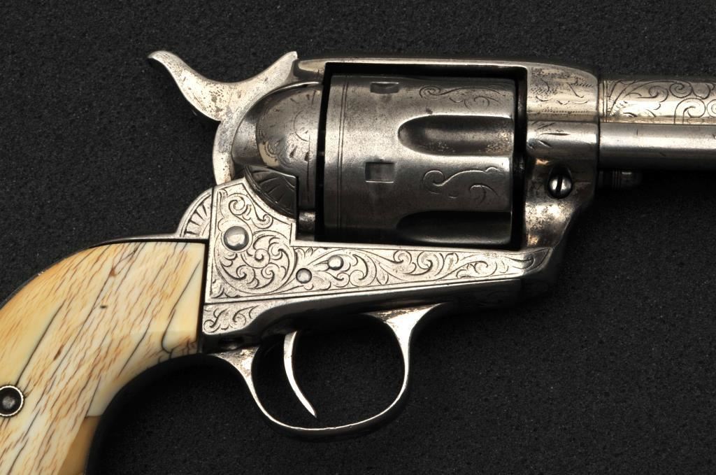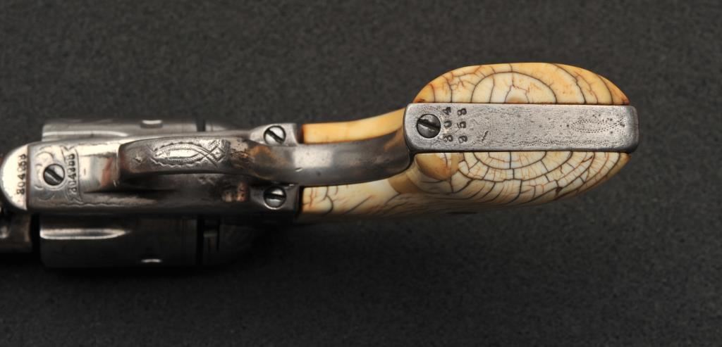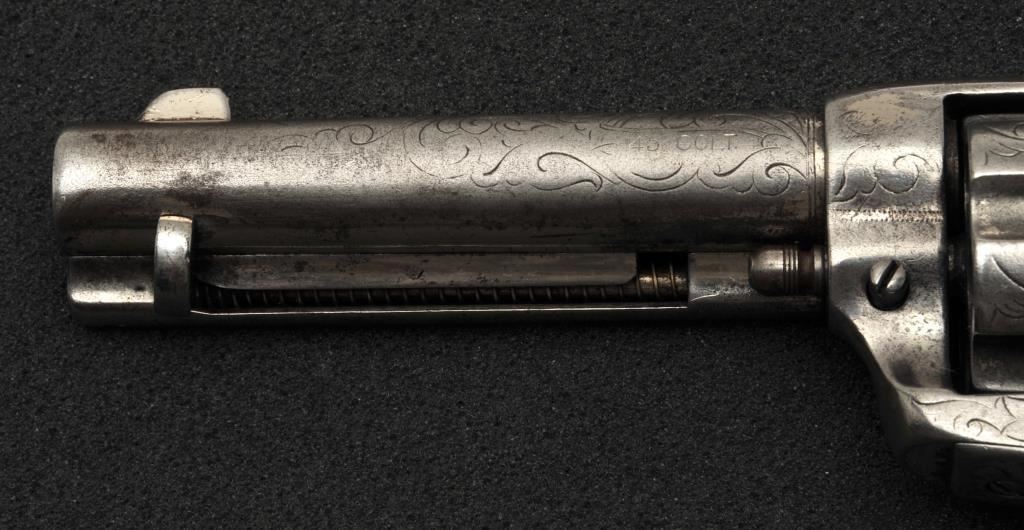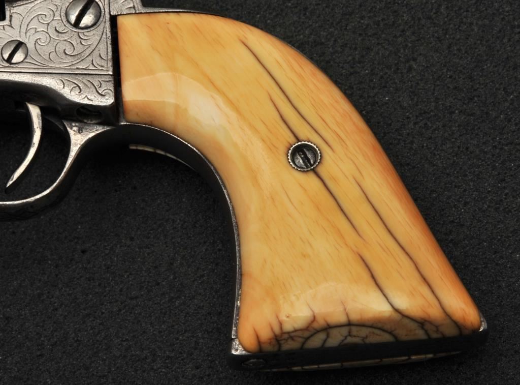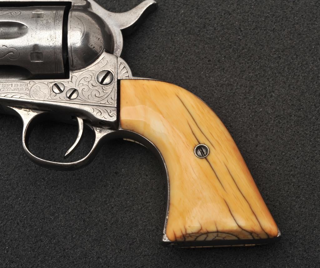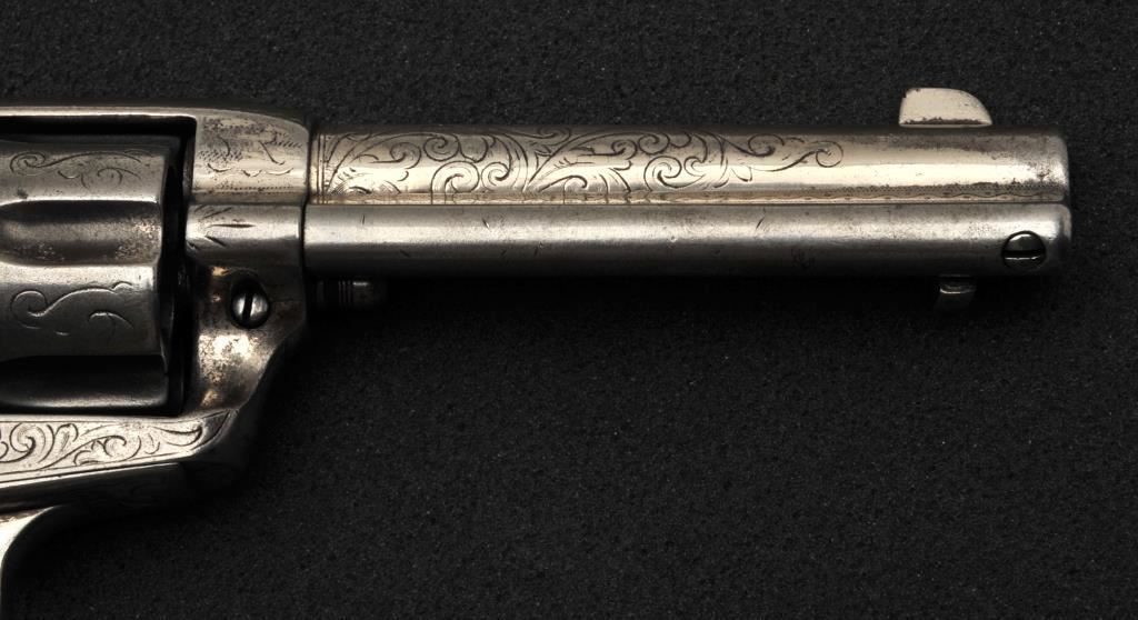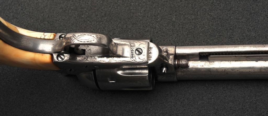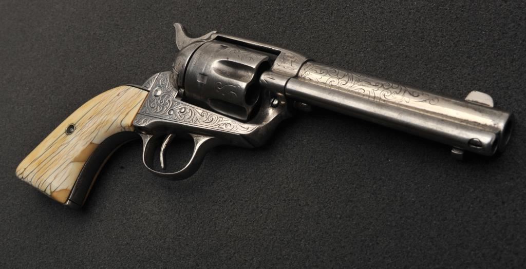 Colt Single Action Army revolver in .45 Colt caliber with a 4 ½” barrel, silver finish, ivory grips, factory engraved, Shipped to Norvell Shapleigh Hardware Co, St. Louis, Missouri, Dec. 22, 1908, 1 gun in shipment. Features verified by factory letter except stocks “Not listed”. Good traces of silver with natural patina and good markings that are only slightly light. The grips are cracked and aged with repairs and are undersized but of same era. The front sight has been slimmed and is reduced in height. All matching numbers. The bore is fair and the action is a bit “Loose”. Silver finish is desirable and a 1 gun in shipment denotes special order and perhaps recorded in newly discovered ledgers. (C&R/No PPT) Est.: $5,000-$10,000