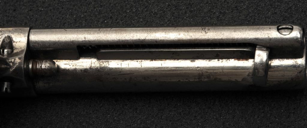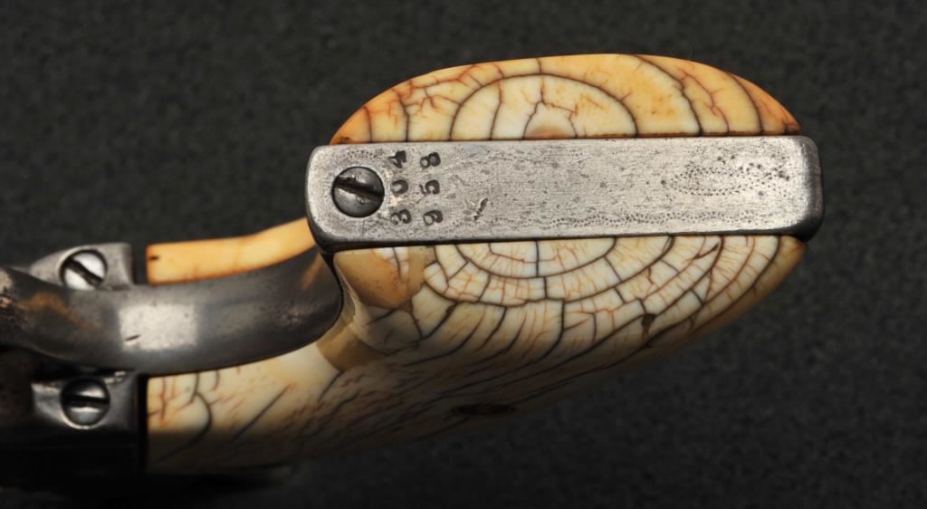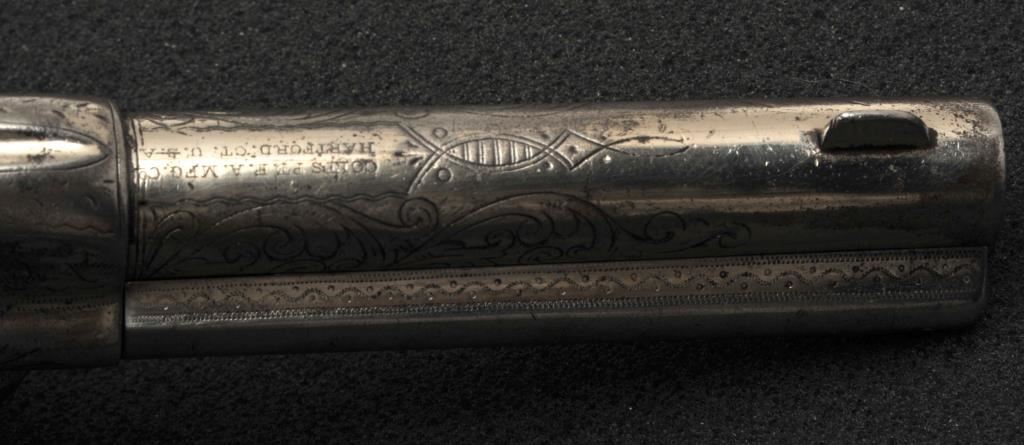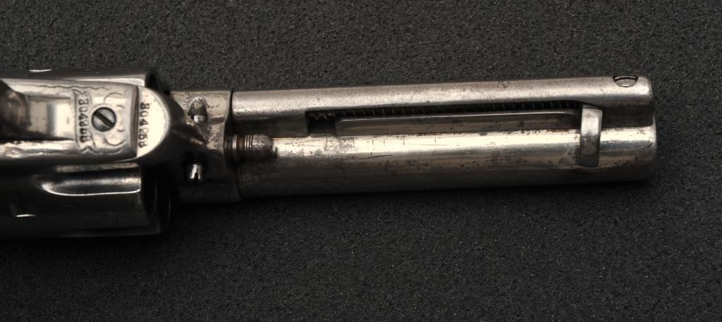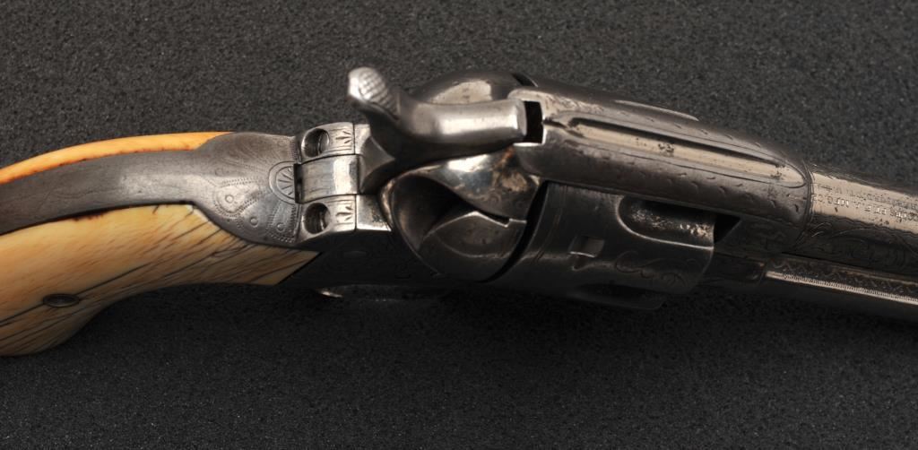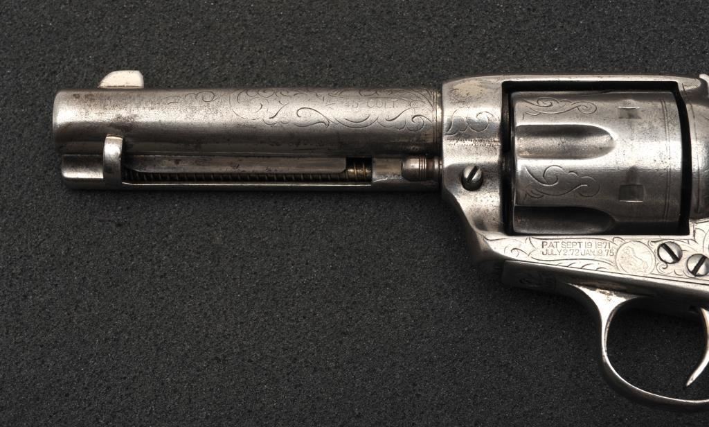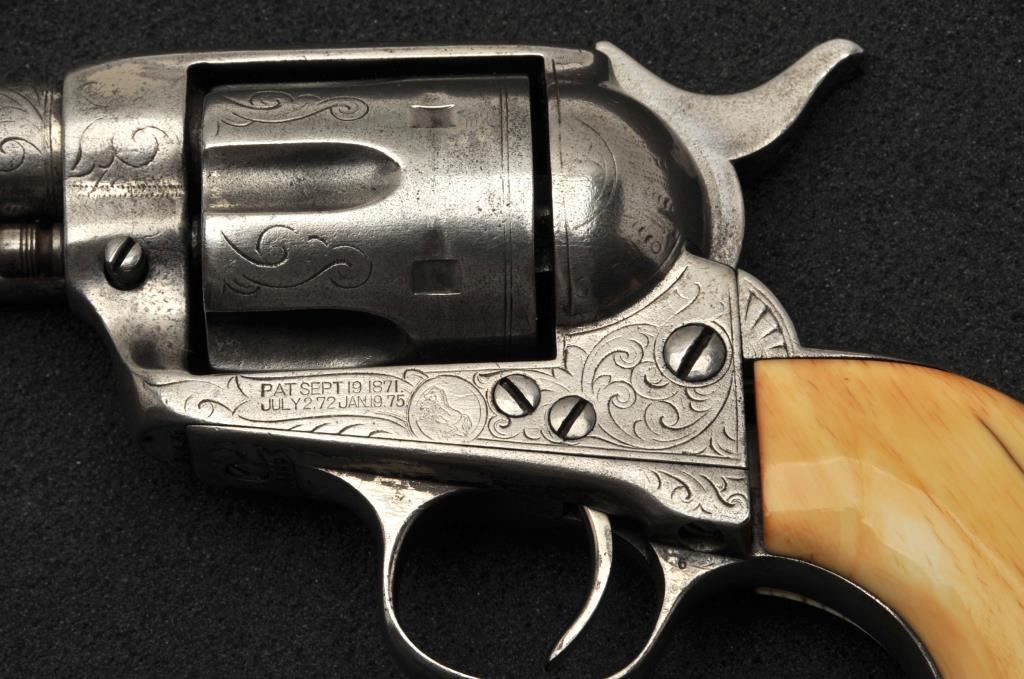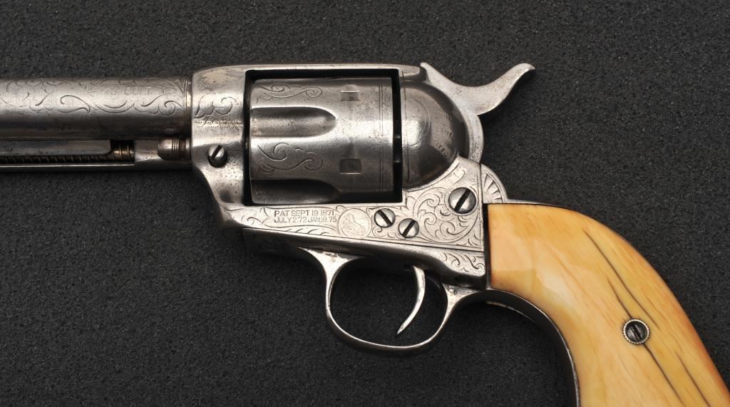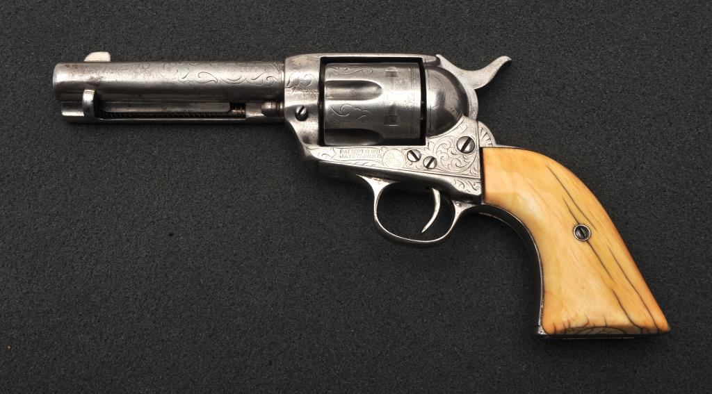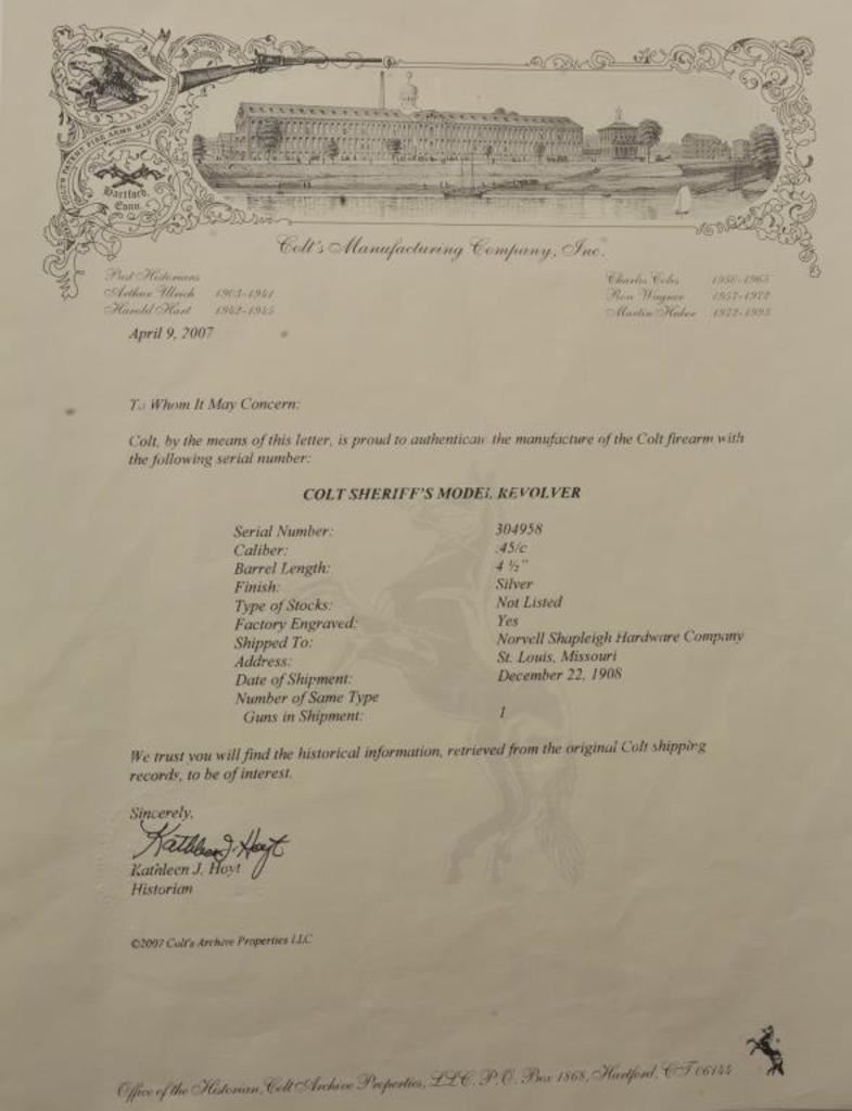 Colt Single Action Army revolver in .45 Colt caliber with a 4 ½” barrel, silver finish, ivory grips, factory engraved, Shipped to Norvell Shapleigh Hardware Co, St. Louis, Missouri, Dec. 22, 1908, 1 gun in shipment. Features verified by factory letter except stocks “Not listed”. Good traces of silver with natural patina and good markings that are only slightly light. The grips are cracked and aged with repairs and are undersized but of same era. The front sight has been slimmed and is reduced in height. All matching numbers. The bore is fair and the action is a bit “Loose”. Silver finish is desirable and a 1 gun in shipment denotes special order and perhaps recorded in newly discovered ledgers. (C&R/No PPT) Est.: $5,000-$10,000