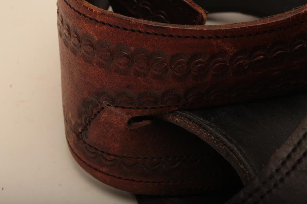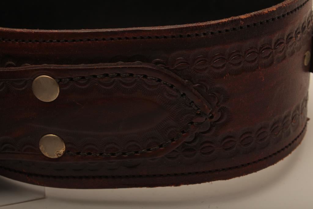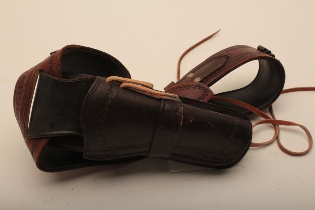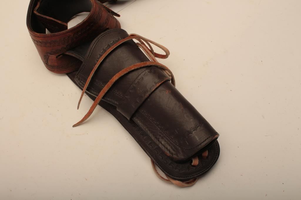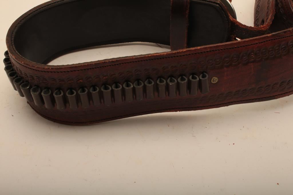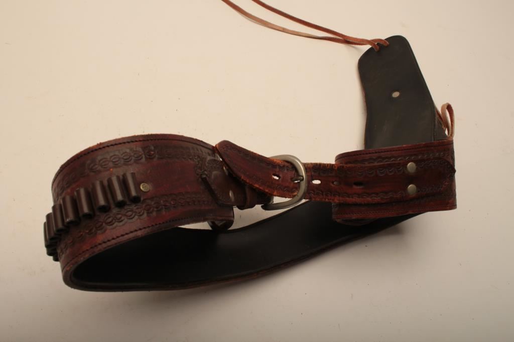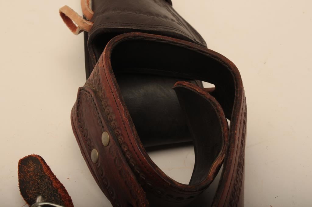 Tooled leather cardrige belt and holster for .22 revolver, size small, circa 1950's in good condition. Est. $40-80