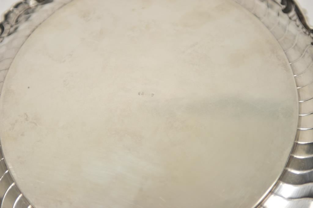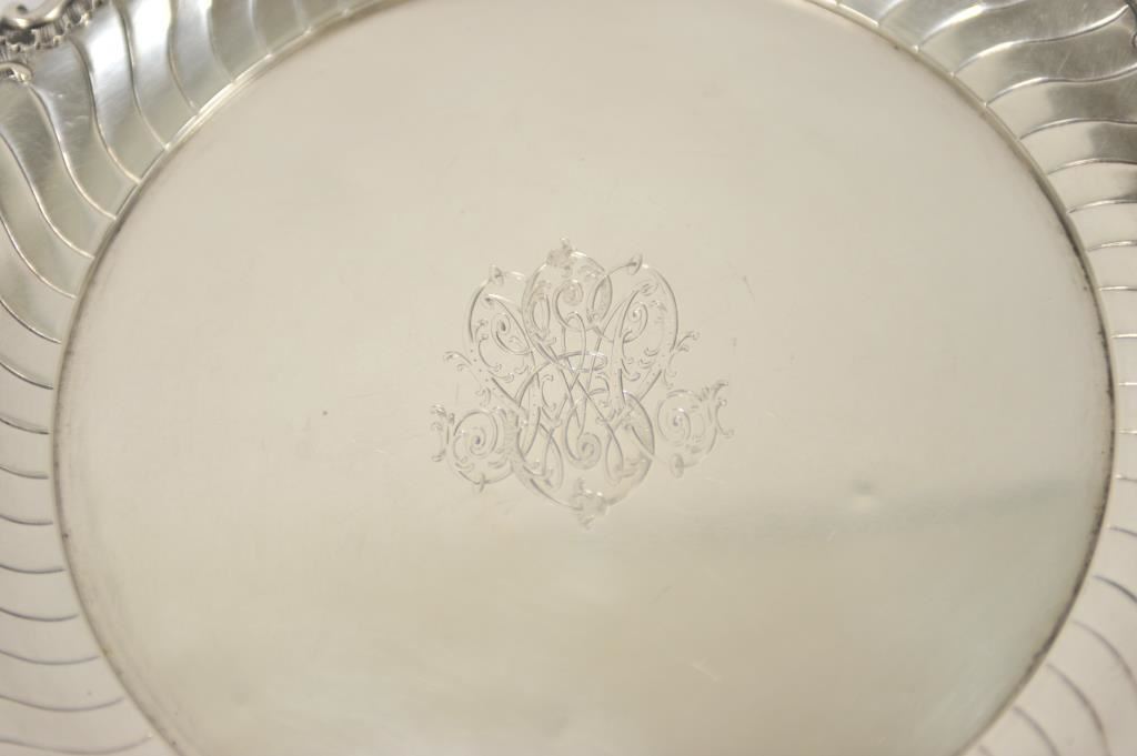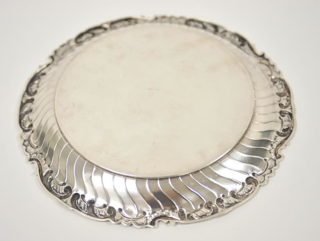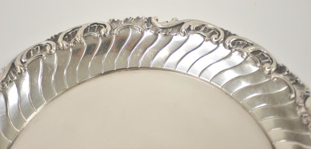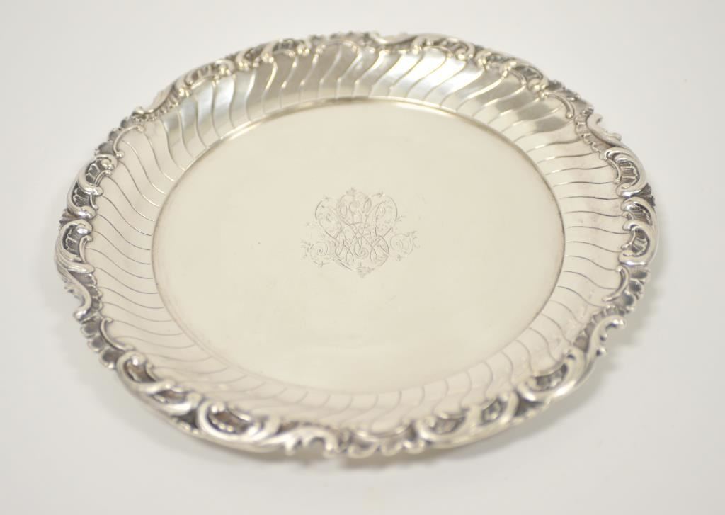 A beautiful antique German silver salver well marked cast and chased. Likely 19th century. Weight 21 ounces and 12.5 inches in diameter, scrap price $225. Est.: $250-$350