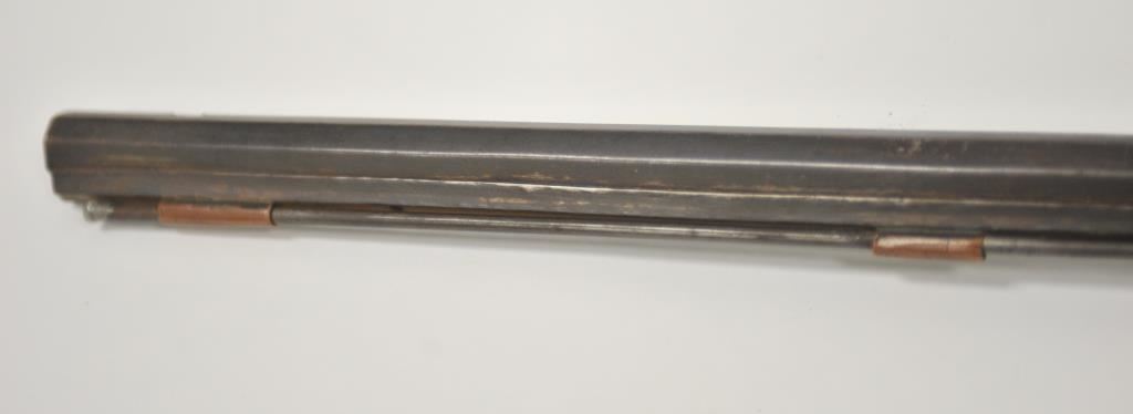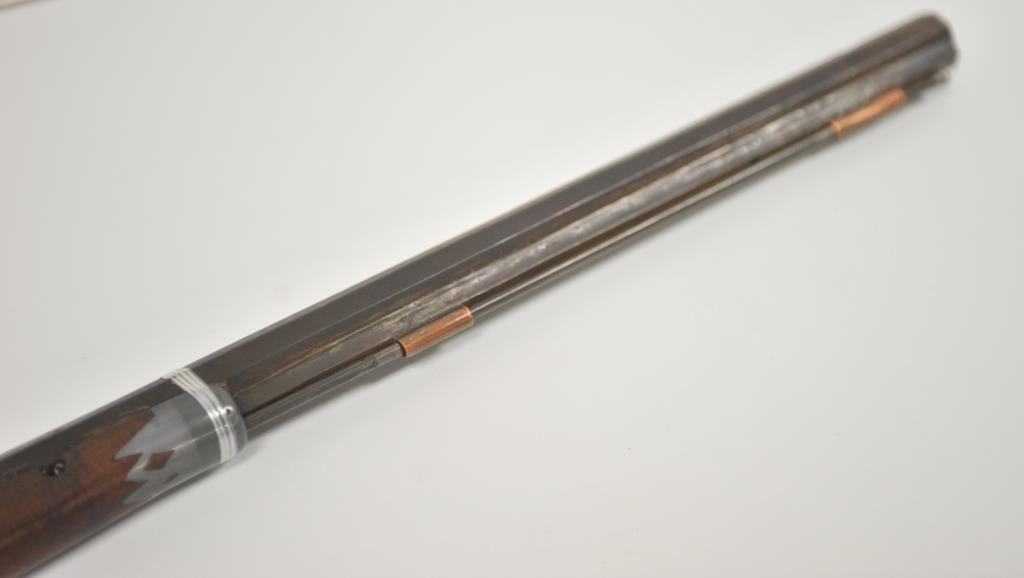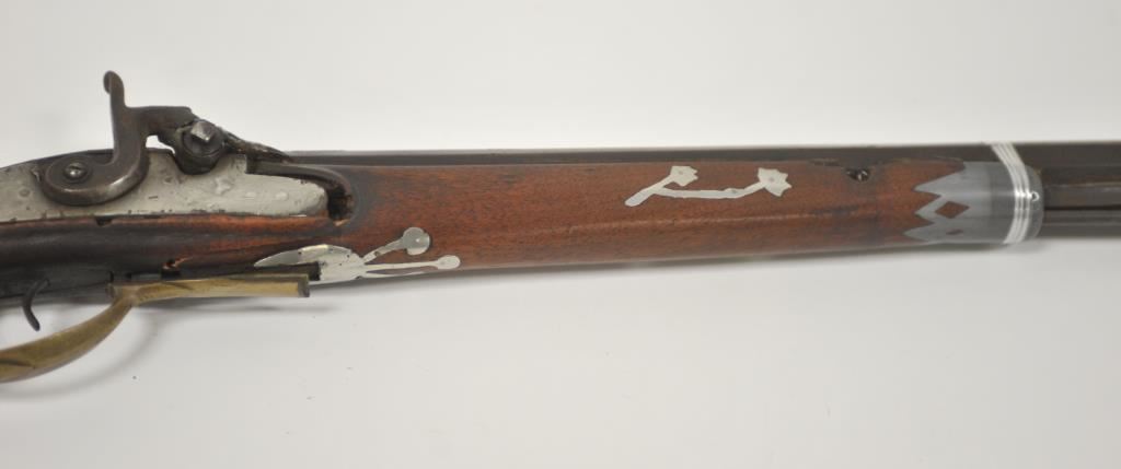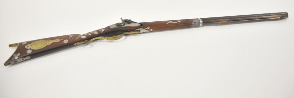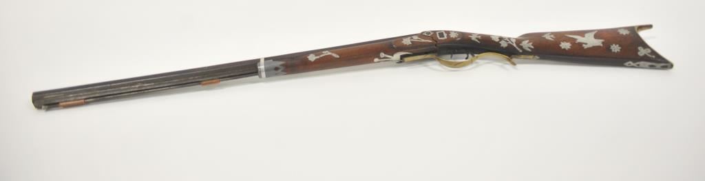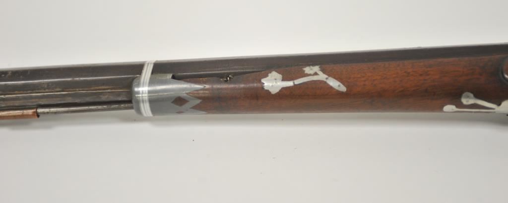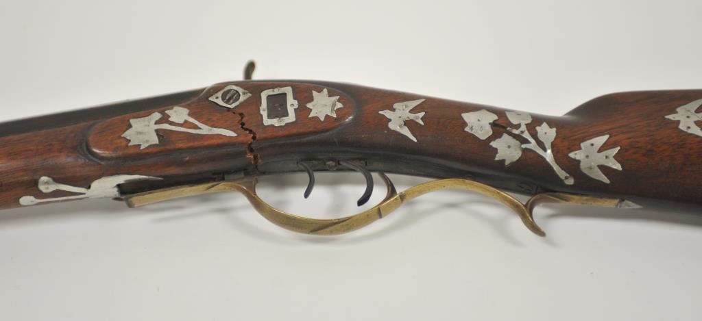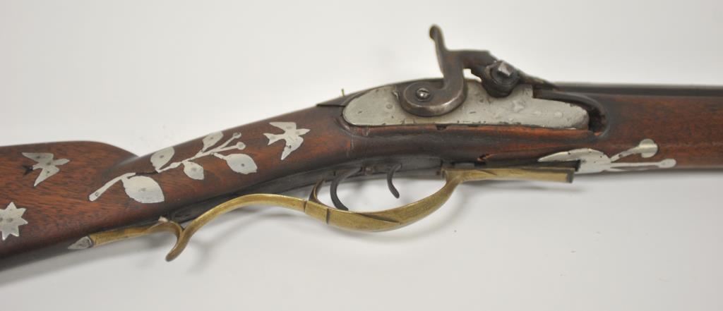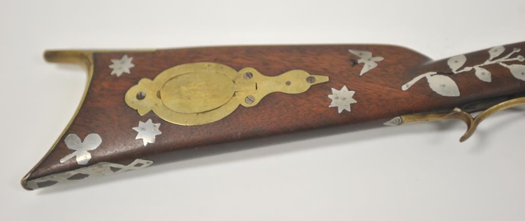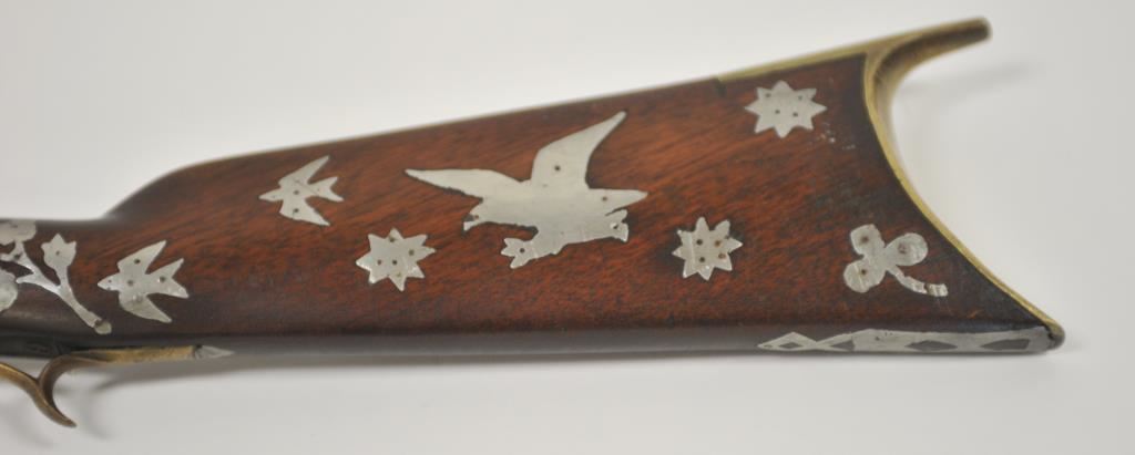 Elaborate silver inlaid half stock percussion ‘Kentucky’ style rifle with brass patchbox, octagonal barrel, and more than 20 silver inlays in the stock including stars, eagle, flowers, and vines. The lock plate is overlaid with silver. Barrel is deep age brown, stock with losses where barrel was keyed to fore-stock, nipple is missing otherwise good overall. A really attractive and unusual mid-19th century American rifle. Est.: $300-$600